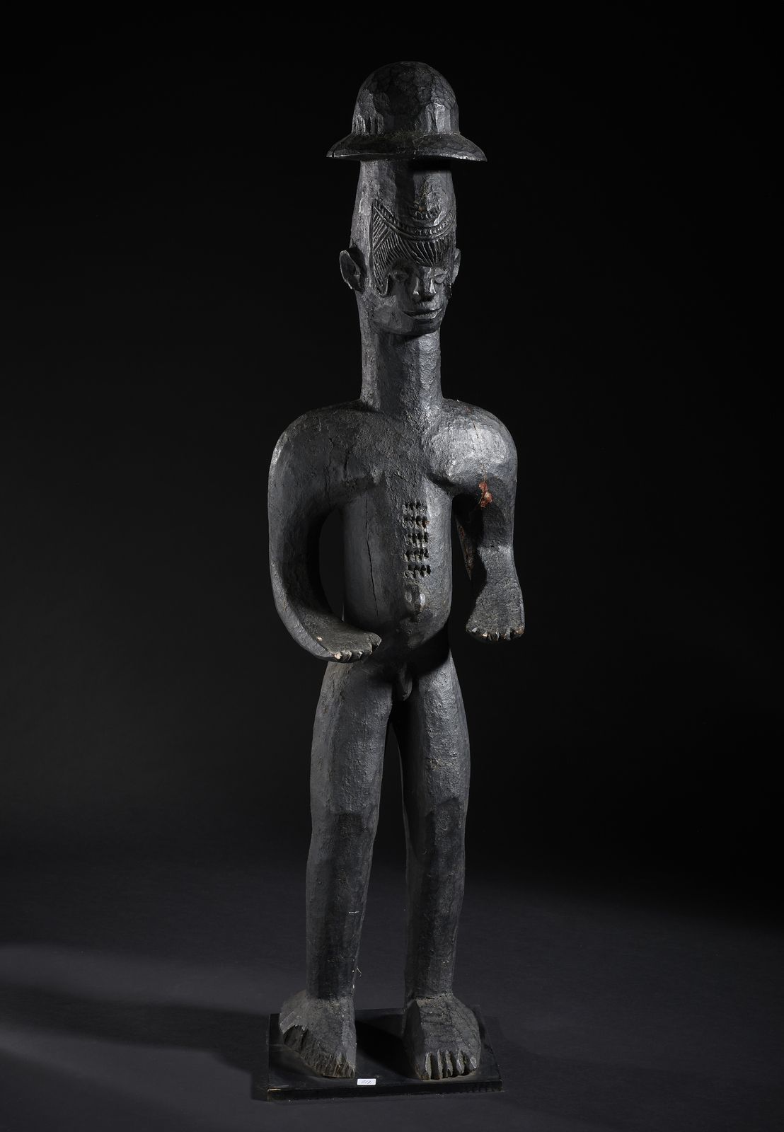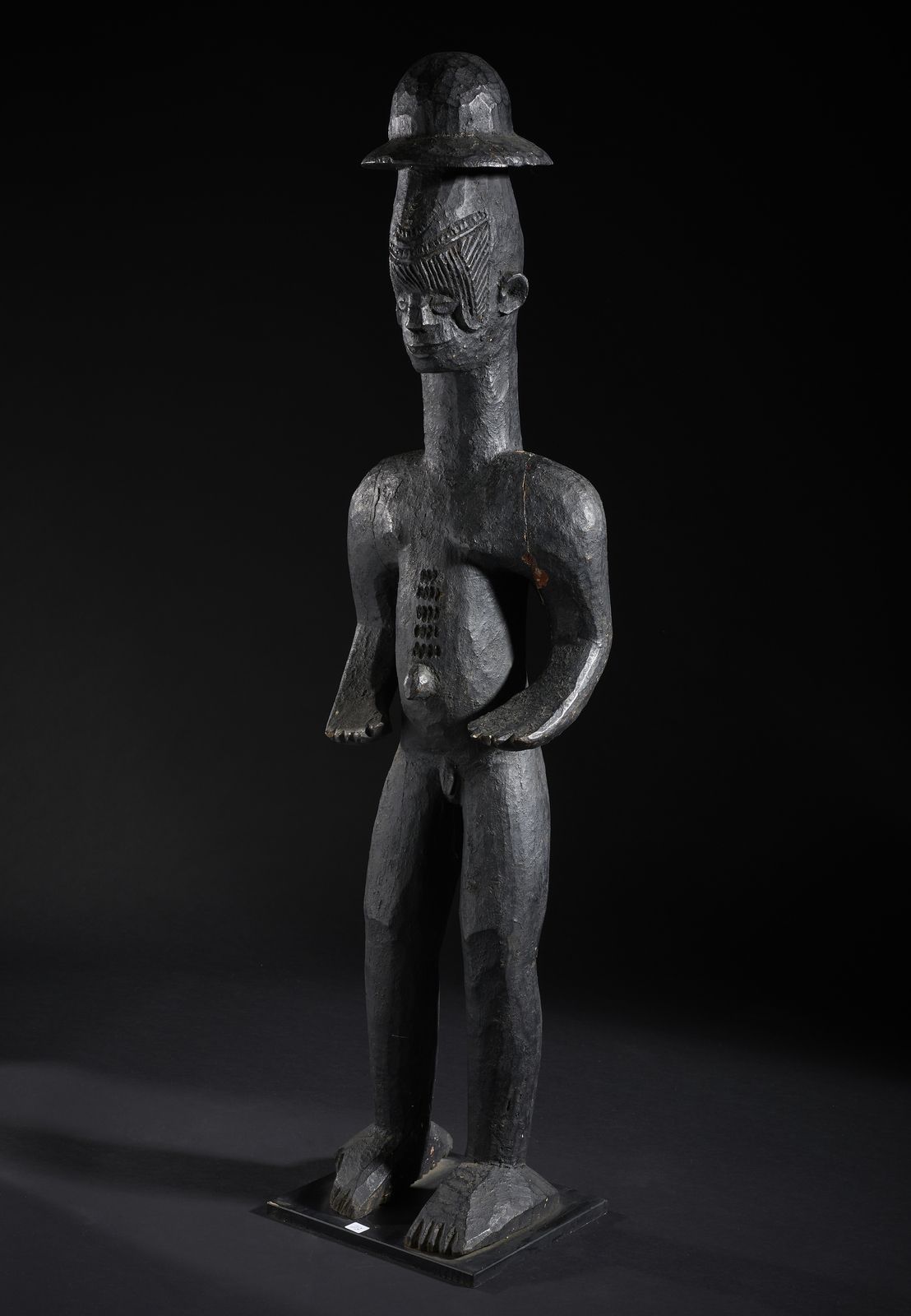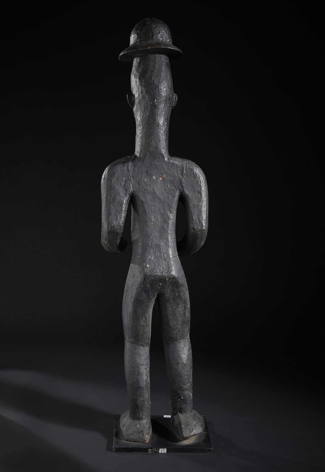 Grande scultura antropomorfa con cappello. Legno duro a patina nera.