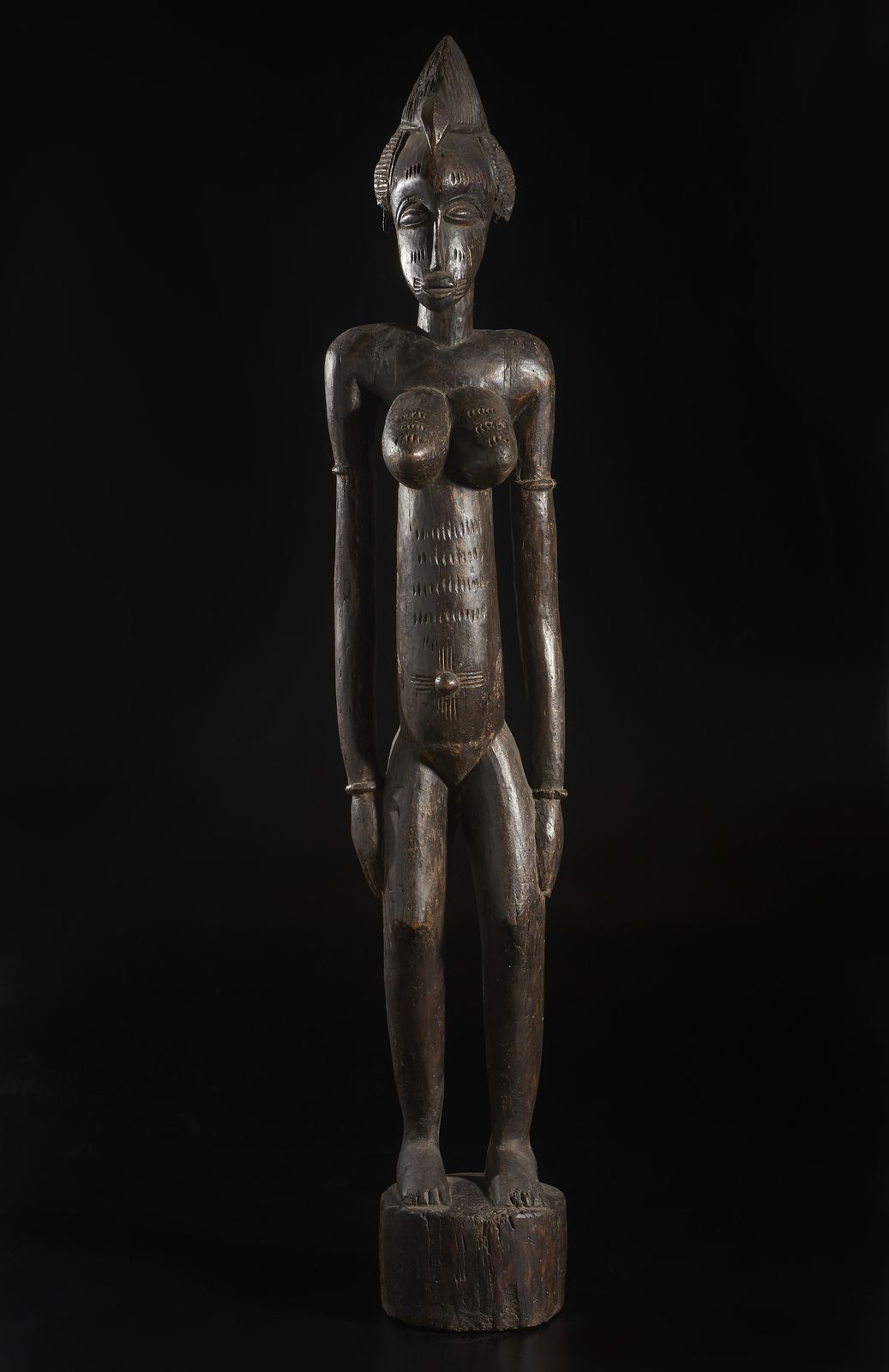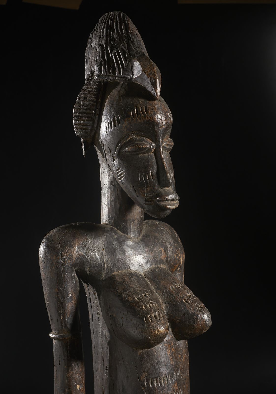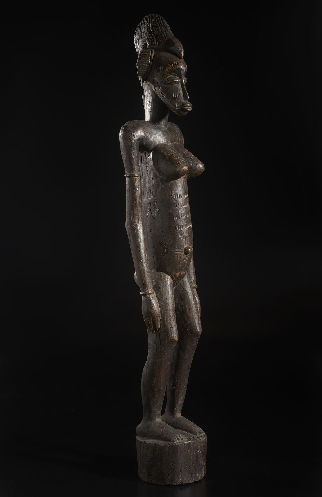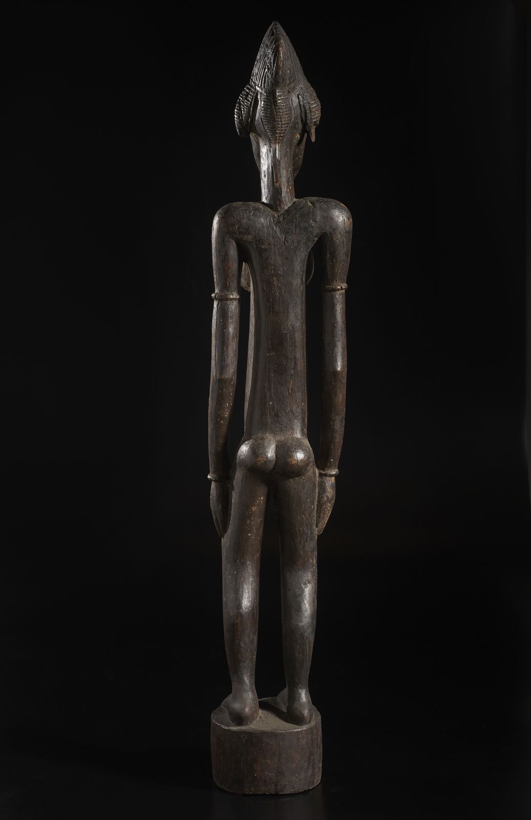Grande scultura antropomorfa femminile. Legno duro a patina scura.