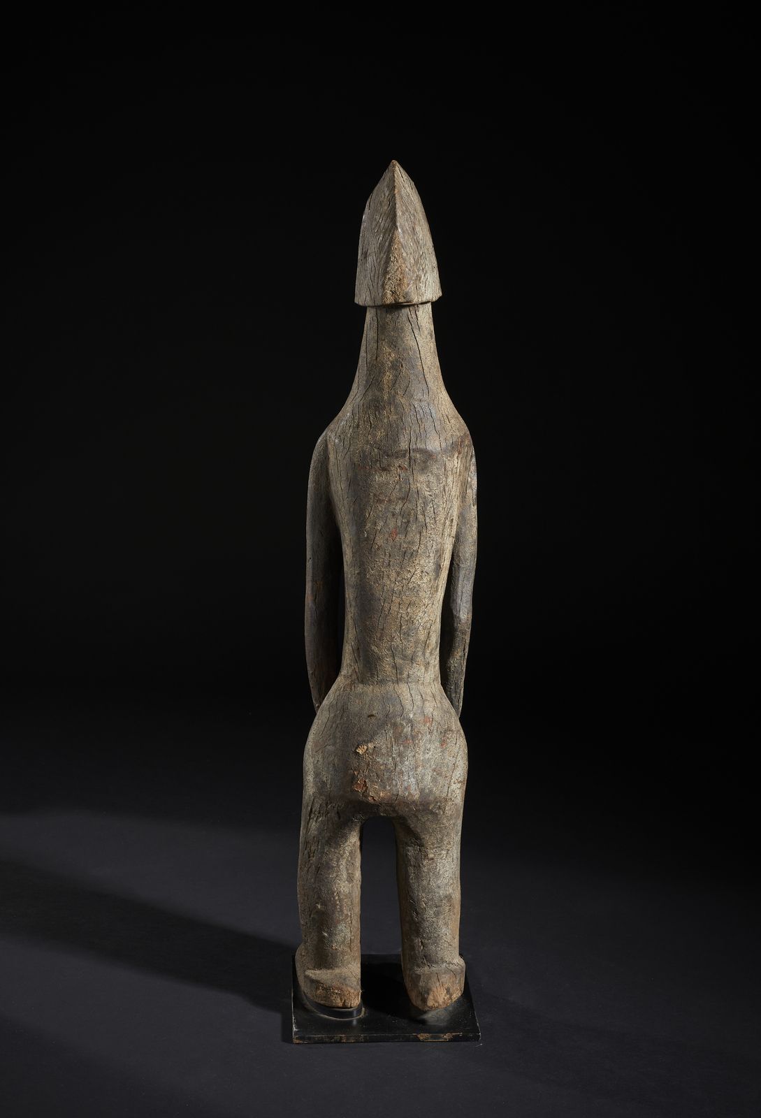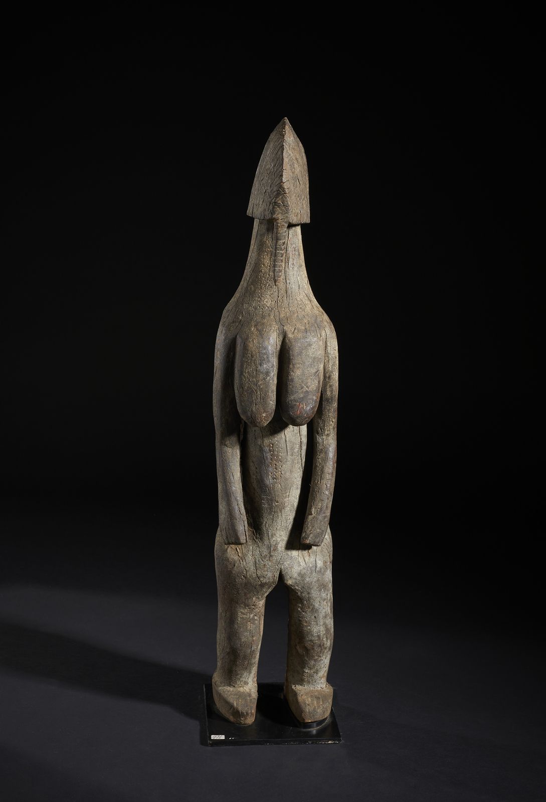 Grande scultura antropomorfa stilizzata. Legno duro a patina bruno-grigiastra.