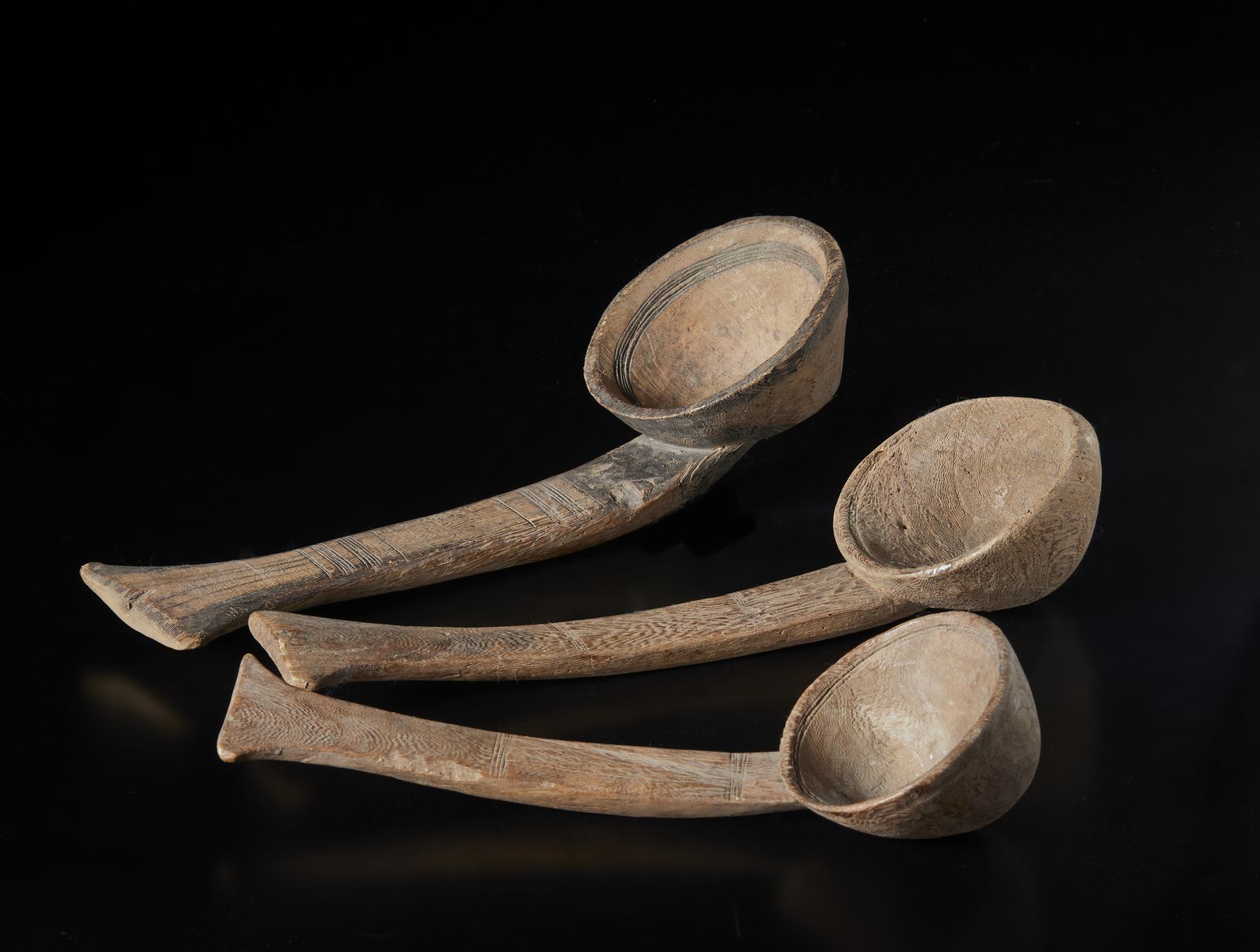 Lotto composto da tre mestoli decorati con incisioni geometriche. Legno duro a patina [..]