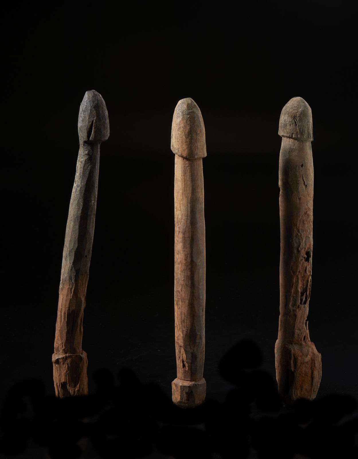 Lotto composto da tre sculture in forma di fallo.Legno con differenti patine.