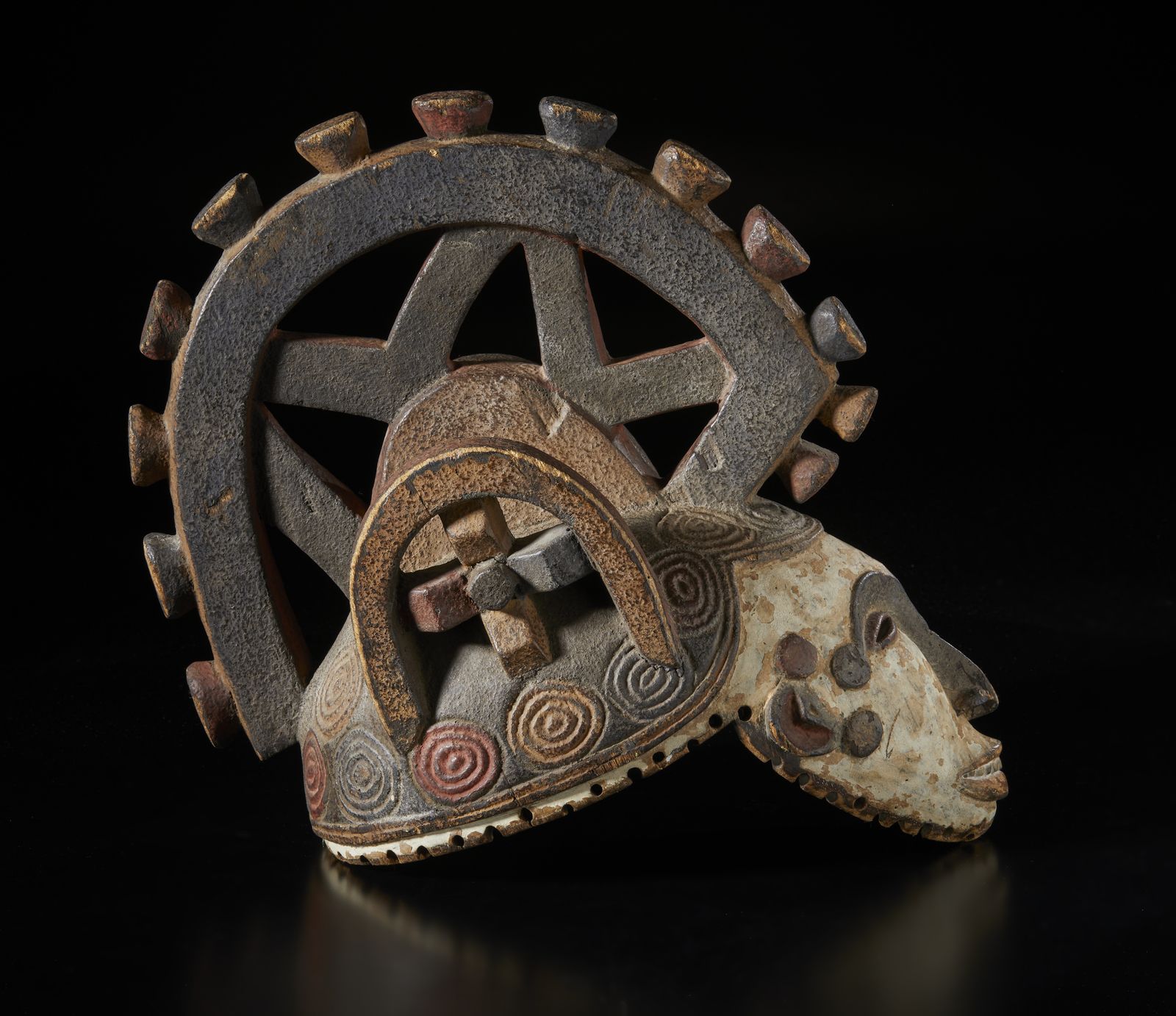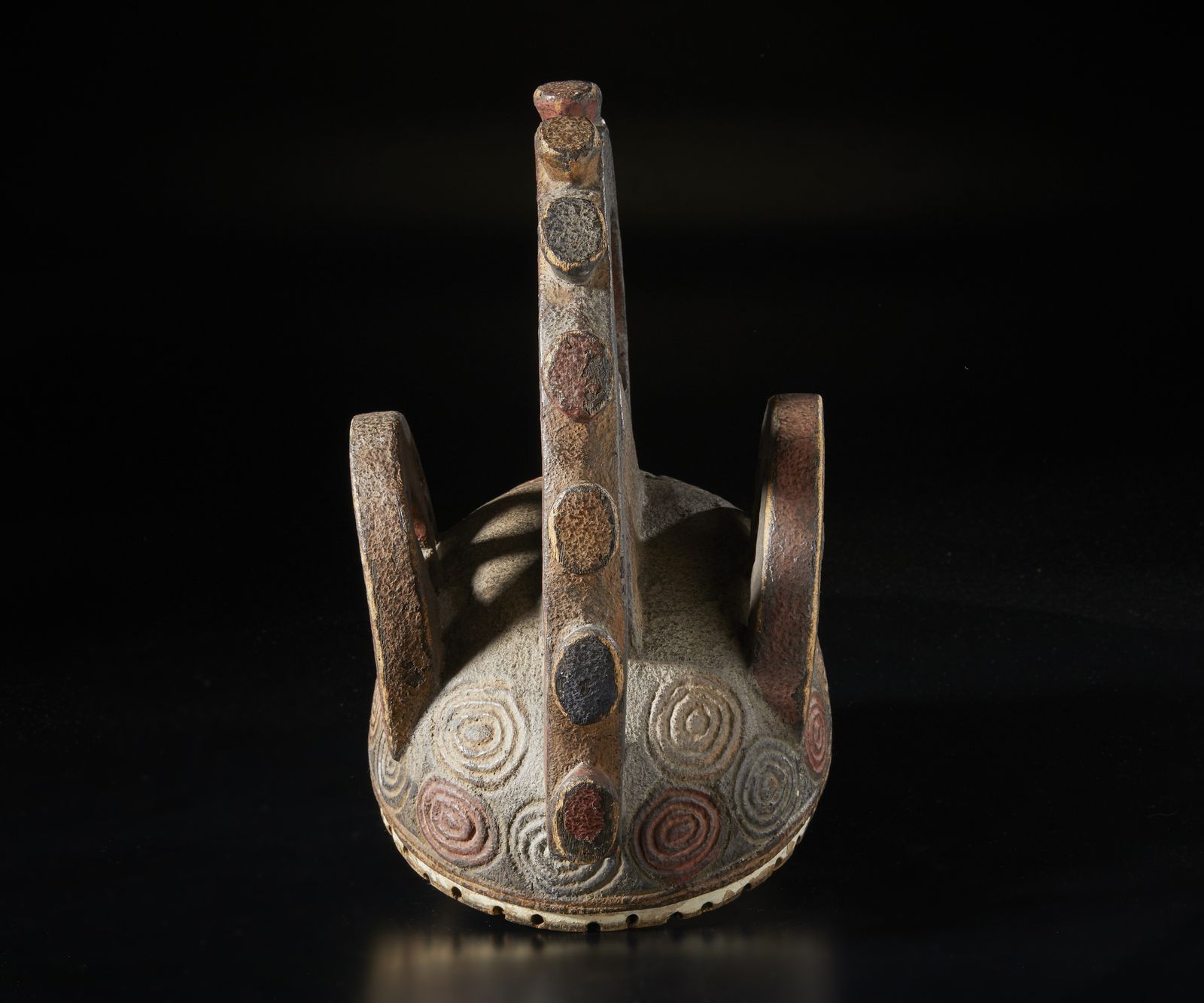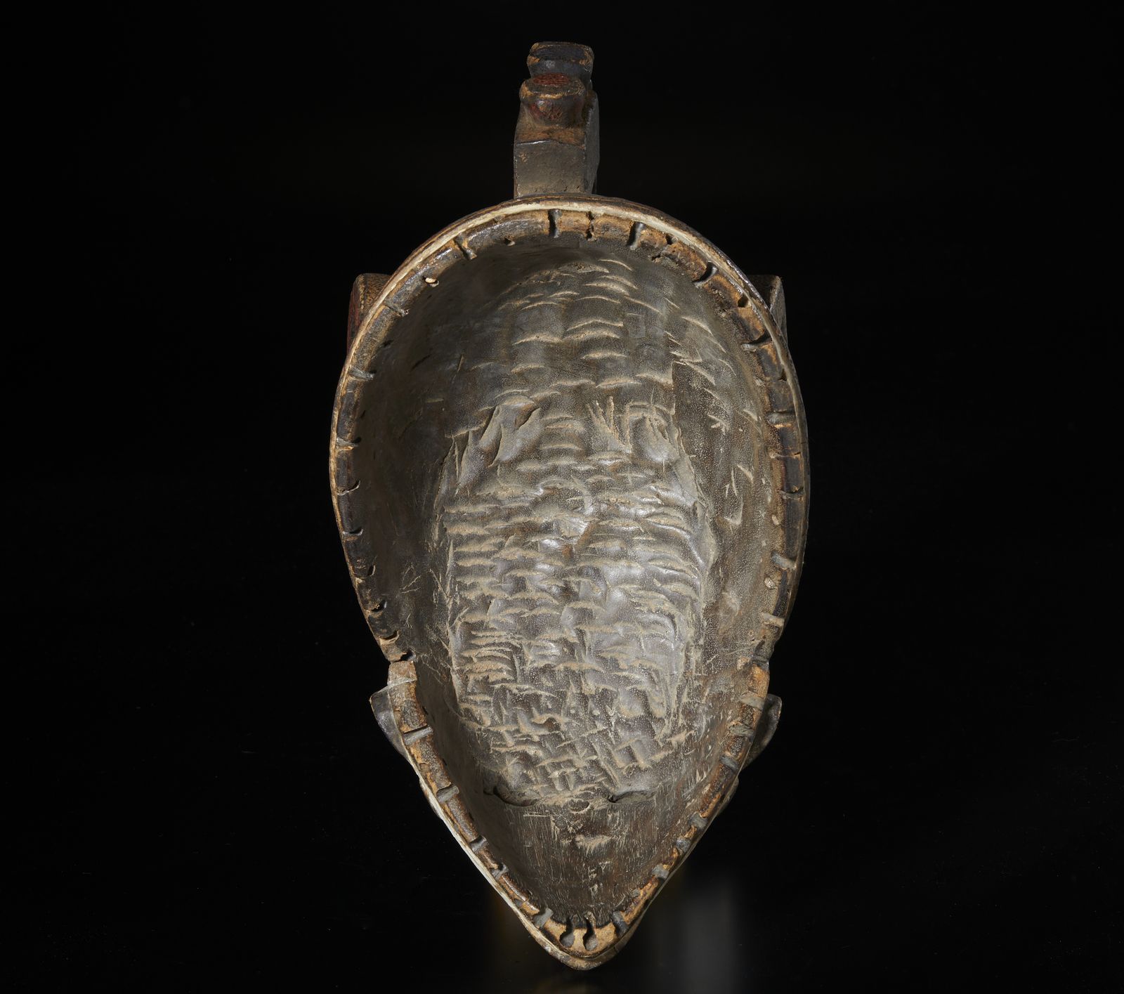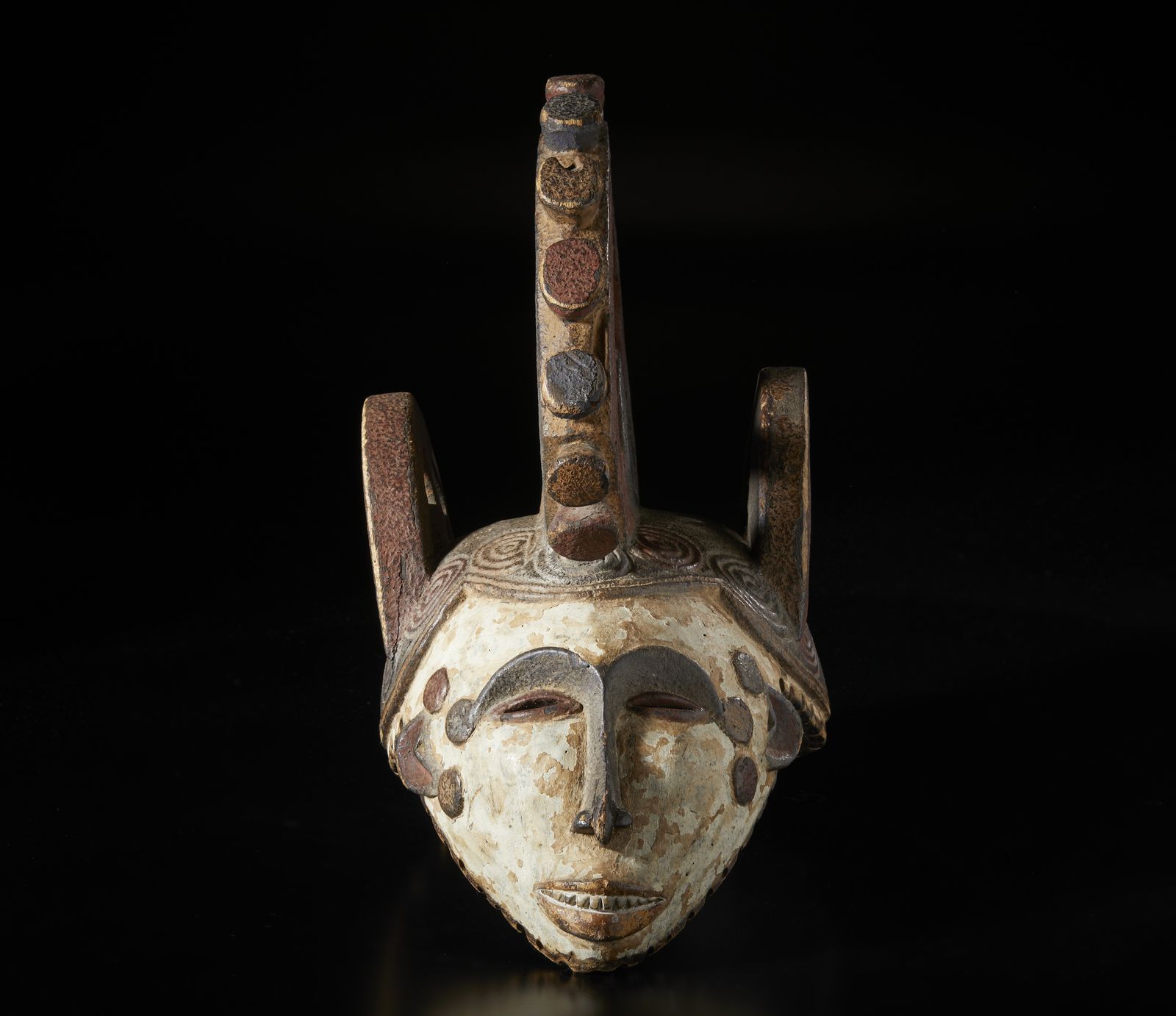 Maschera antropomorfa con elaborata acconciatura. Legno, caolino e pigmenti.