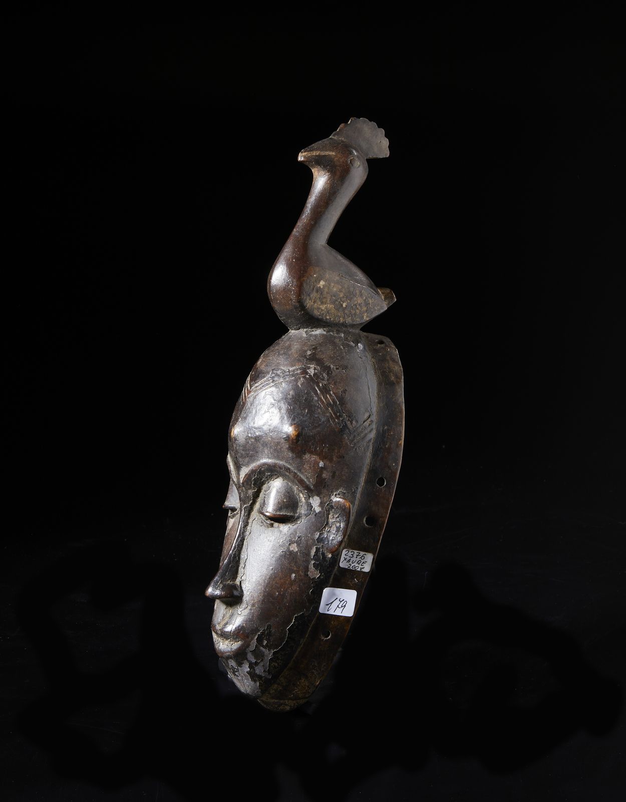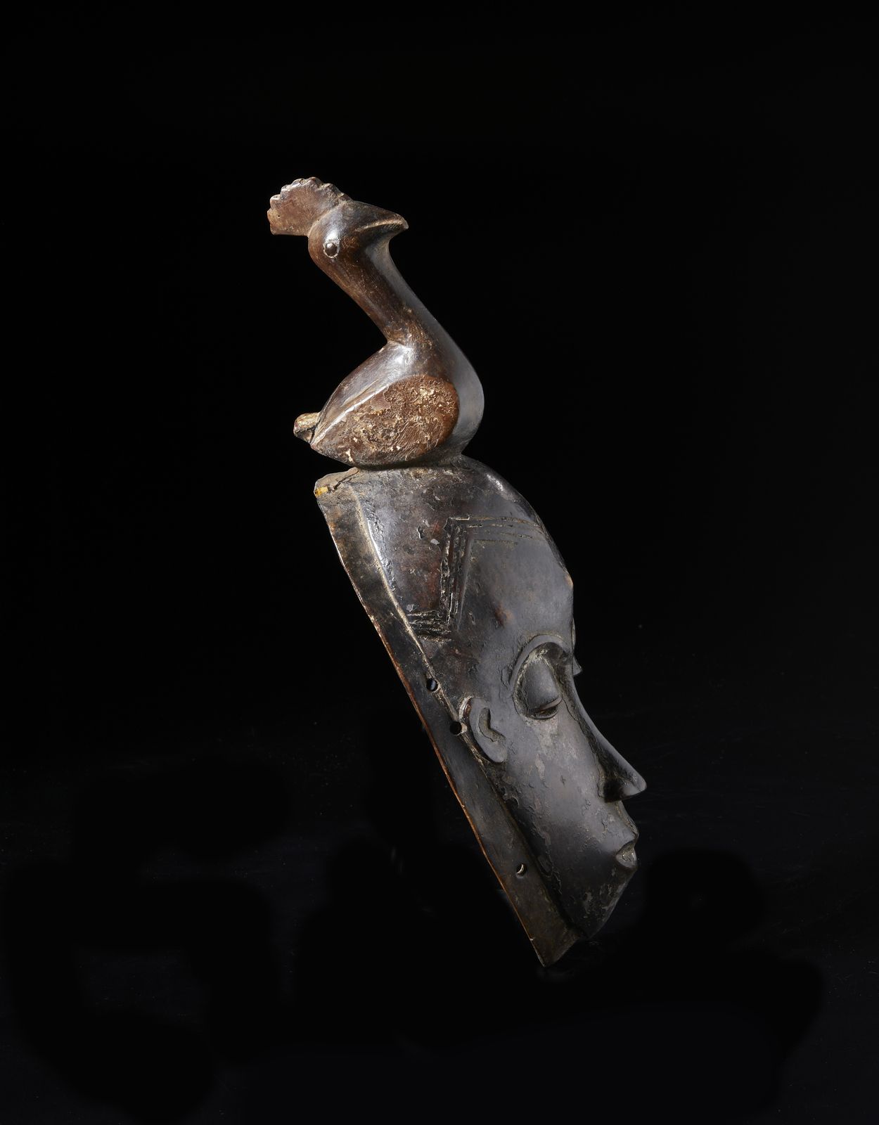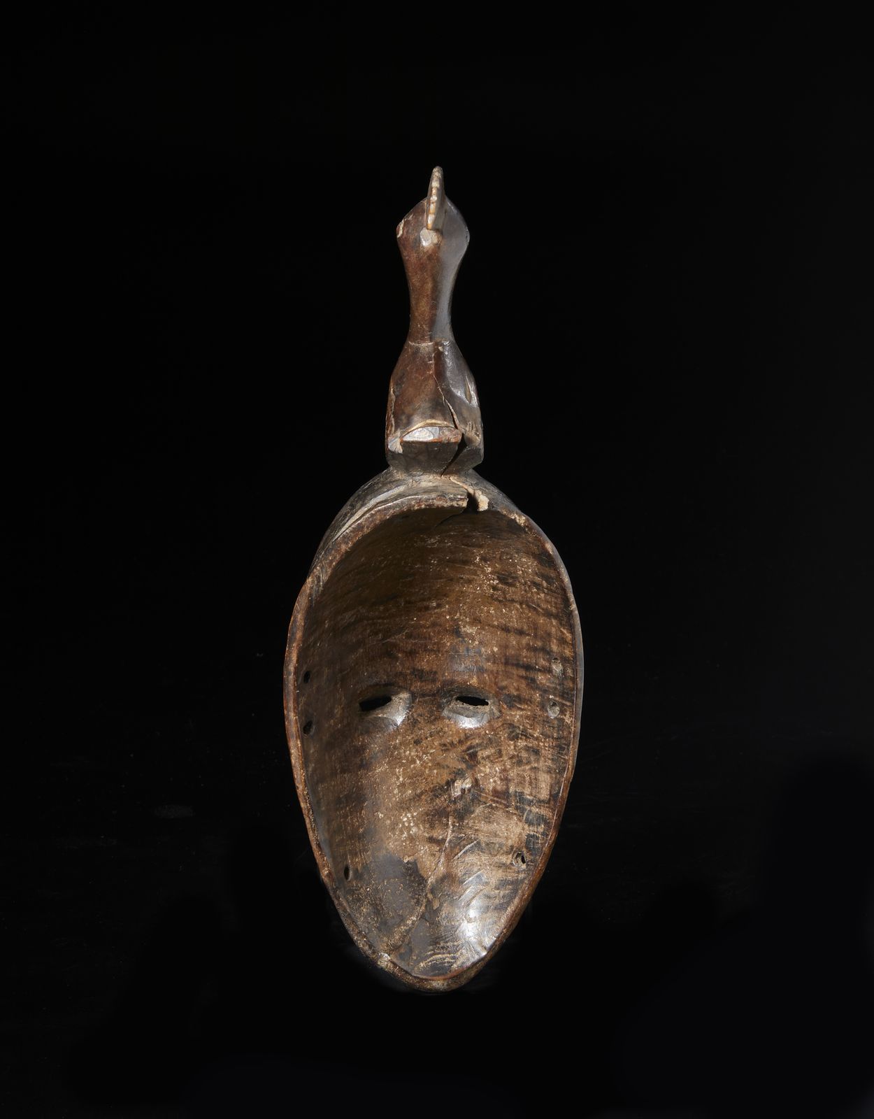 Maschera antropomorfa con uccello scolpito nella parte sommitale. Legno duro a patina [..]
