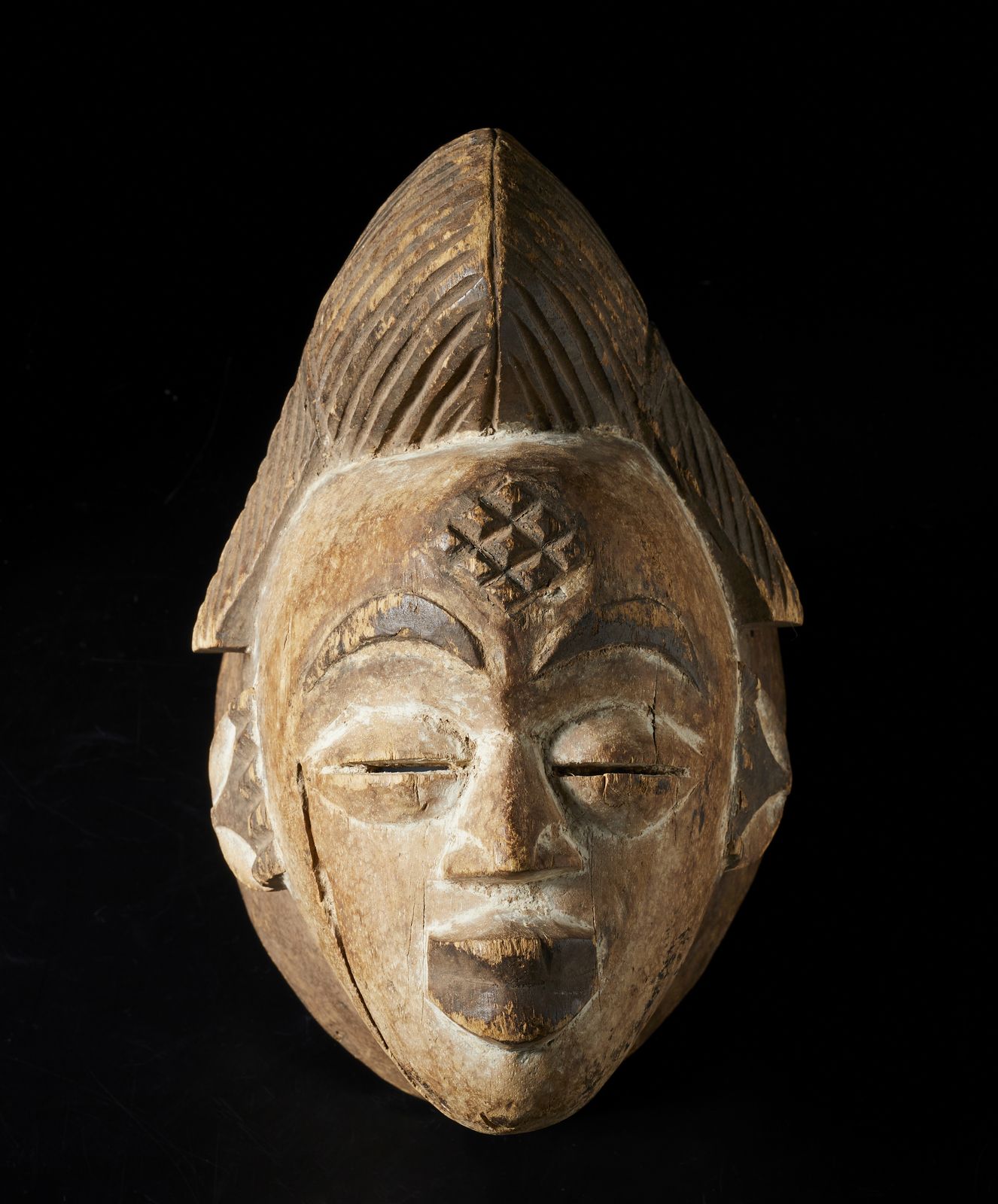 Maschera antropomorfa femminile. Legno, caolino e pigmenti.