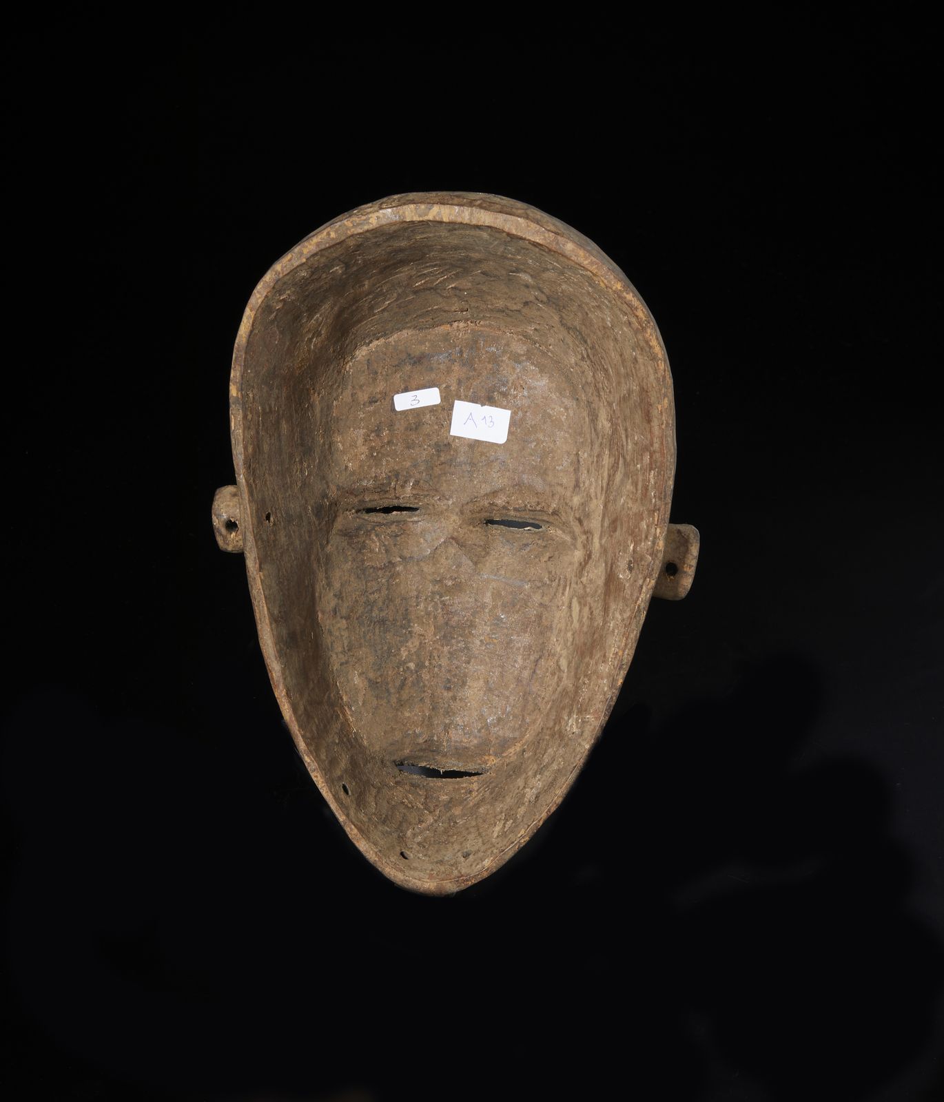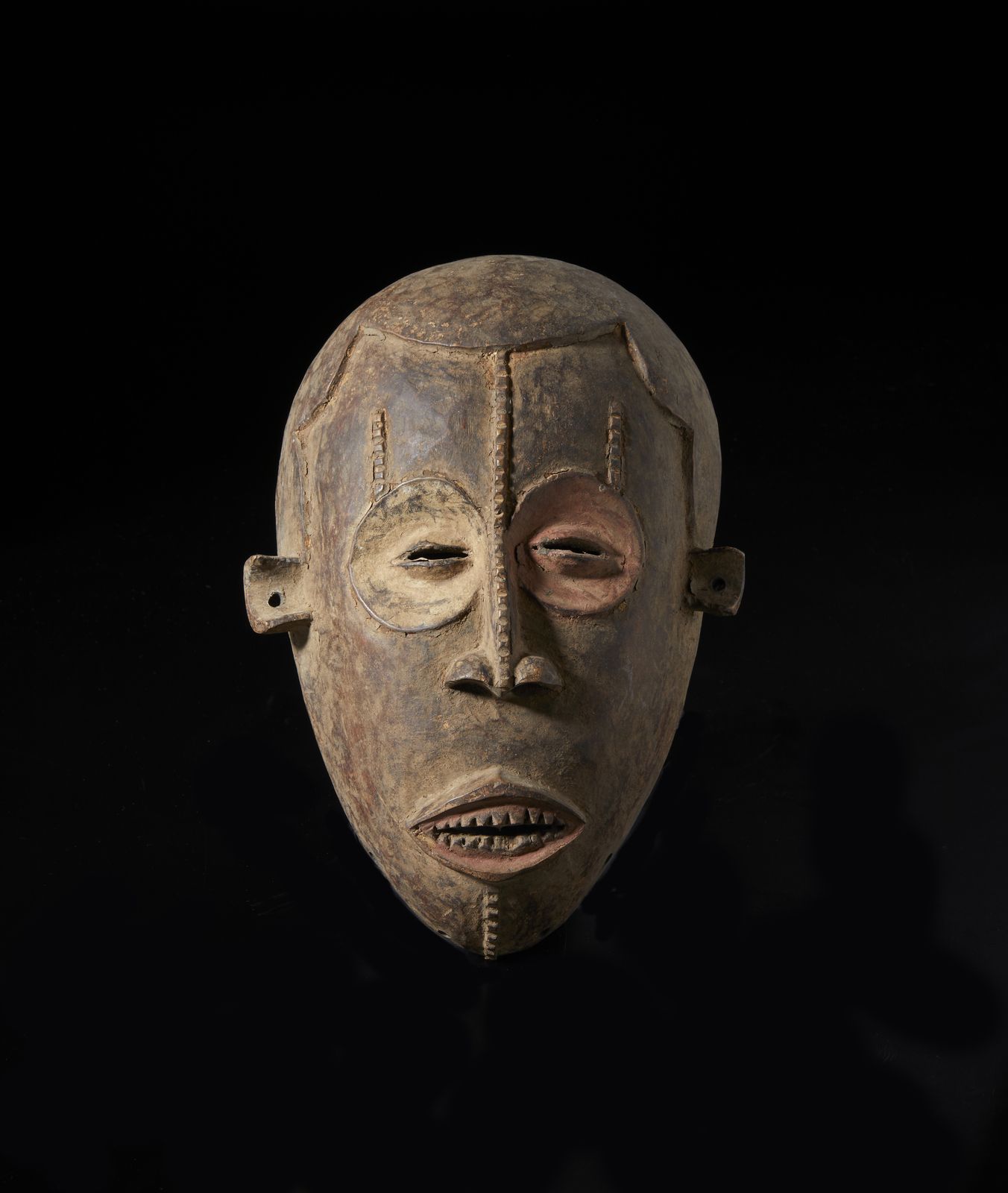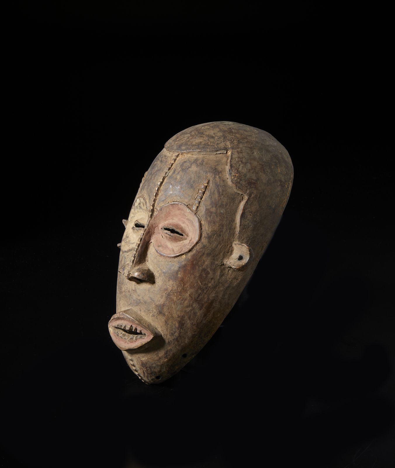 Maschera antropomorfa. Legno a patina bruna, caolino e tracce di pigmenti.