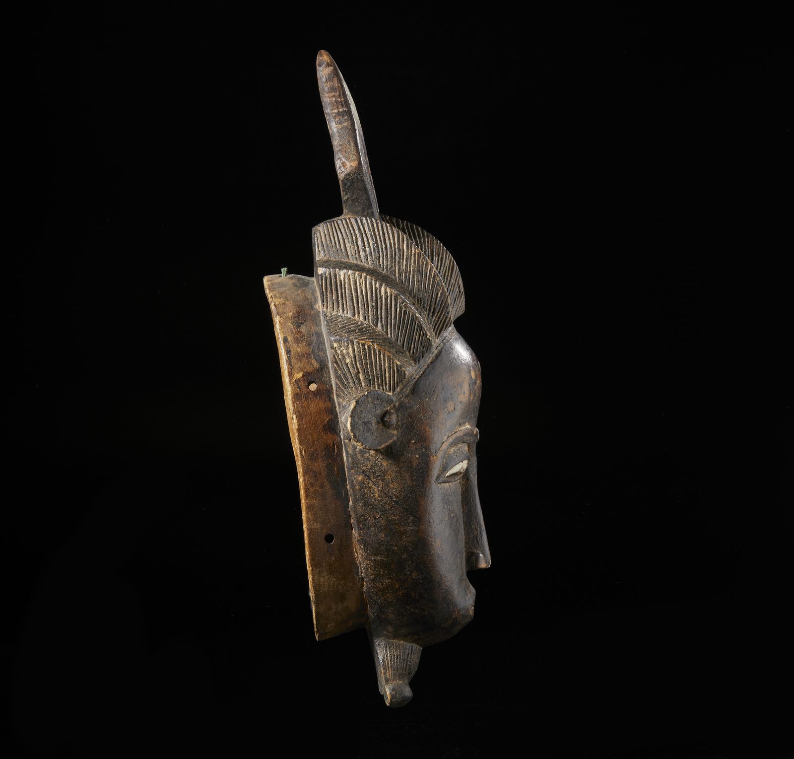 Maschera antropomorfa. Legno a patina marrone e pigmenti.