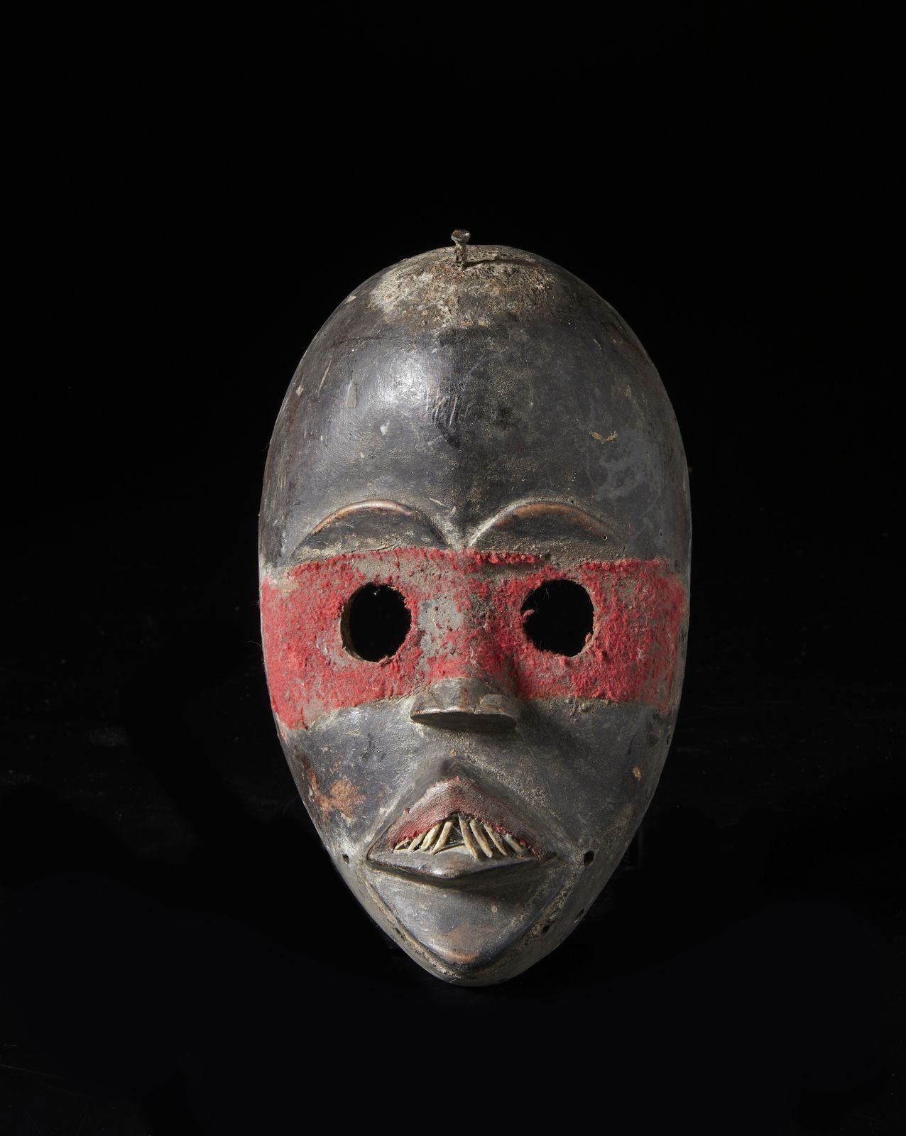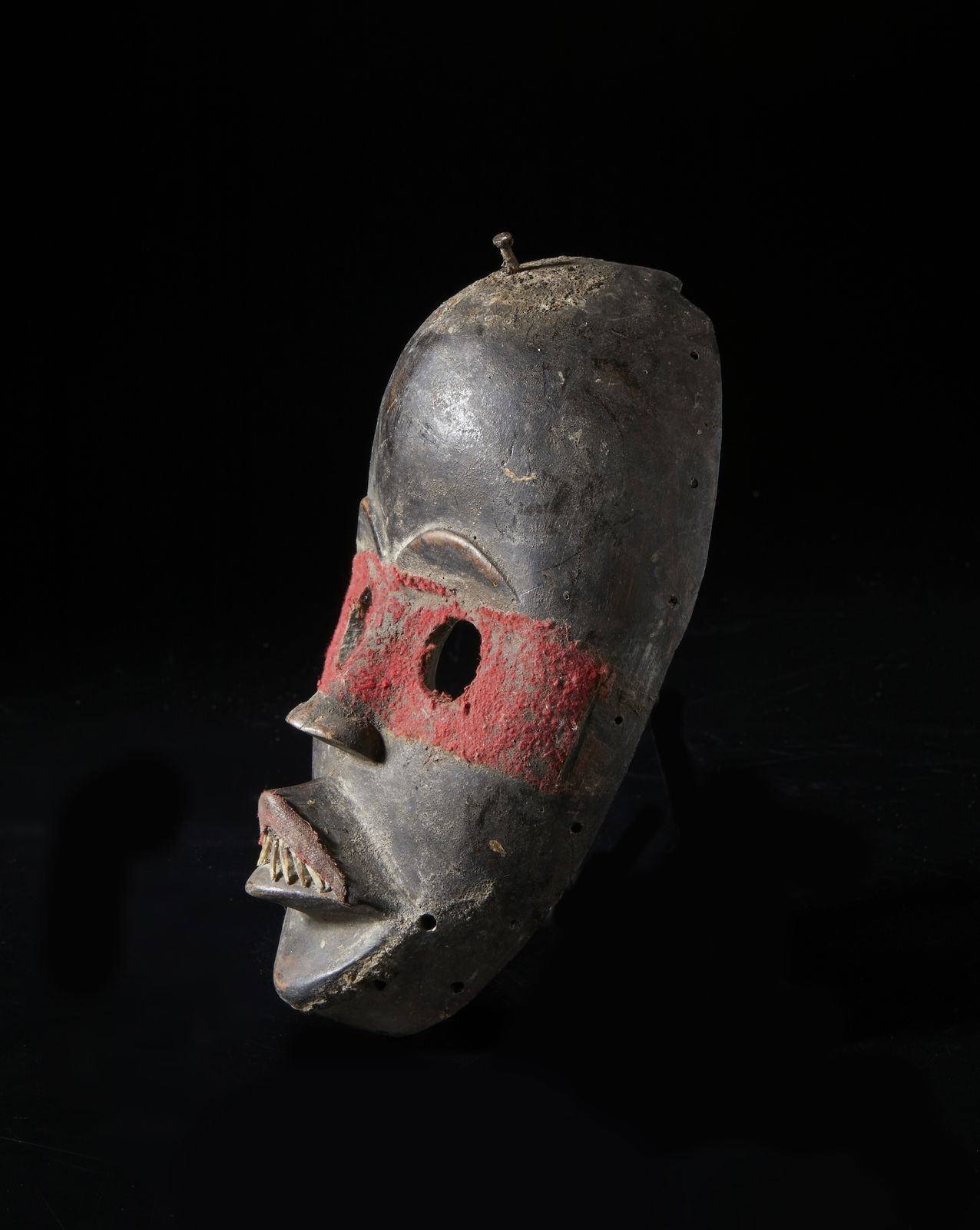 Maschera antropomorfa. Legno a patina scura, tessuto, osso e metallo.