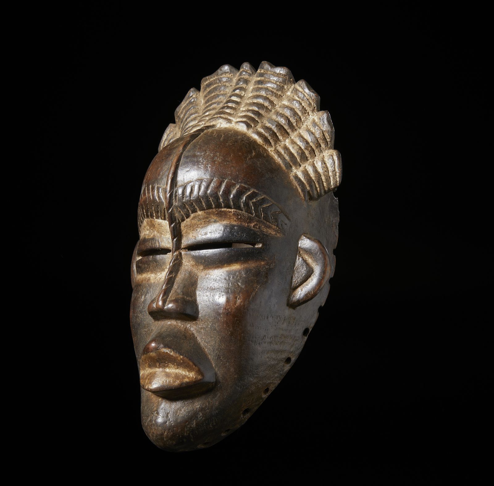 Maschera antropomorfa. Legno duro a patina scura.