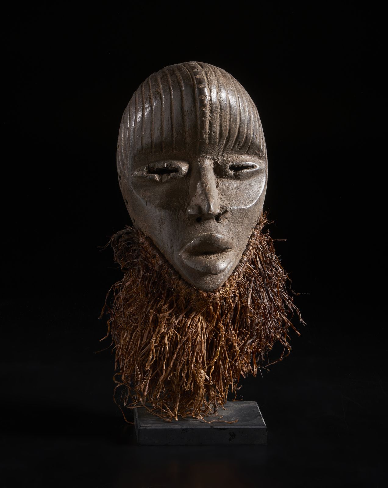 Maschera antropomorfa.Legno duro a patina scura e rafia.