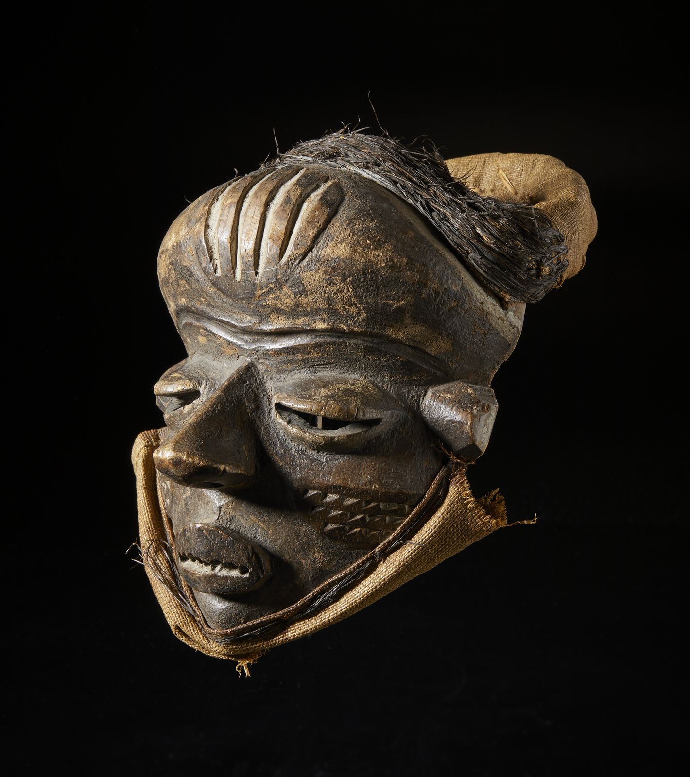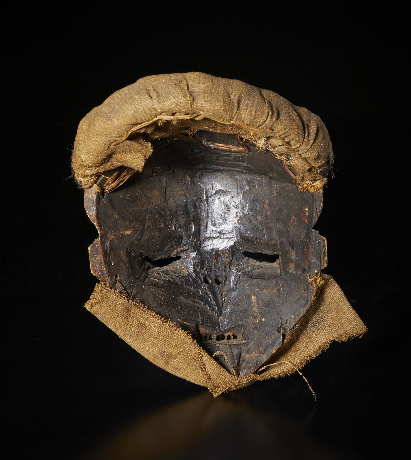 Maschera antropomorfa. Legno duro a patina scura e tessuti in rafia.