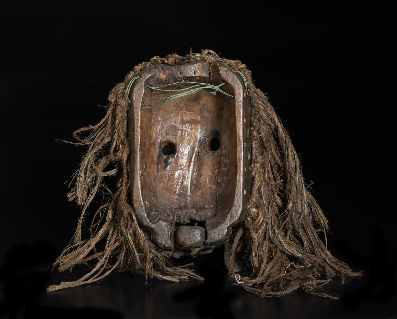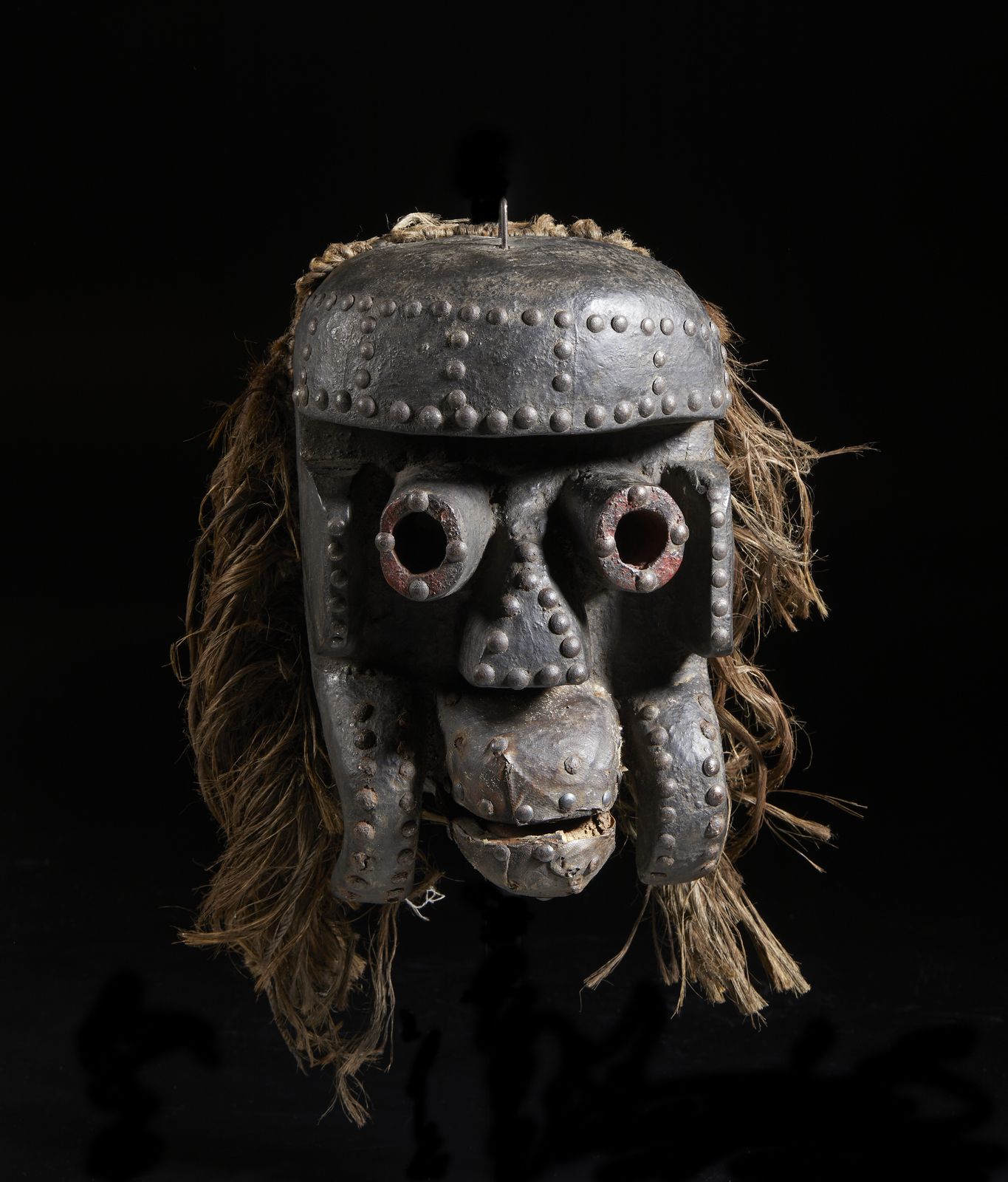 Maschera antropozoomorfa con mandibola mobile. Legno, pelle di animale, borchie [..]