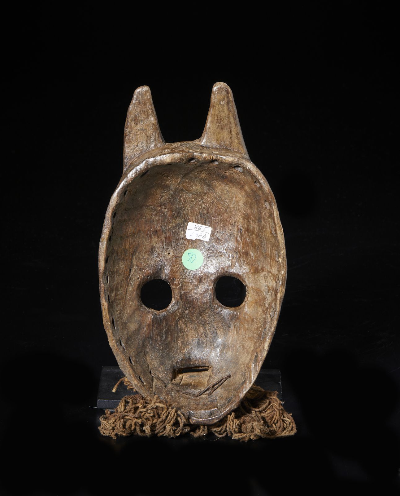 Maschera antropozoomorfa con occhi circolari e corna. Legno duro a patina scura [..]