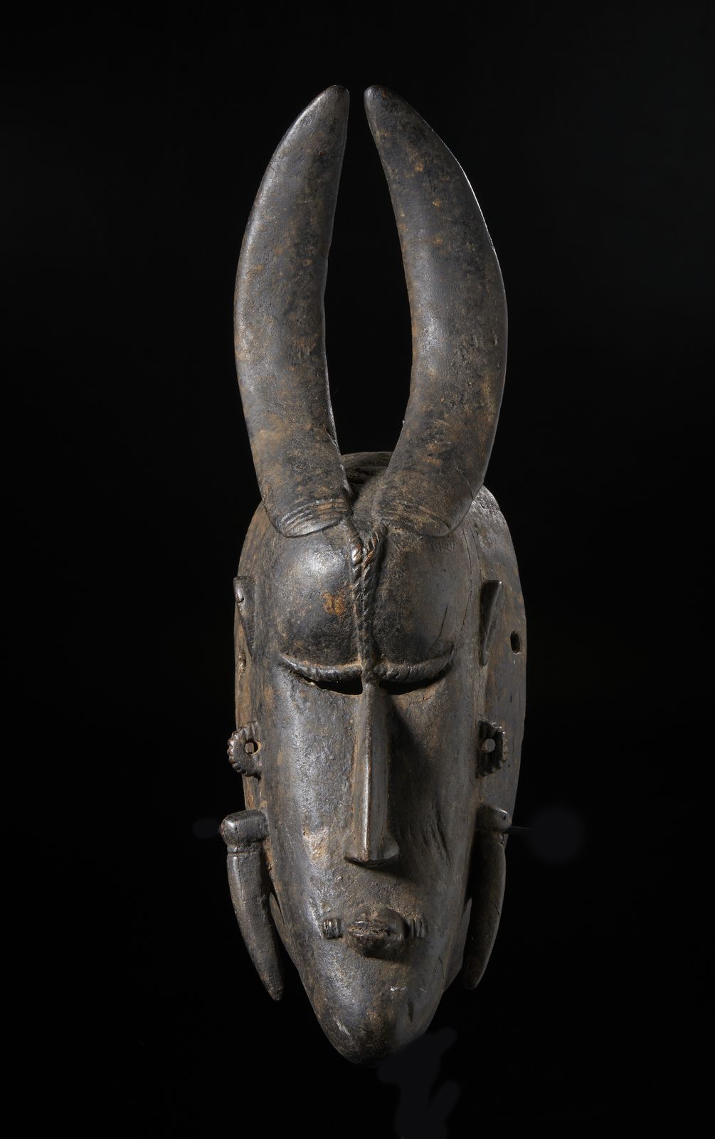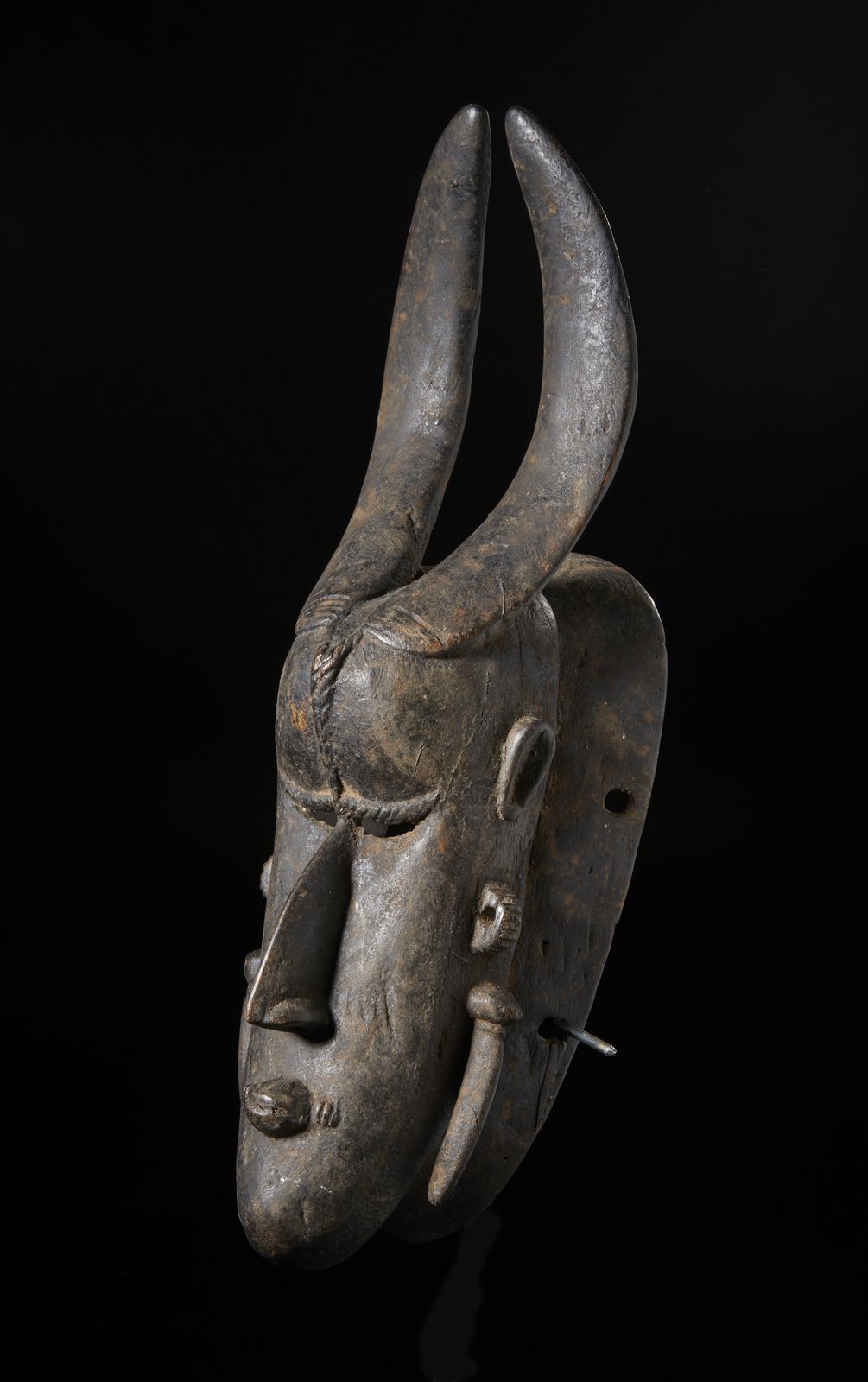 Maschera antropozoomorfa. Legno duro a patina scura.