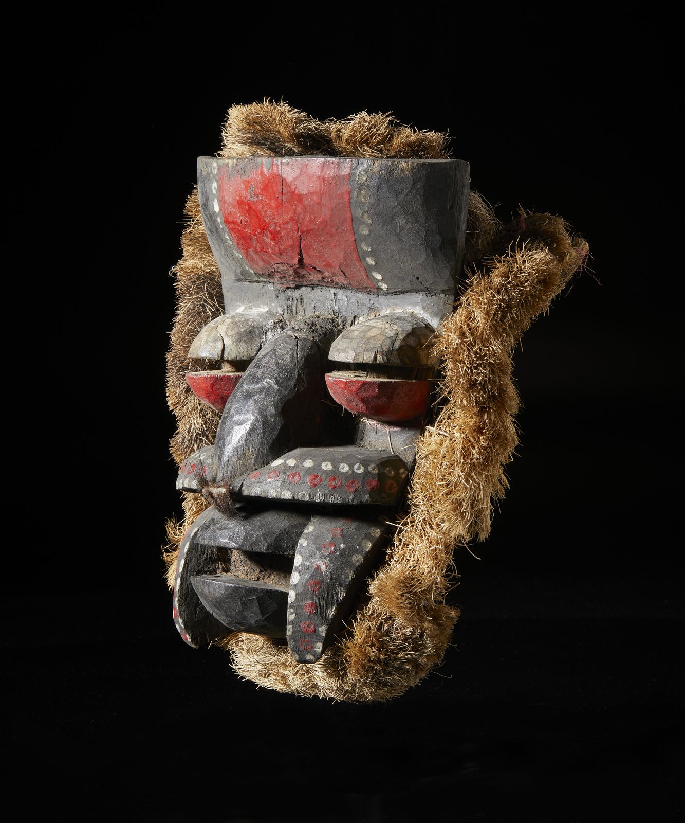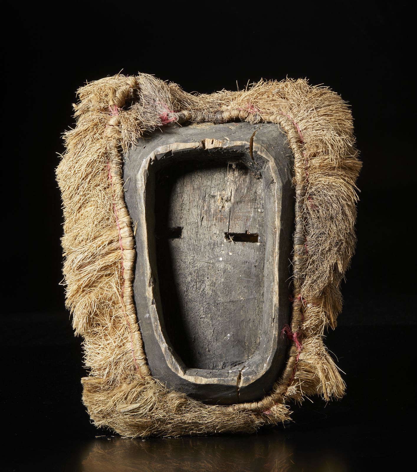 Maschera antropozoomorfa. Legno, rafia e pigmenti industriali.