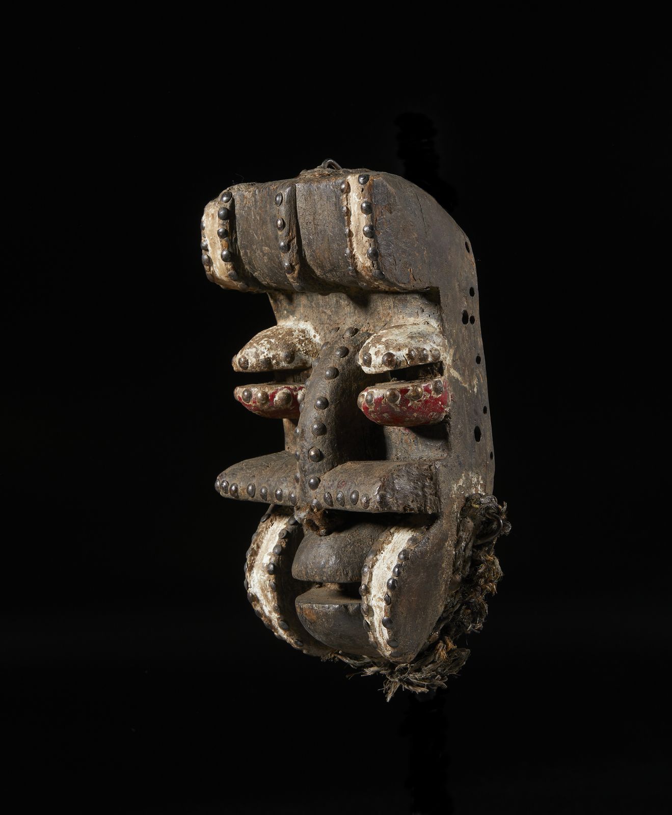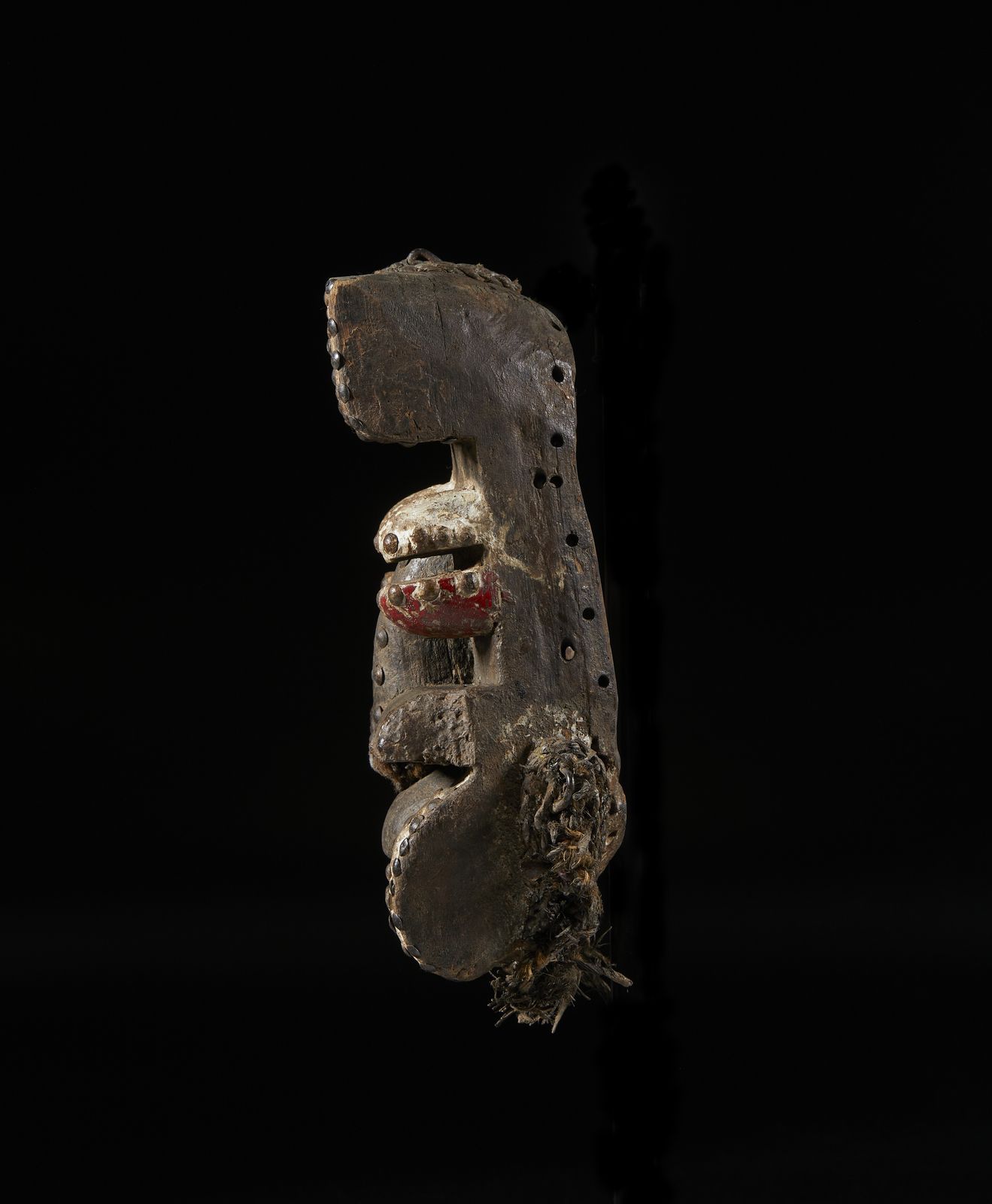 Maschera antropozoomorfaLegno, borchie, chiodi, pigmenti, caolino e tessuto.