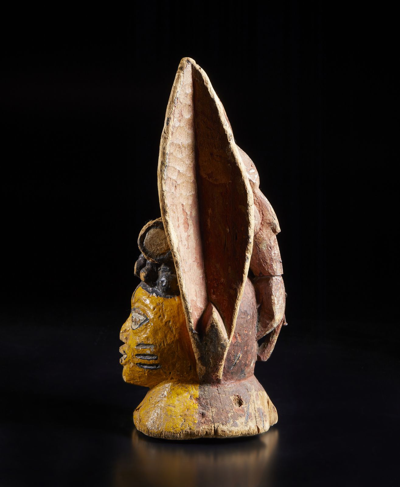Maschera cimiero antropozoomorfa. Legno e pigmenti.