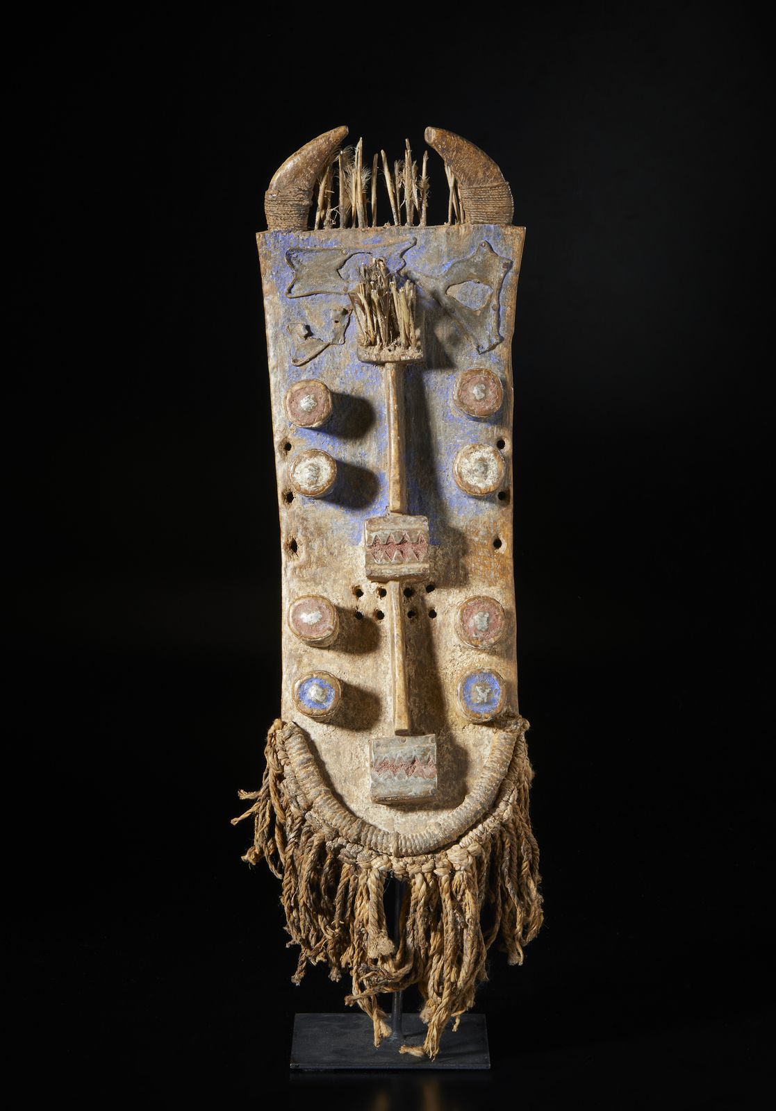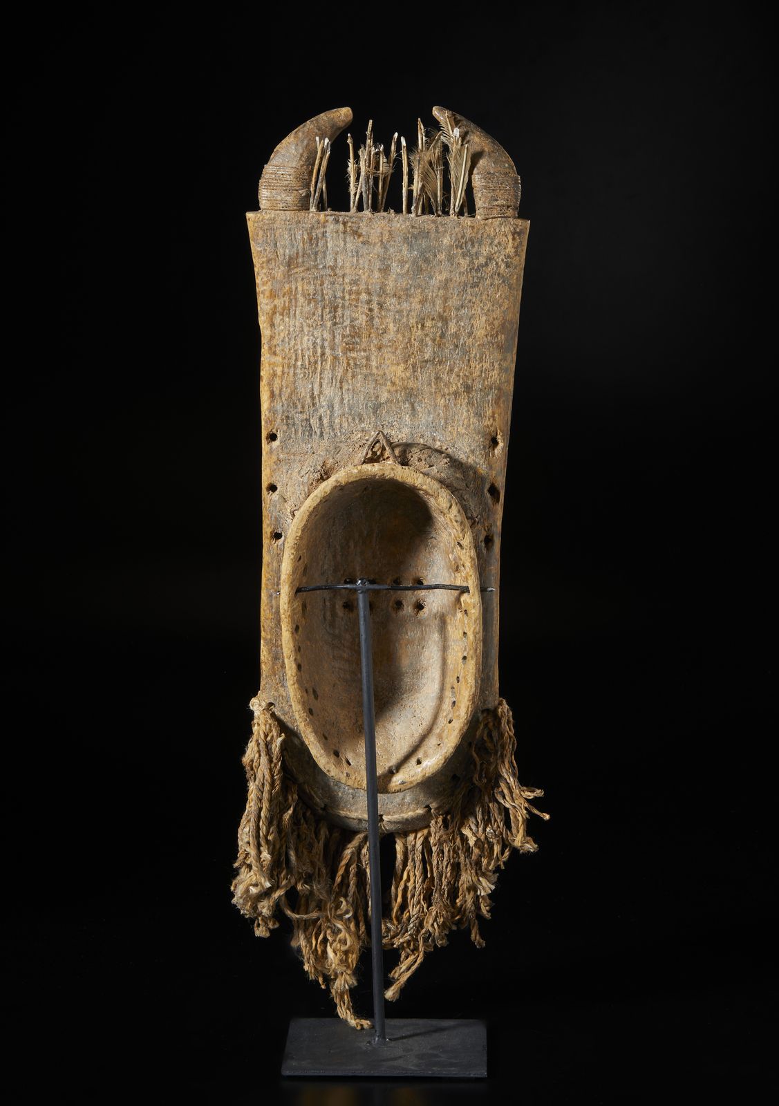 Maschera con due volti stilizzati verticali, con corna e barba. Legno, fibre, piume, [..]