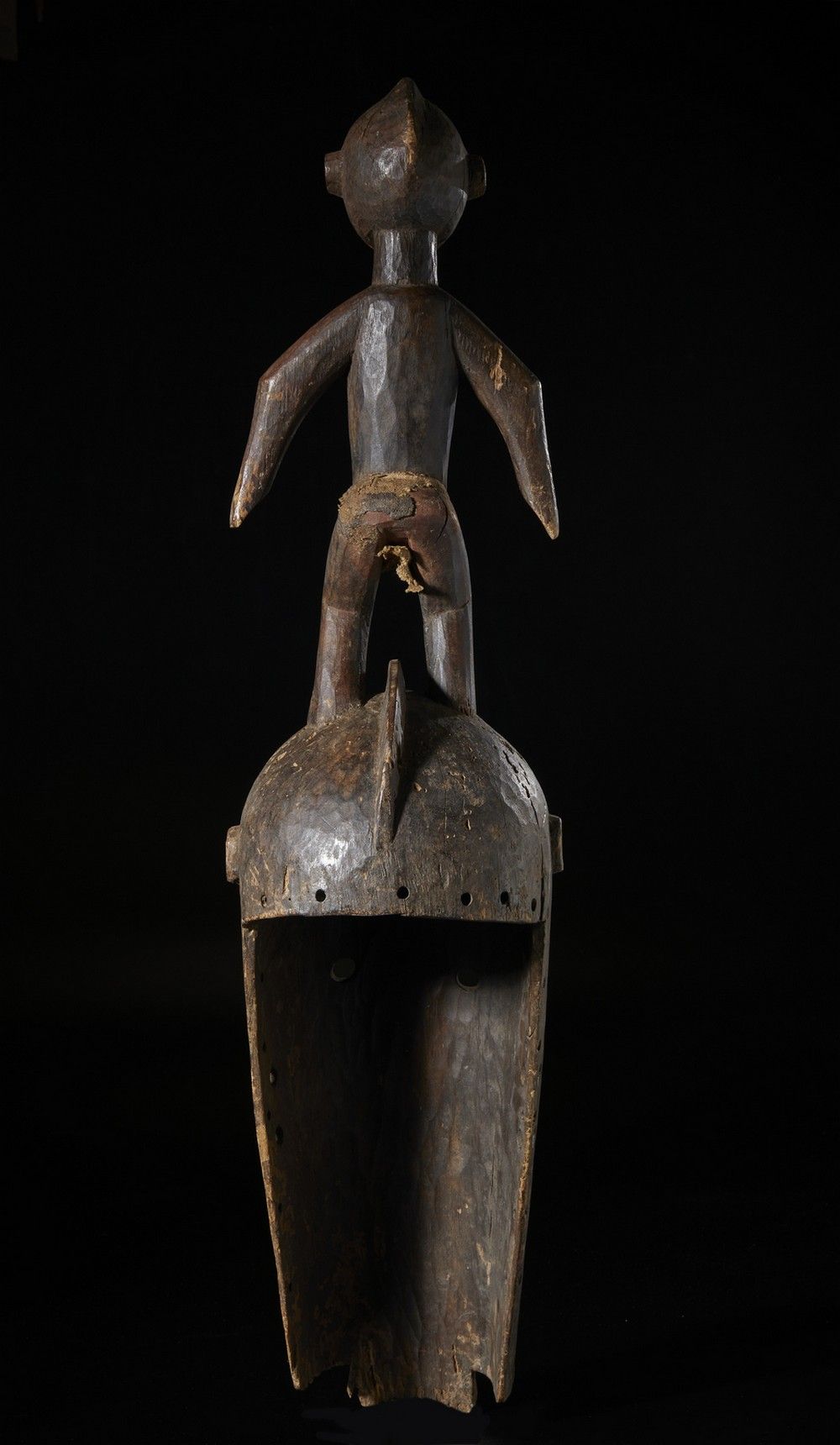 Maschera con figura antropomorfa.Legno duro a patina scura e tessuto.
