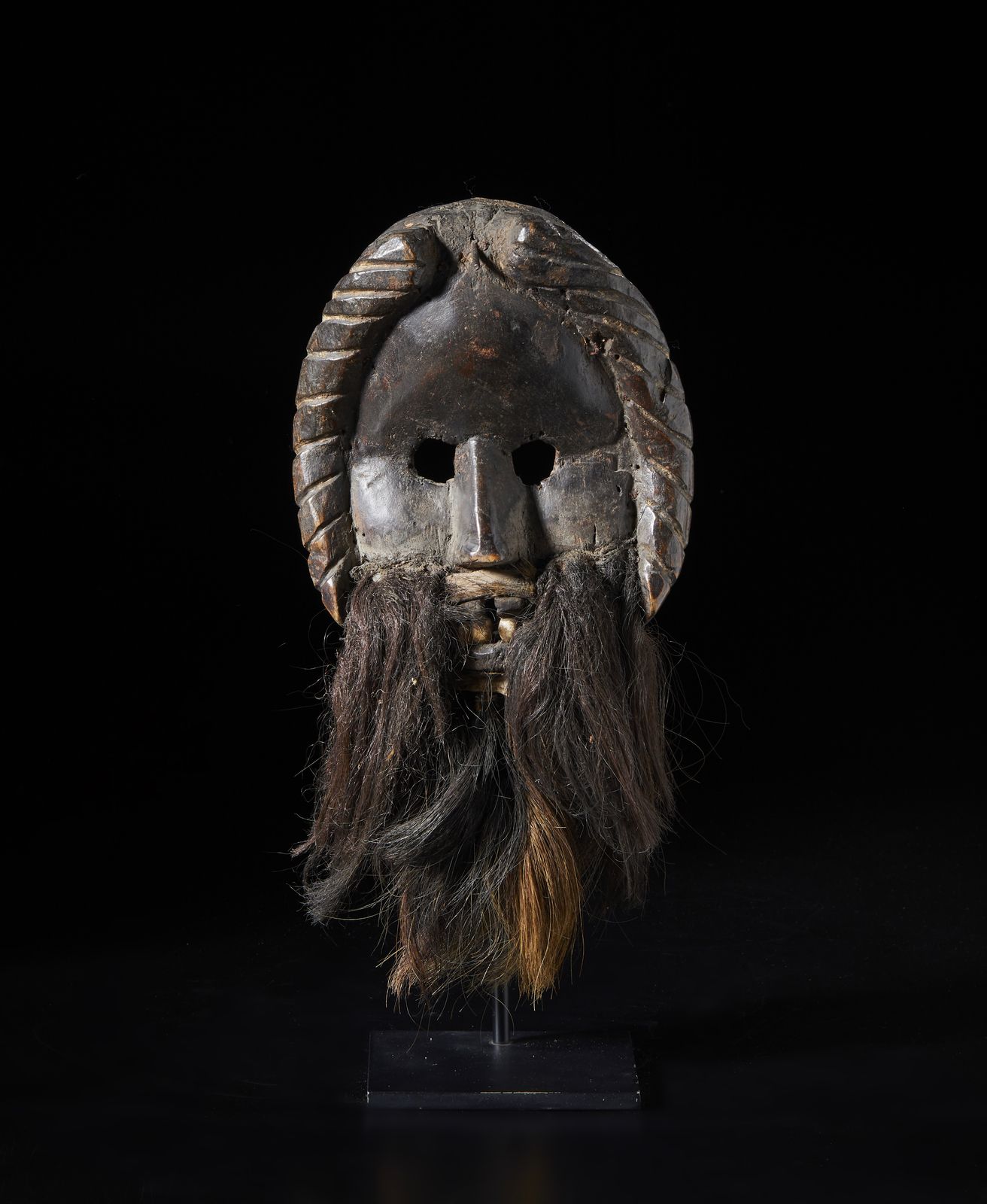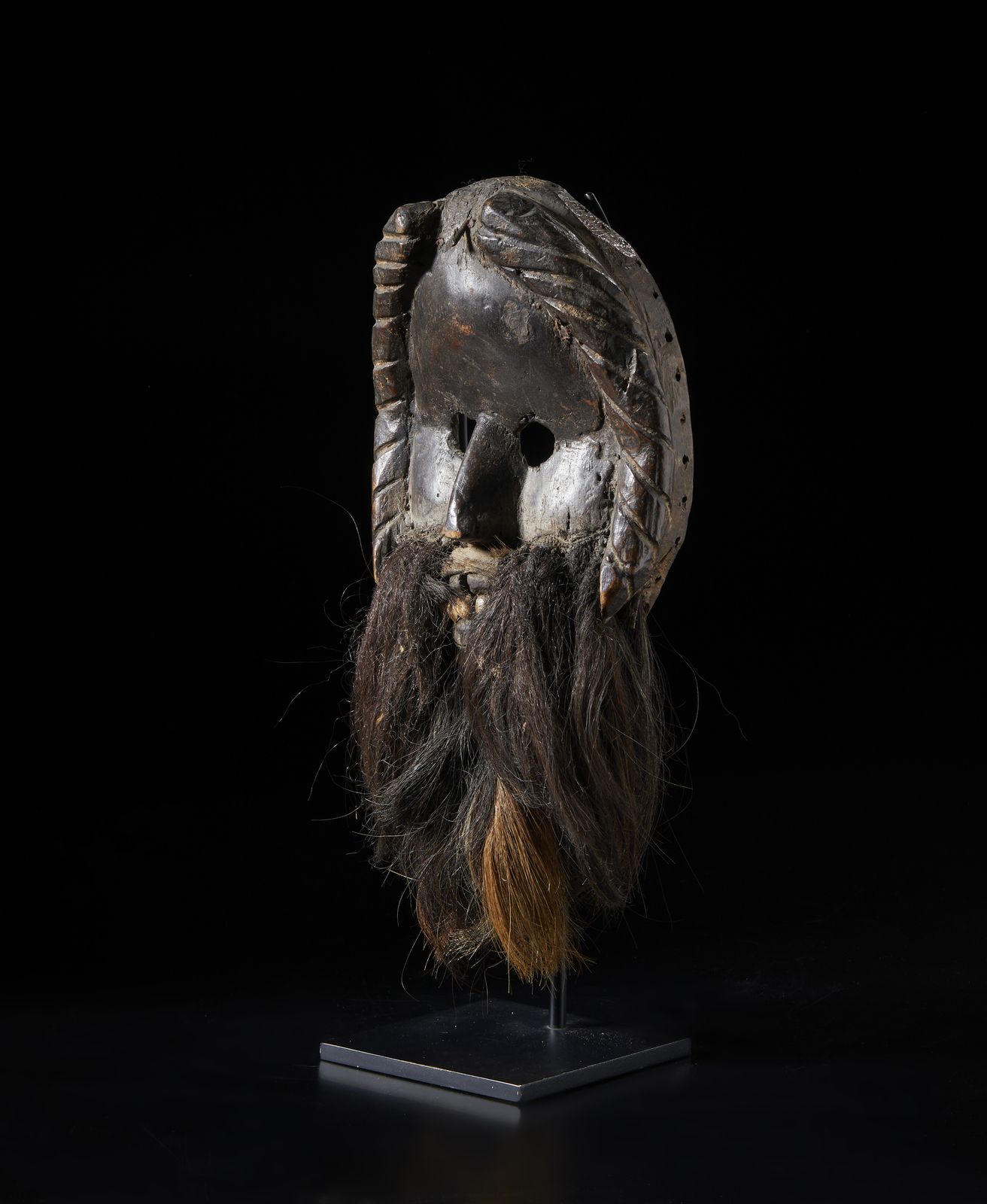 Maschera con occhi circolari. Legno duro, peli e denti.