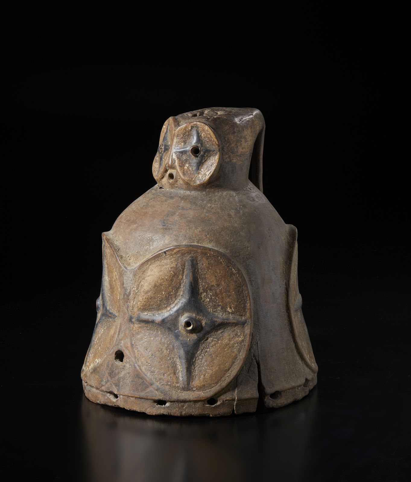 Maschera-elmo gianiforme.Legno a patina bruna con tracce di pigmenti.