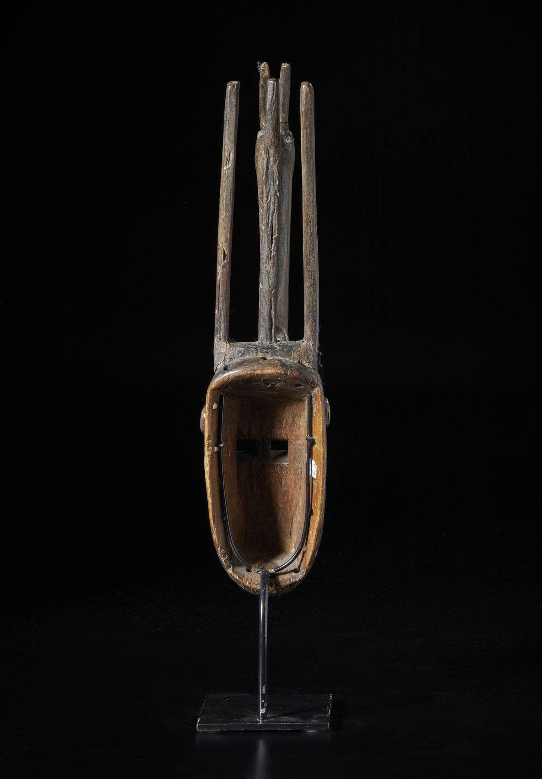 Maschera Ntomo a tre corna e con testa di antilope.Legno duro a patina scura.