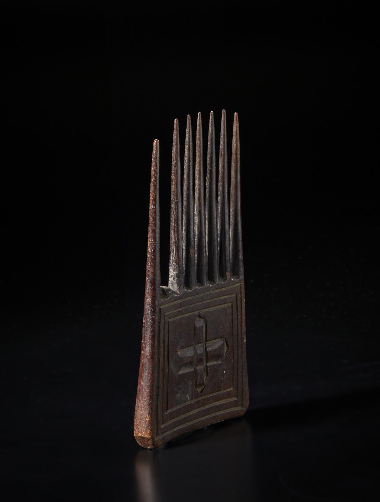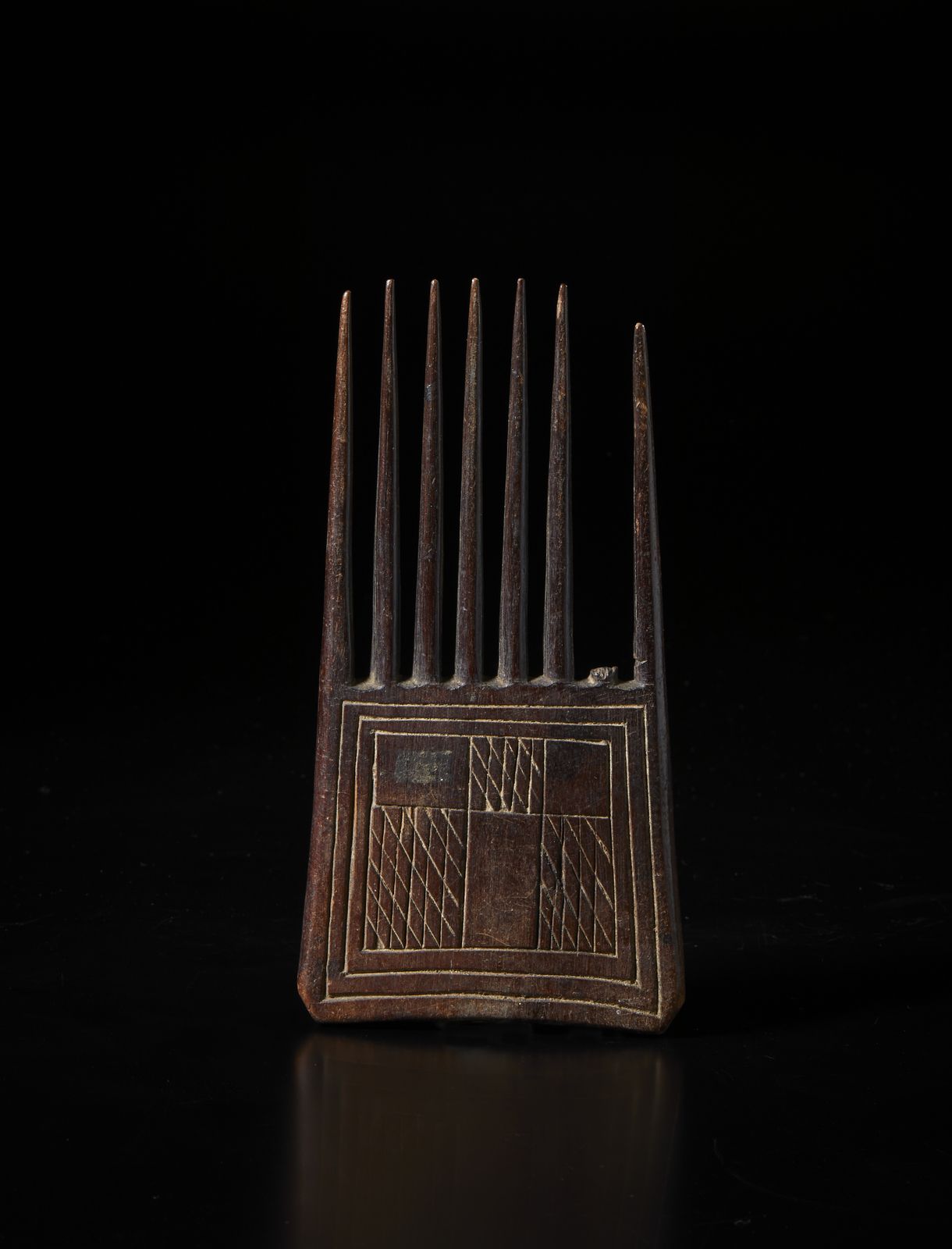 Pettinino con otto denti e decorazioni geometriche incise.Legno a patina scura.