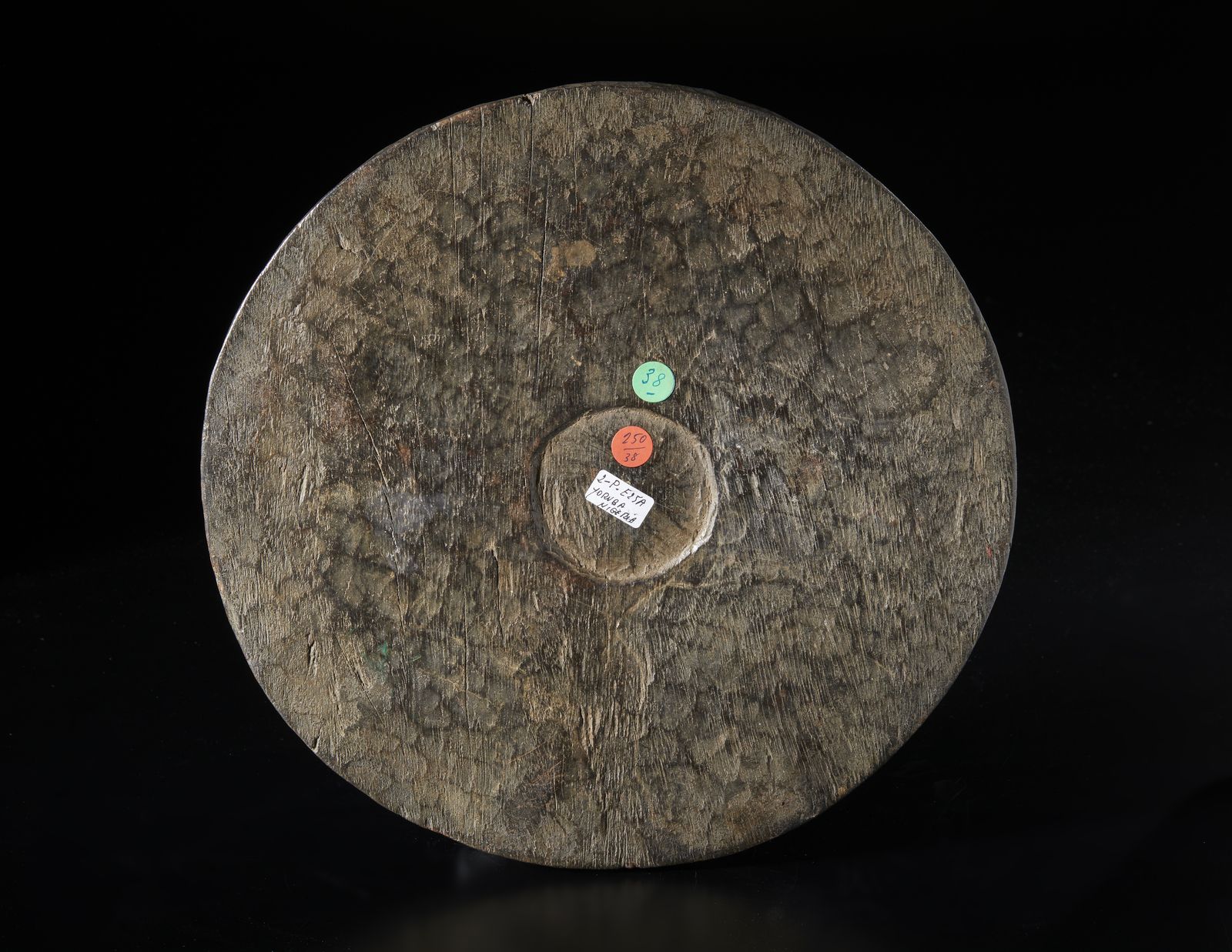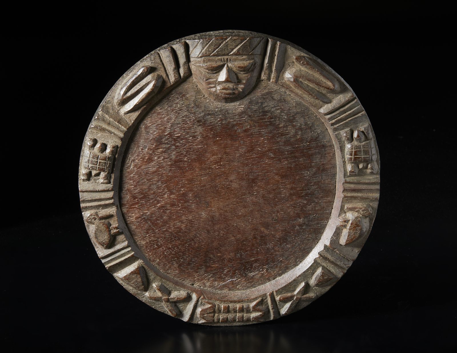 Piatto divinatorio con volto antropomorfo ed animali stilizzati. Legno duro a patina [..]