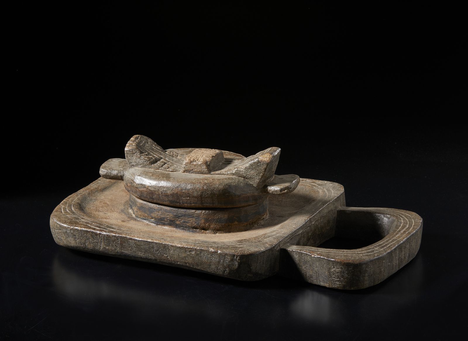 Piatto divinatorio e contenitore. Legno duro a patina scura e pigmenti.