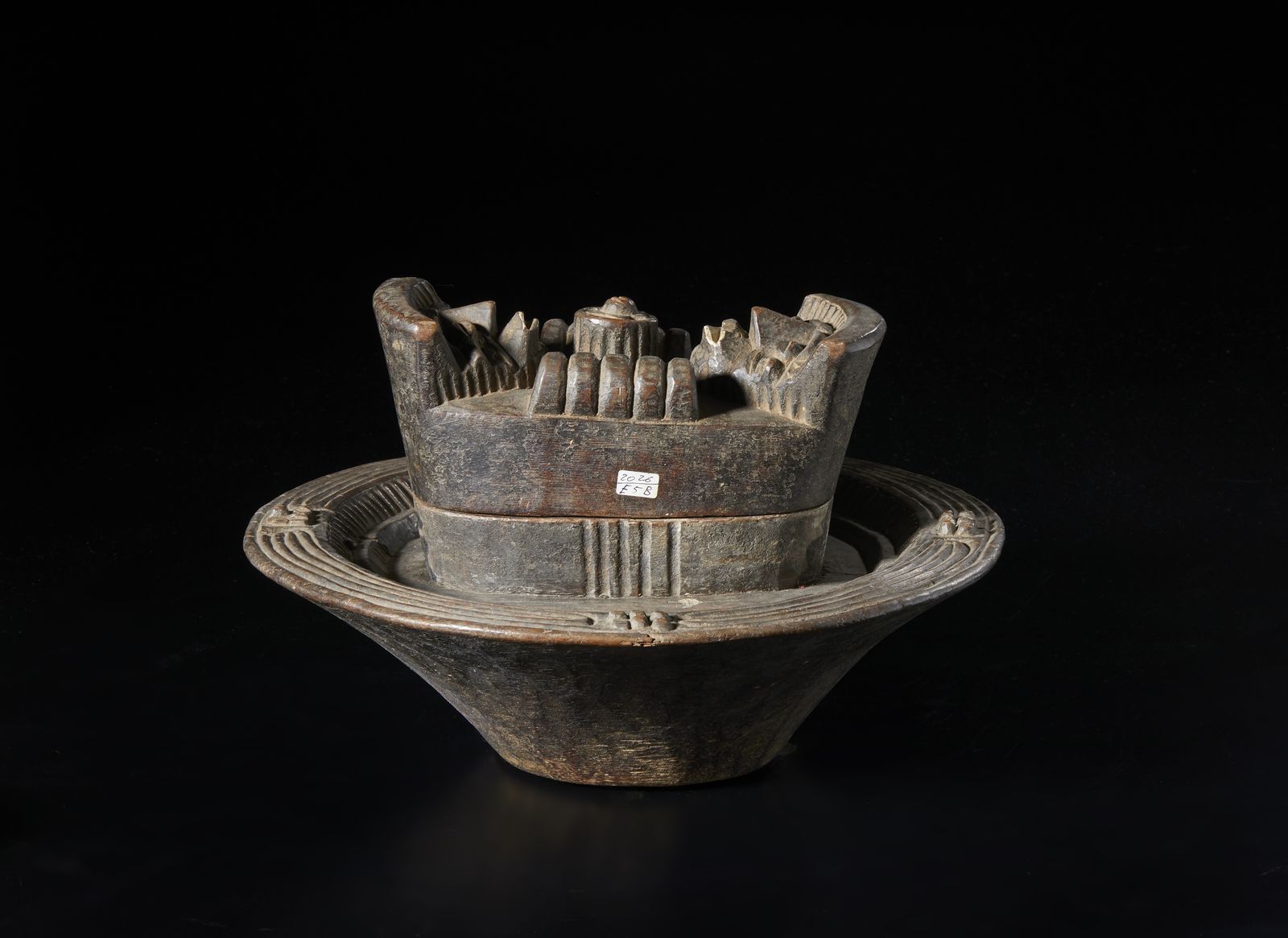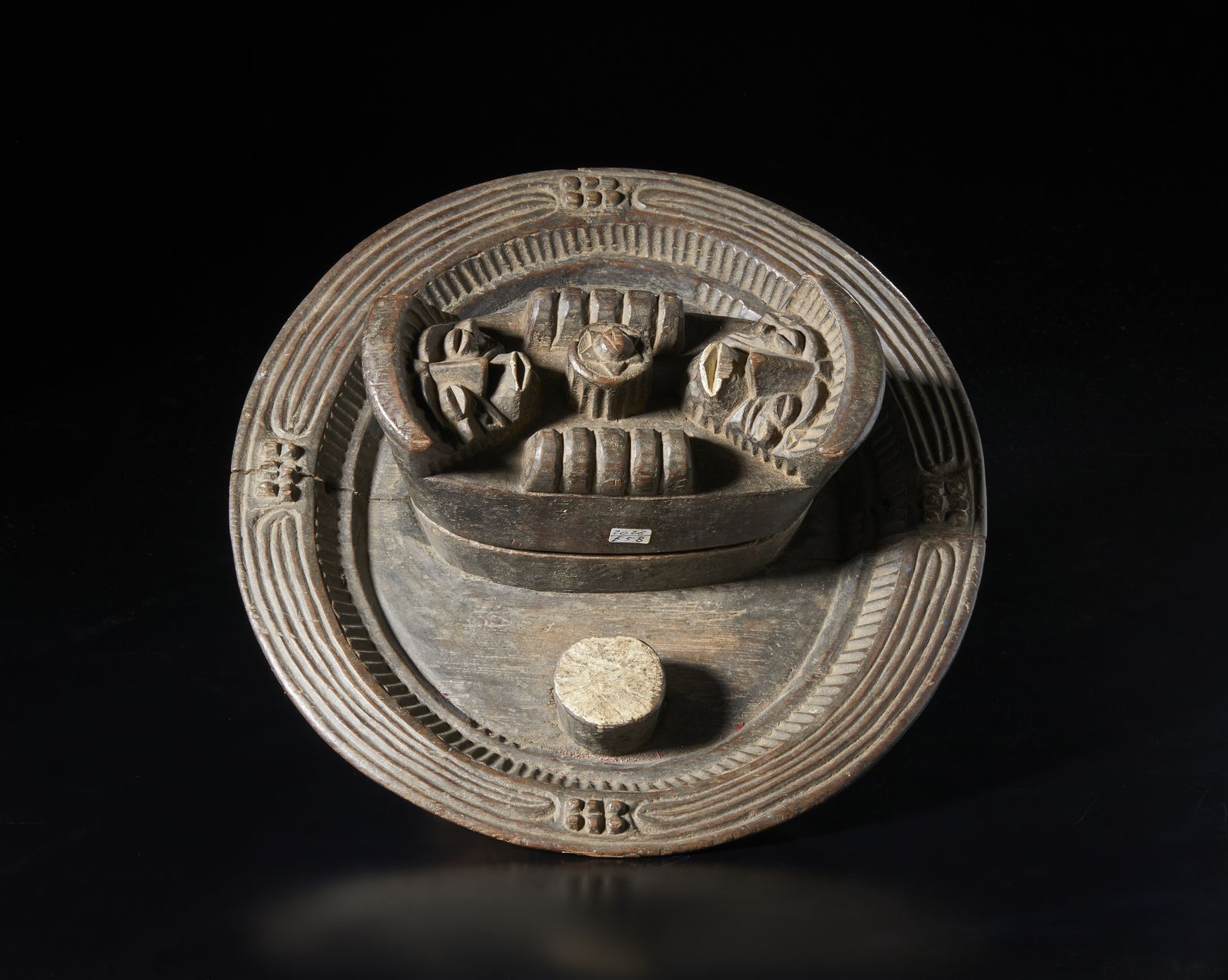 Piatto divinatorio e contenitore per noci di cola. Legno duro a patina scura e p [..]