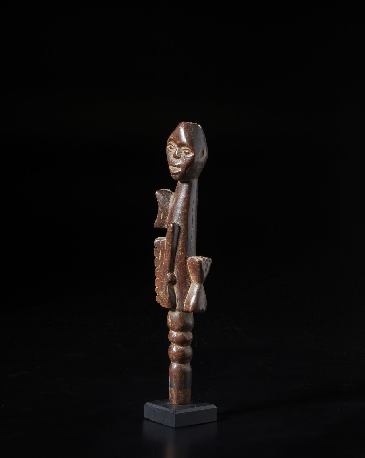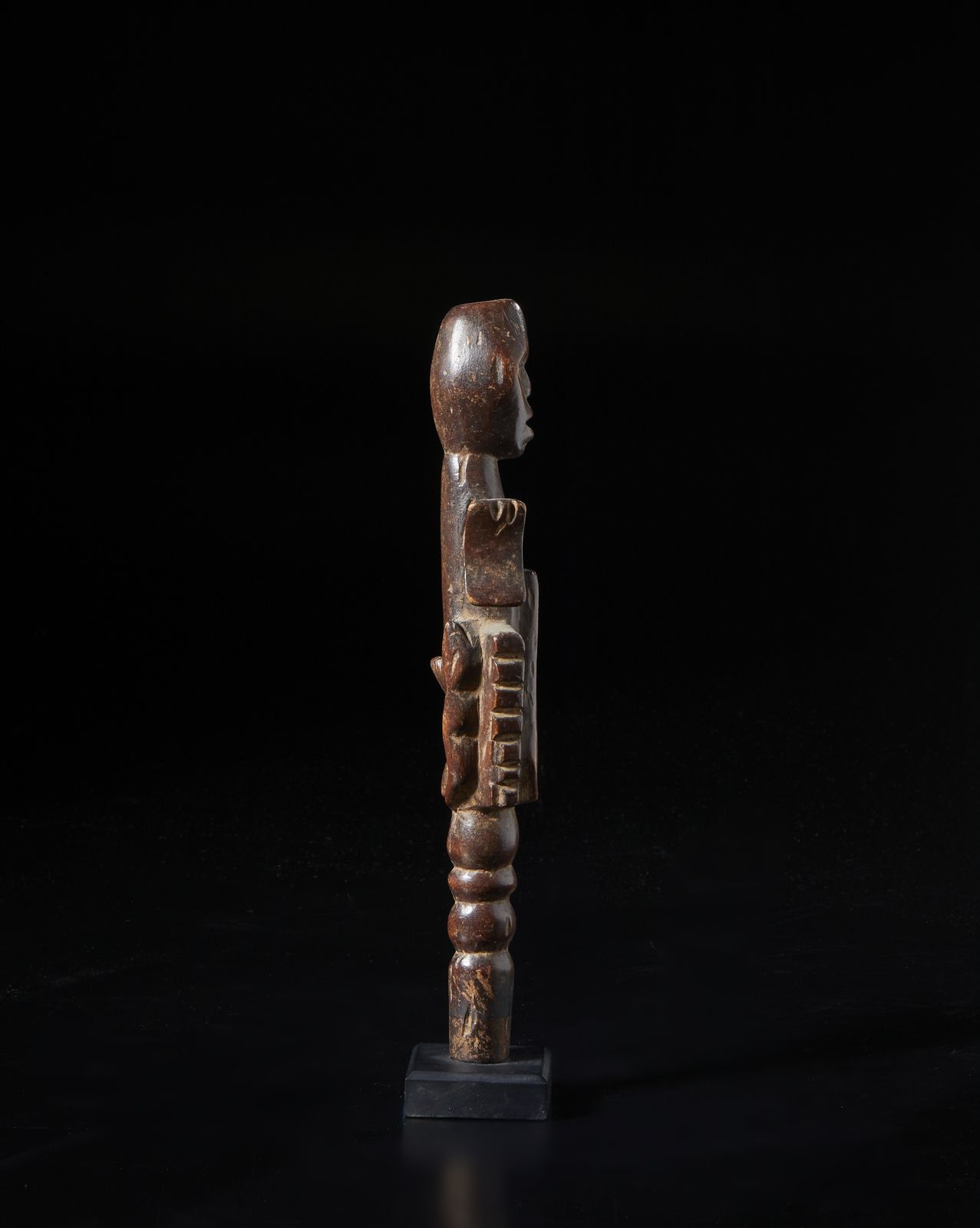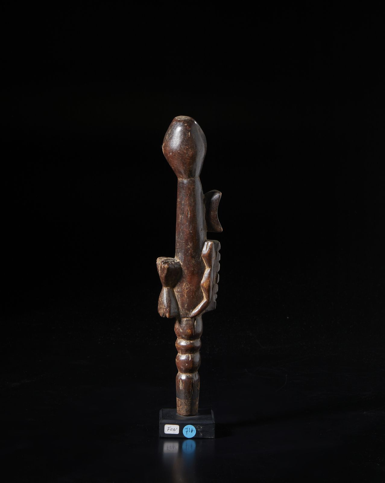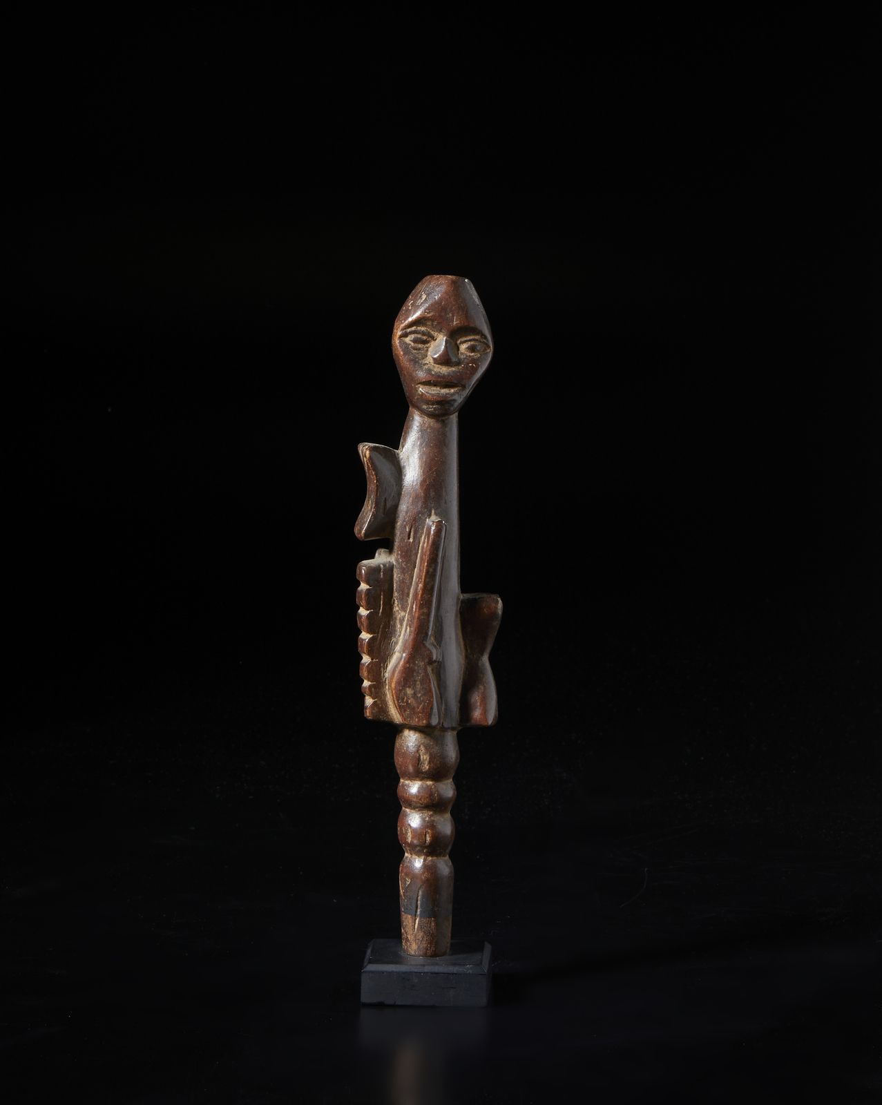 Scettro o parte sommitale di bastone con scultura antropomorfa.Legno a patina marrone [..]