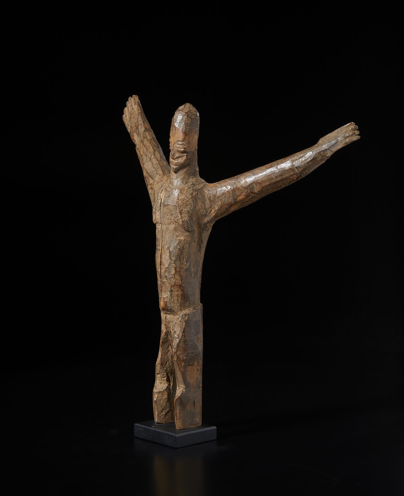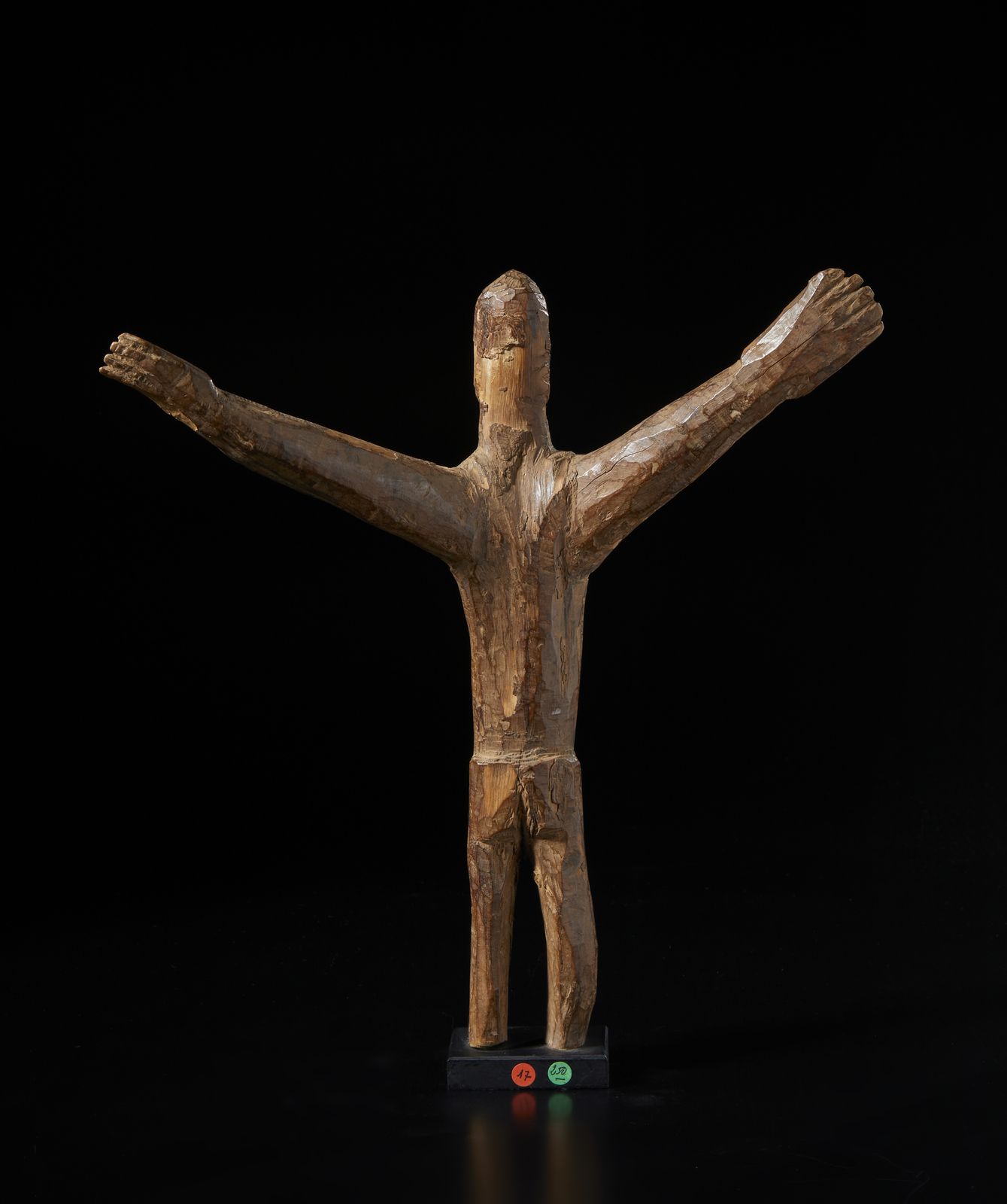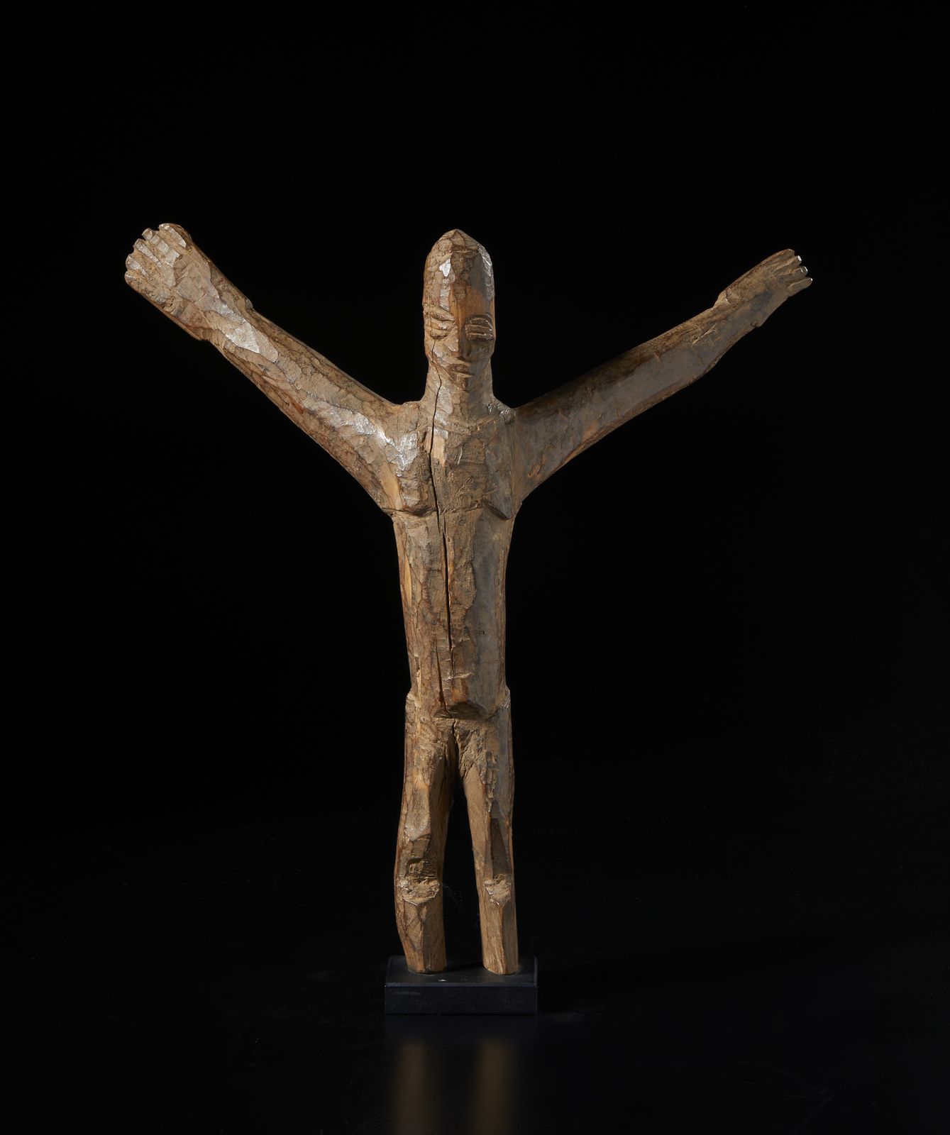 Scultura antropomorfa Bateba con braccia alzate. Legno duro a patina chiara.