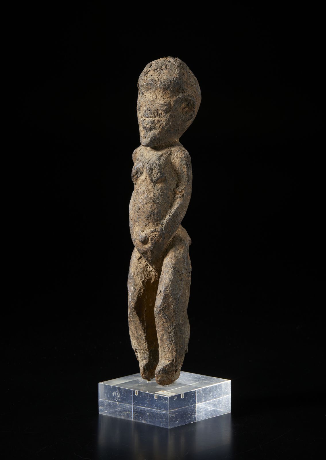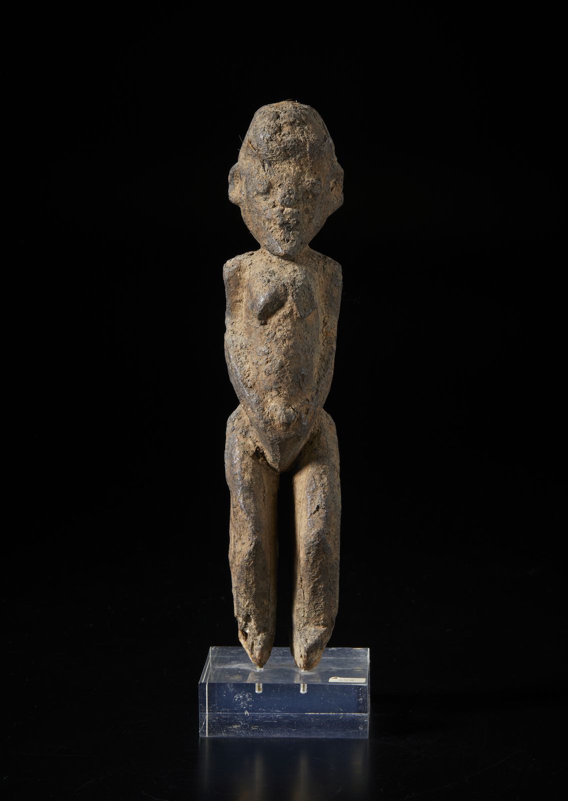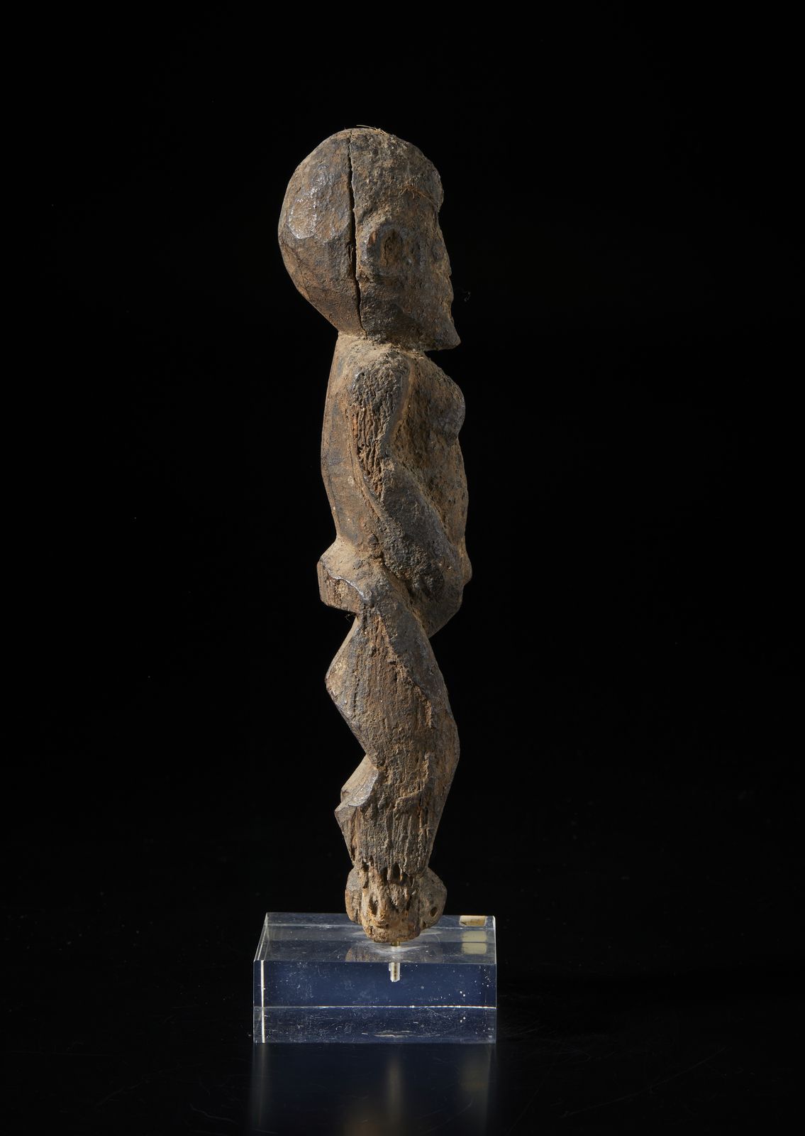Scultura antropomorfa Bateba. Legno a patina scura e crostosa.