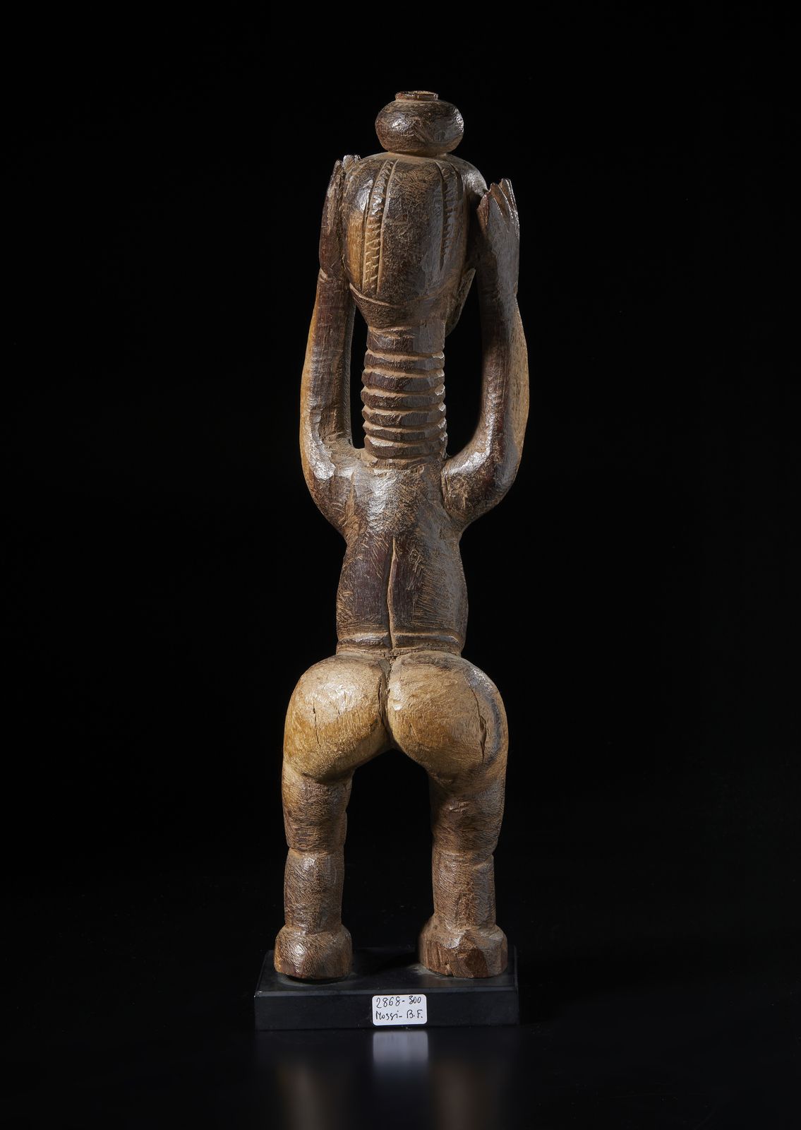 Scultura antropomorfa con braccia alzate a sorreggere un contenitore. Legno duro [..]