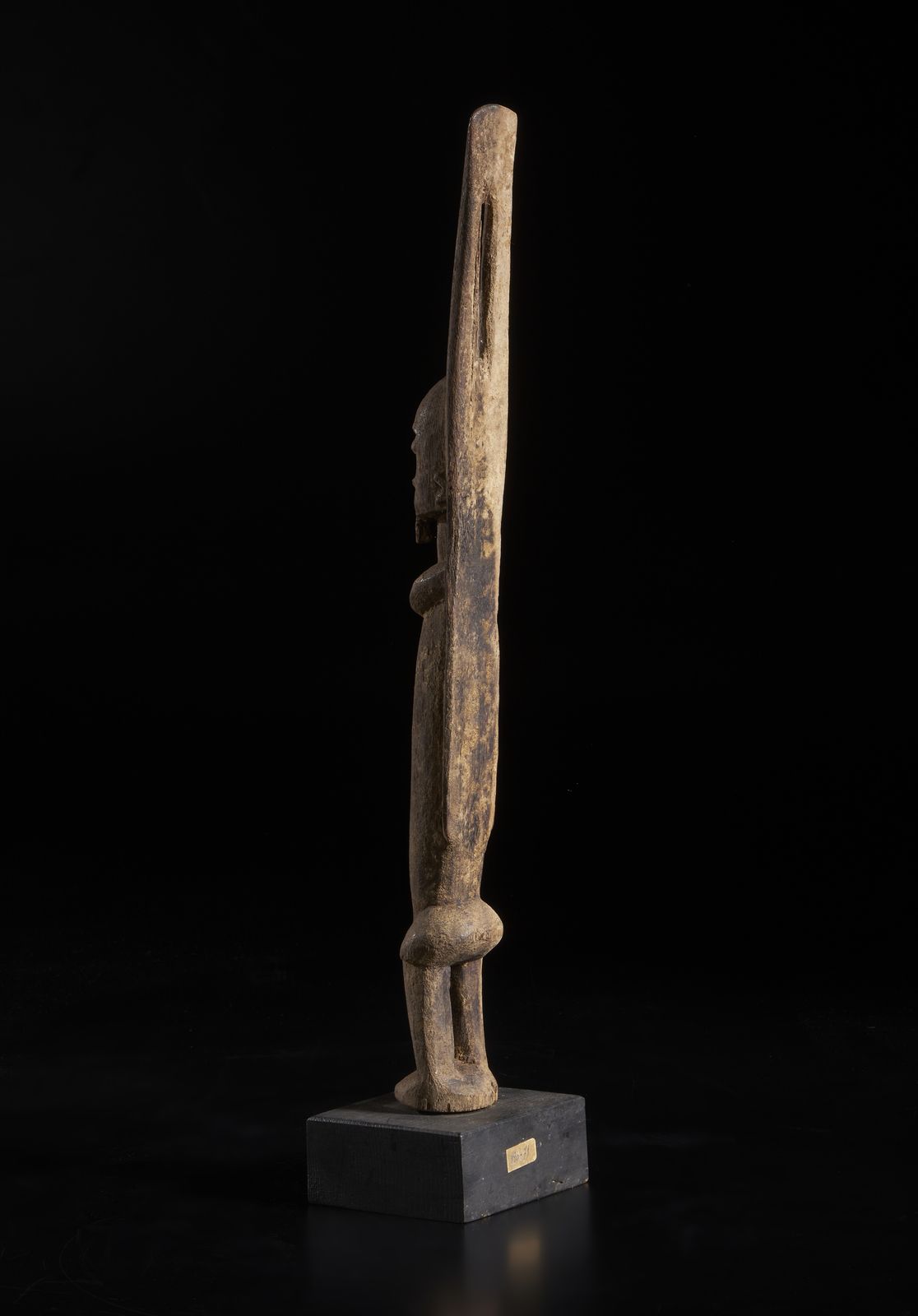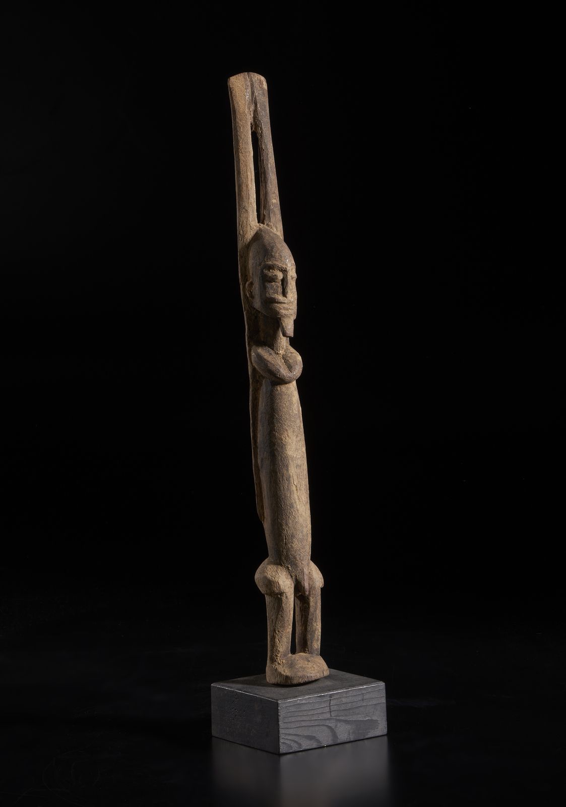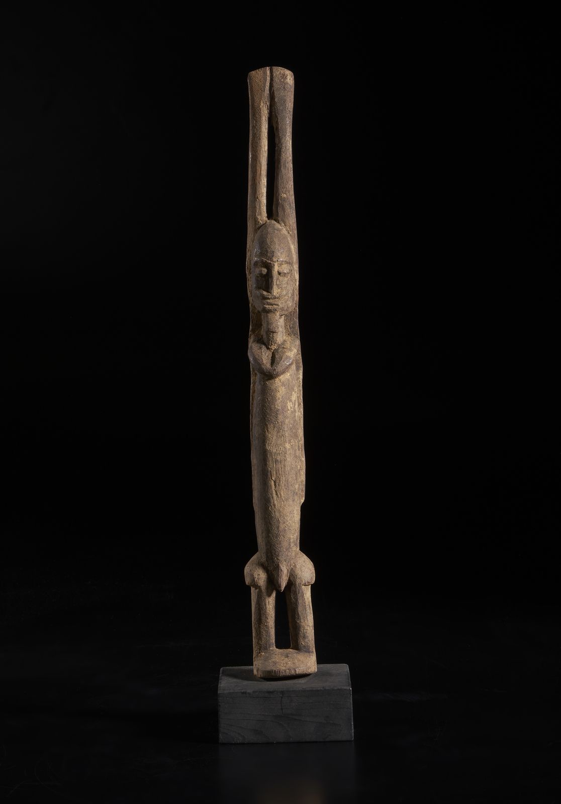 Scultura antropomorfa con braccia alzate. Legno duro a patina bruna.