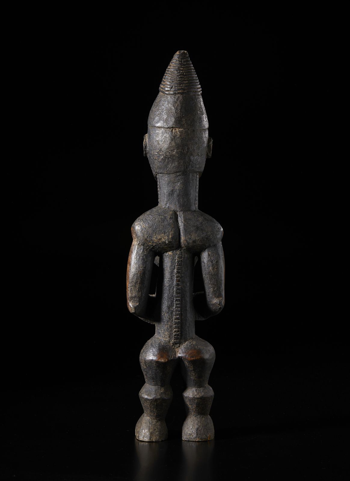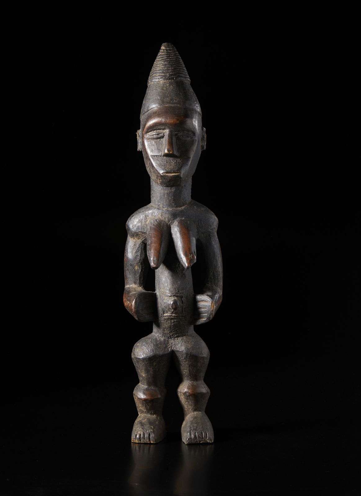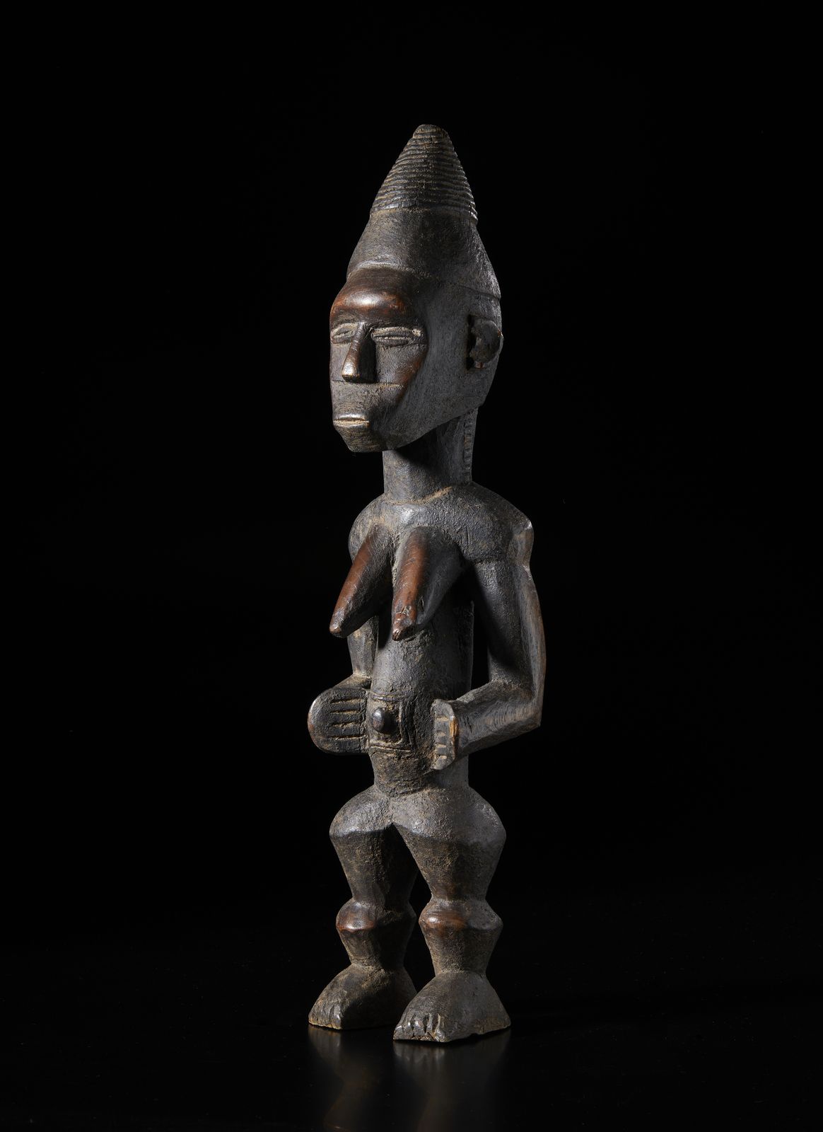Scultura antropomorfa con copricapo.Legno a patina scura.