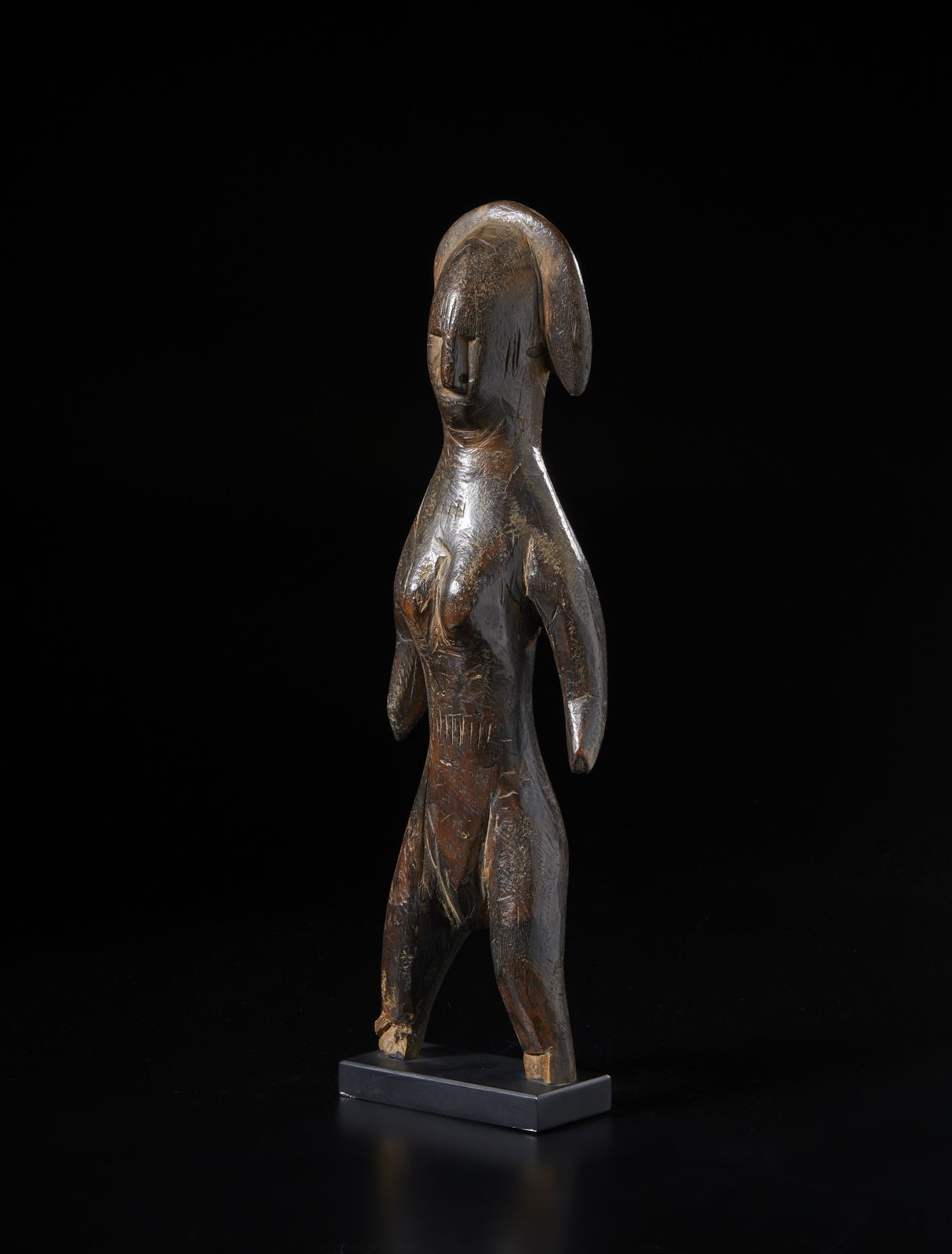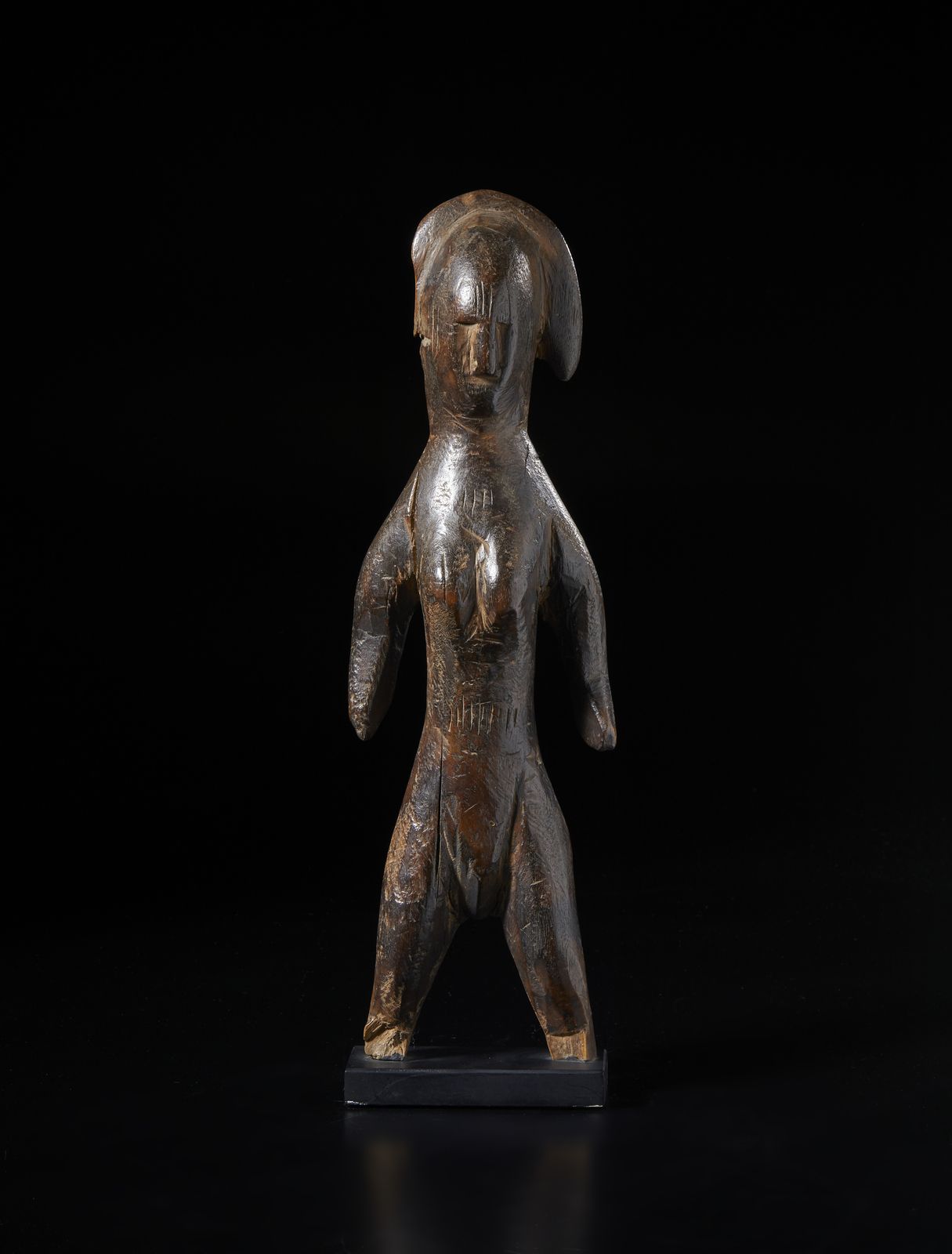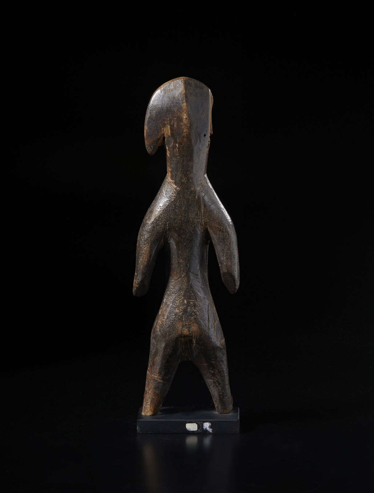 Scultura antropomorfa con mancanza. Legno a patina scura e marrone.