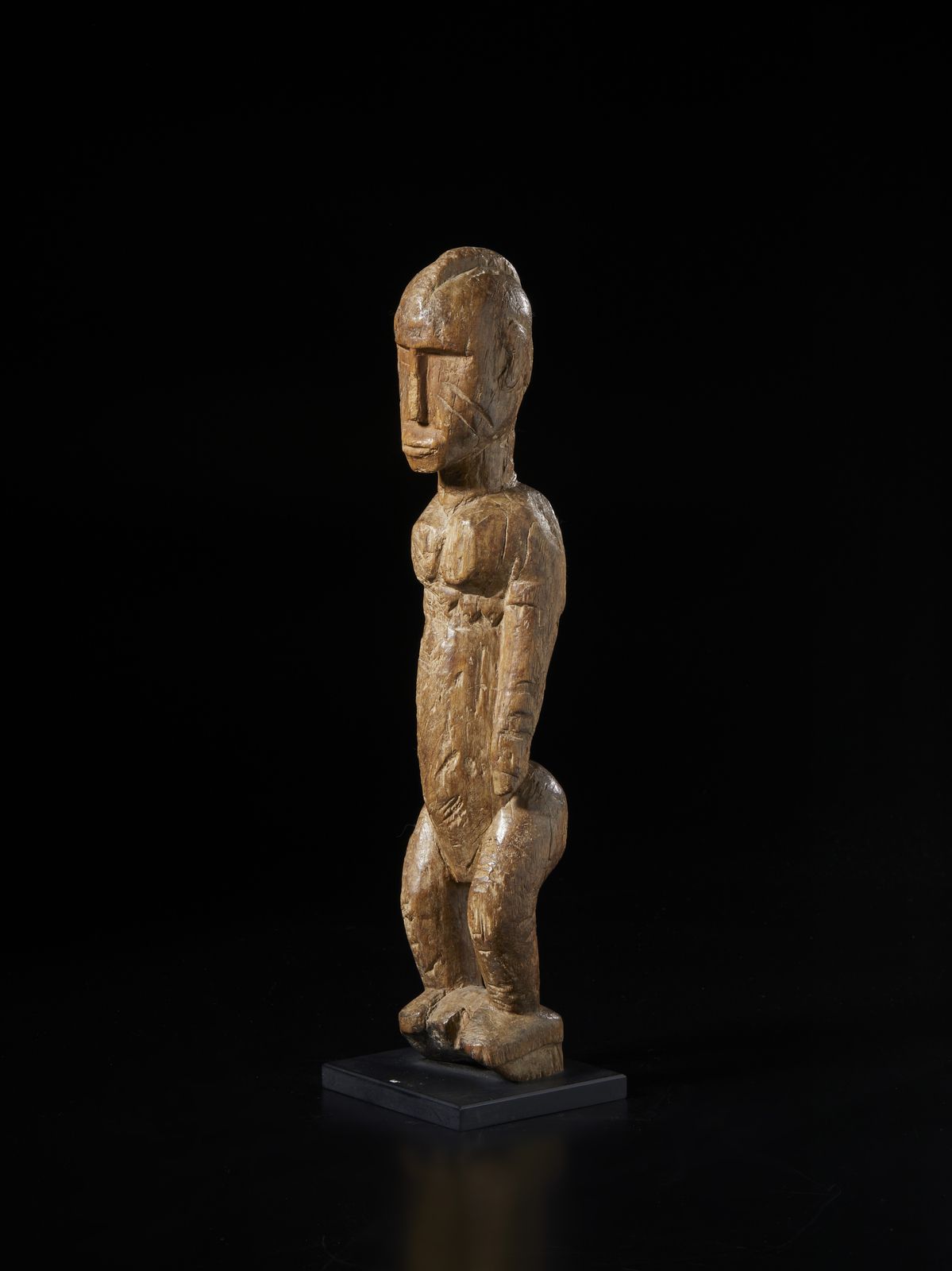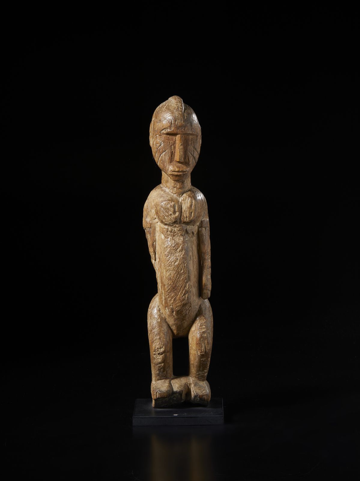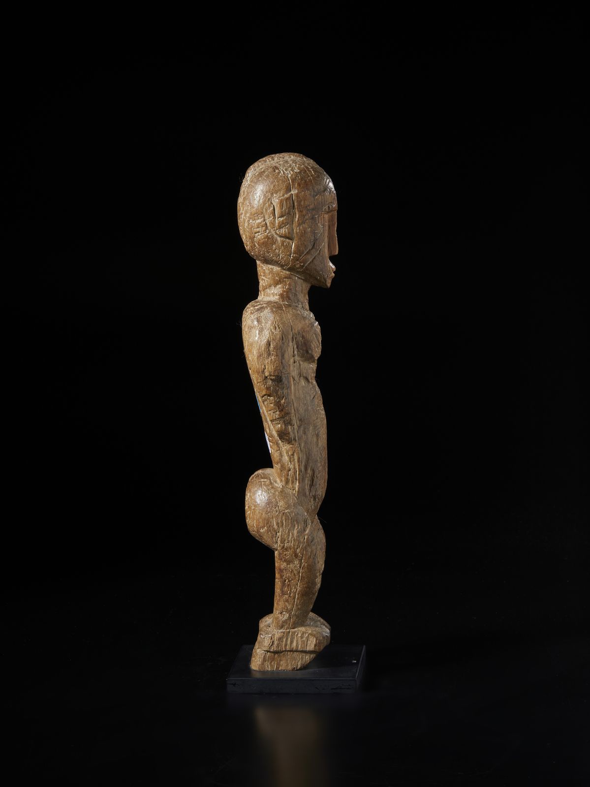 Scultura antropomorfa con mancanza. Legno duro a patina chiara.