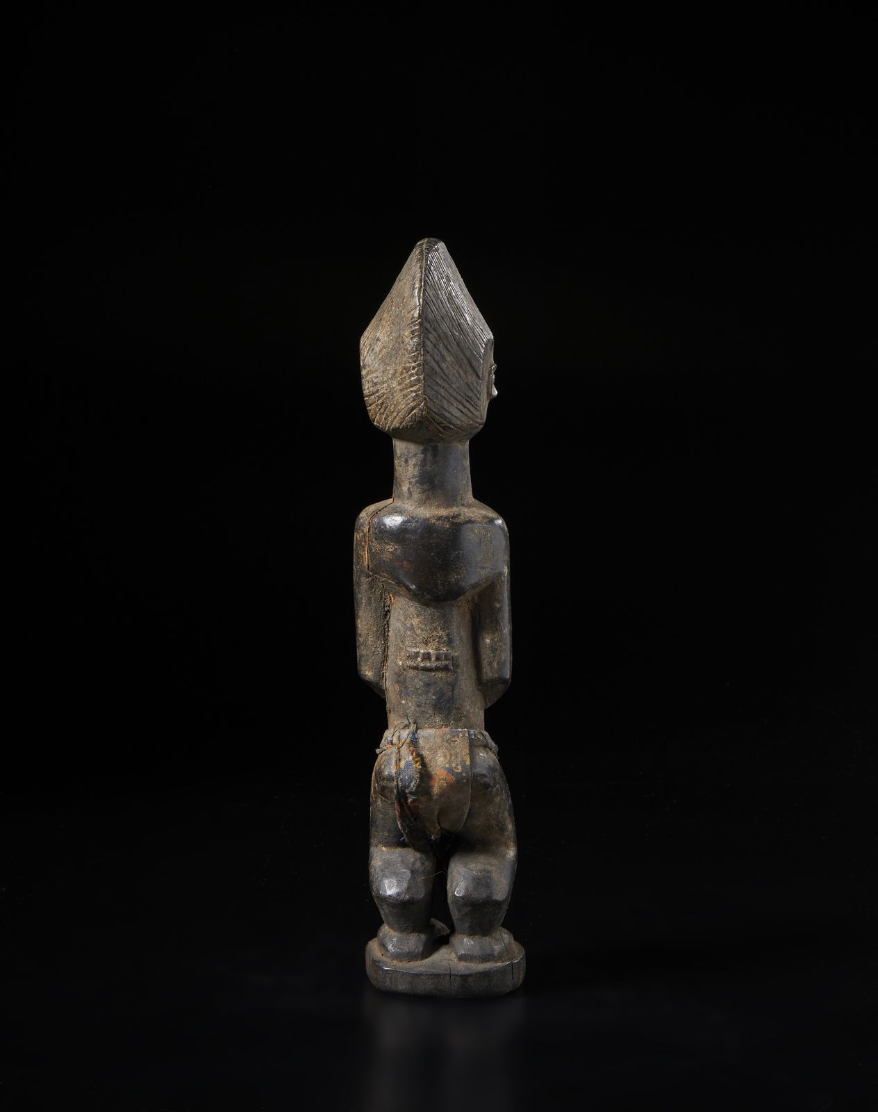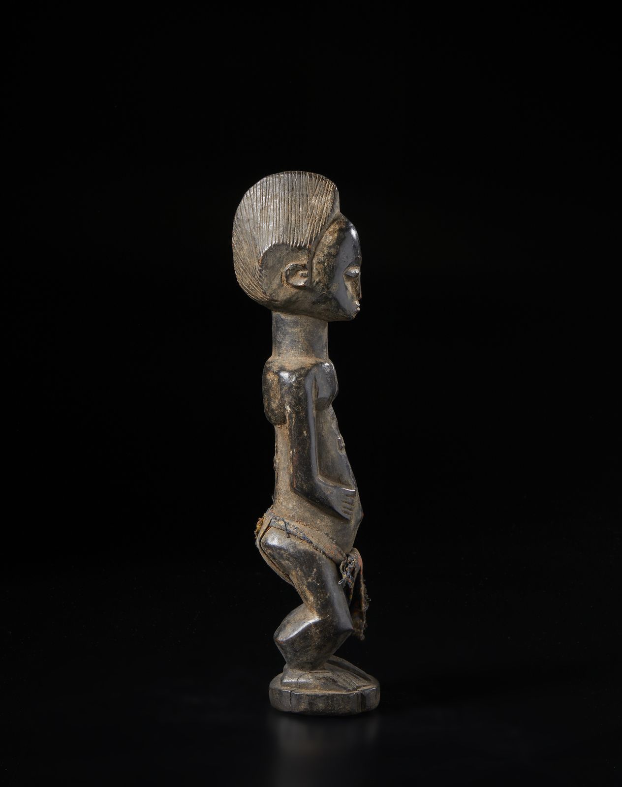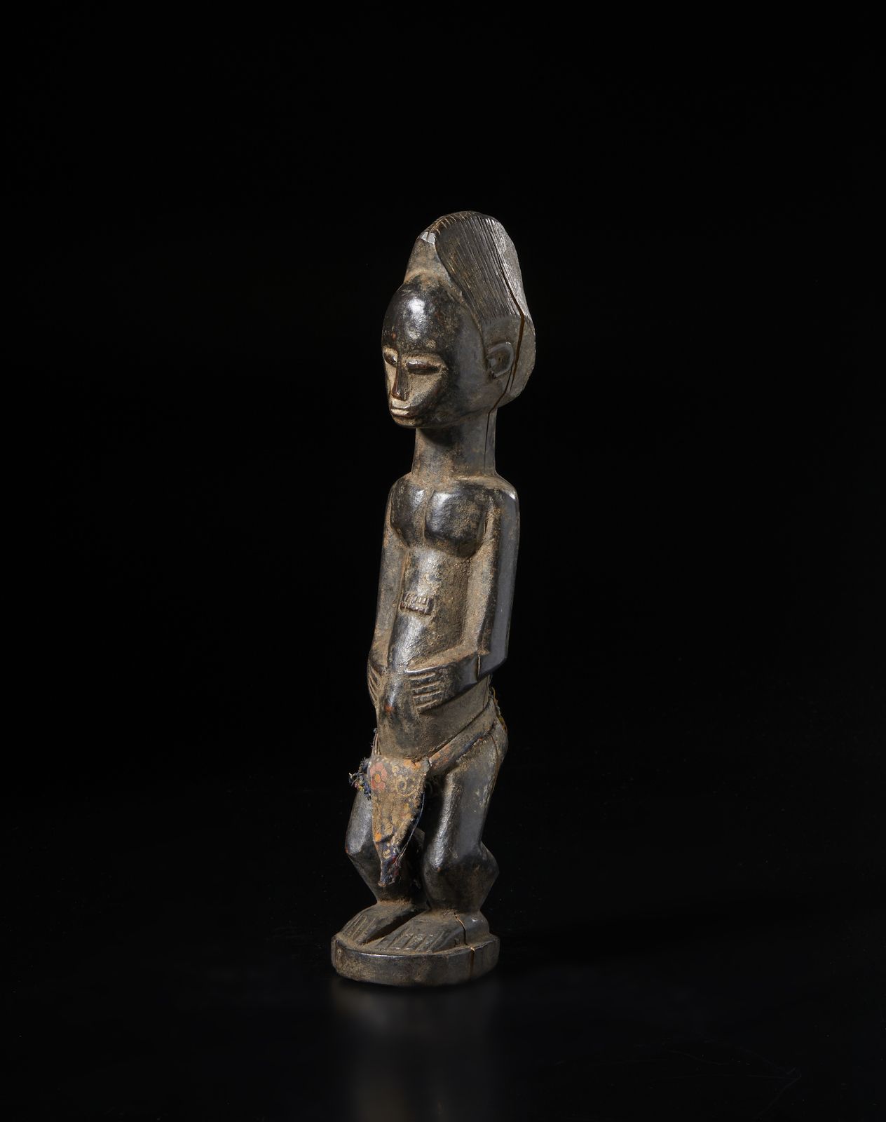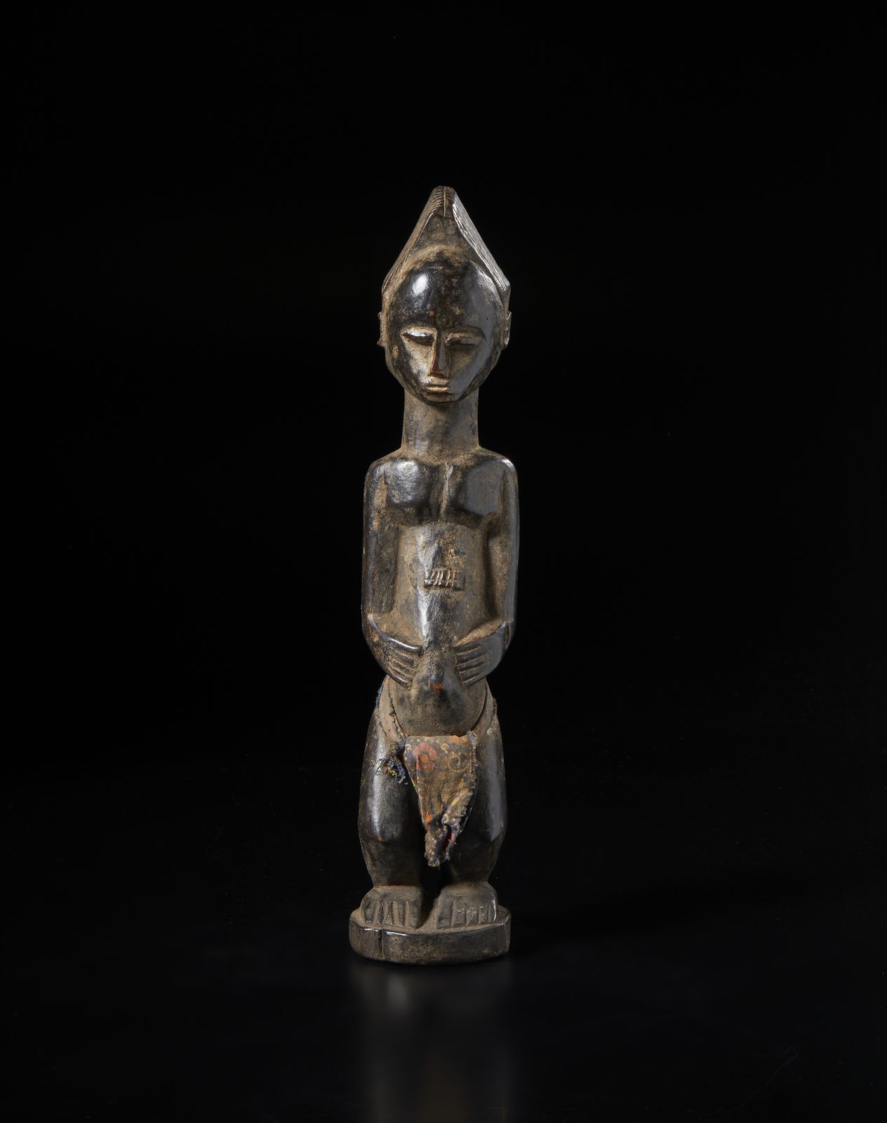 Scultura antropomorfa con mani sull'addome.Legno duro a patina scura e tessuto.