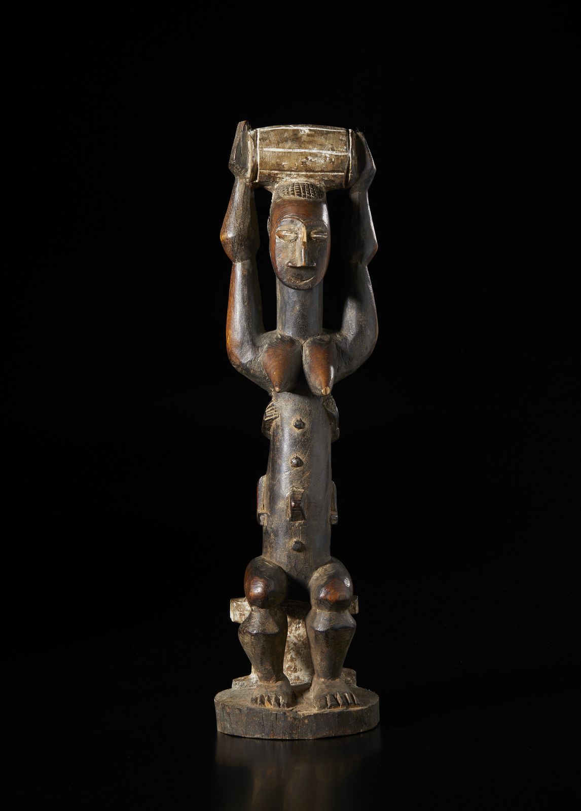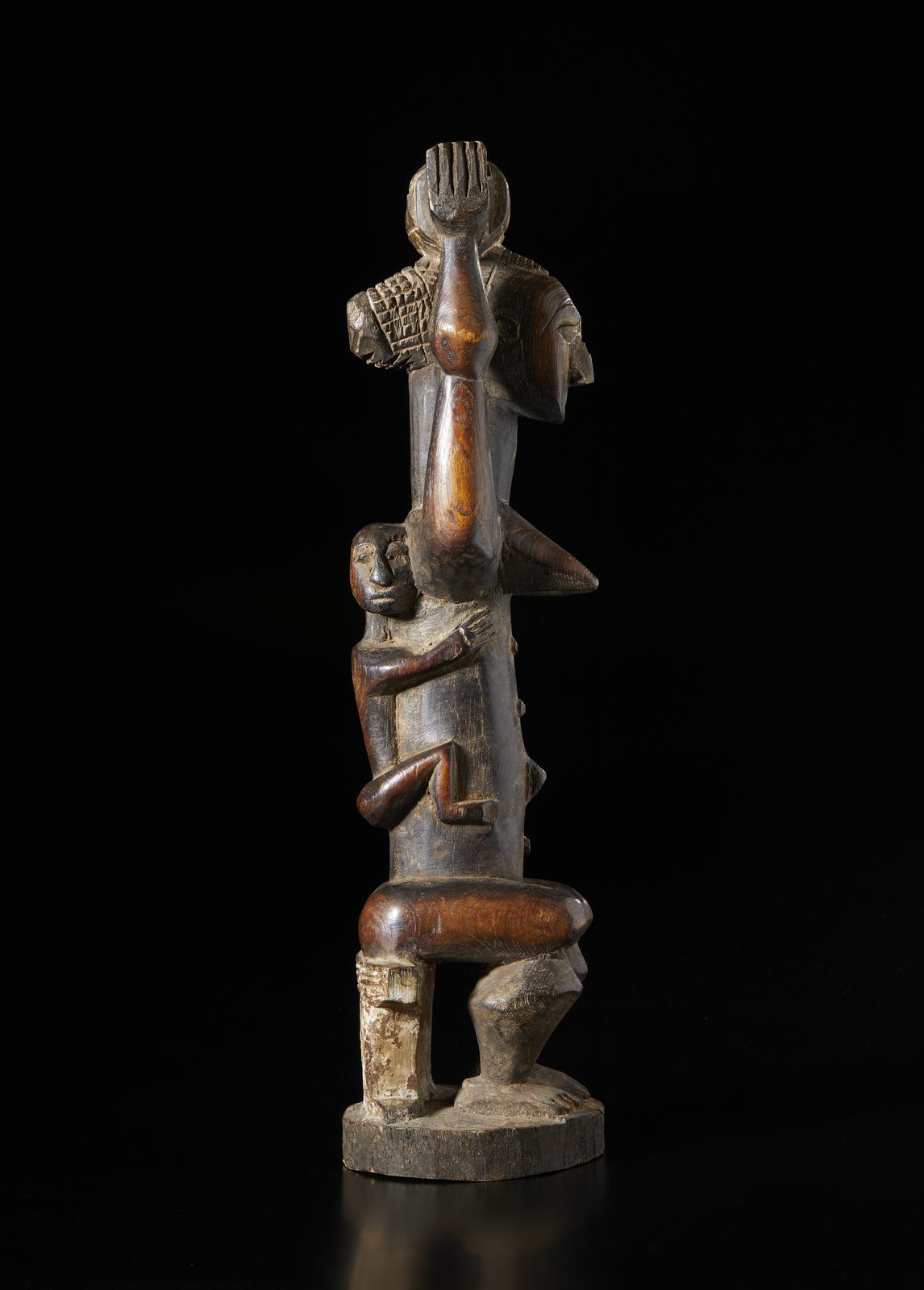 Scultura antropomorfa di figura femminile seduta con bambino sulla schiena.Legno [..]