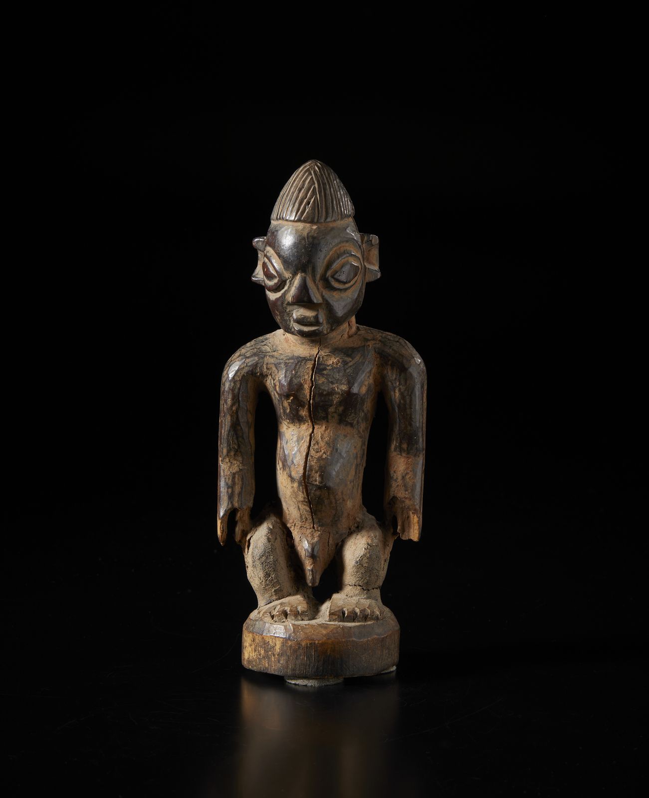 Scultura antropomorfa di gemello Ibeji singolo. Legno a patina scura.