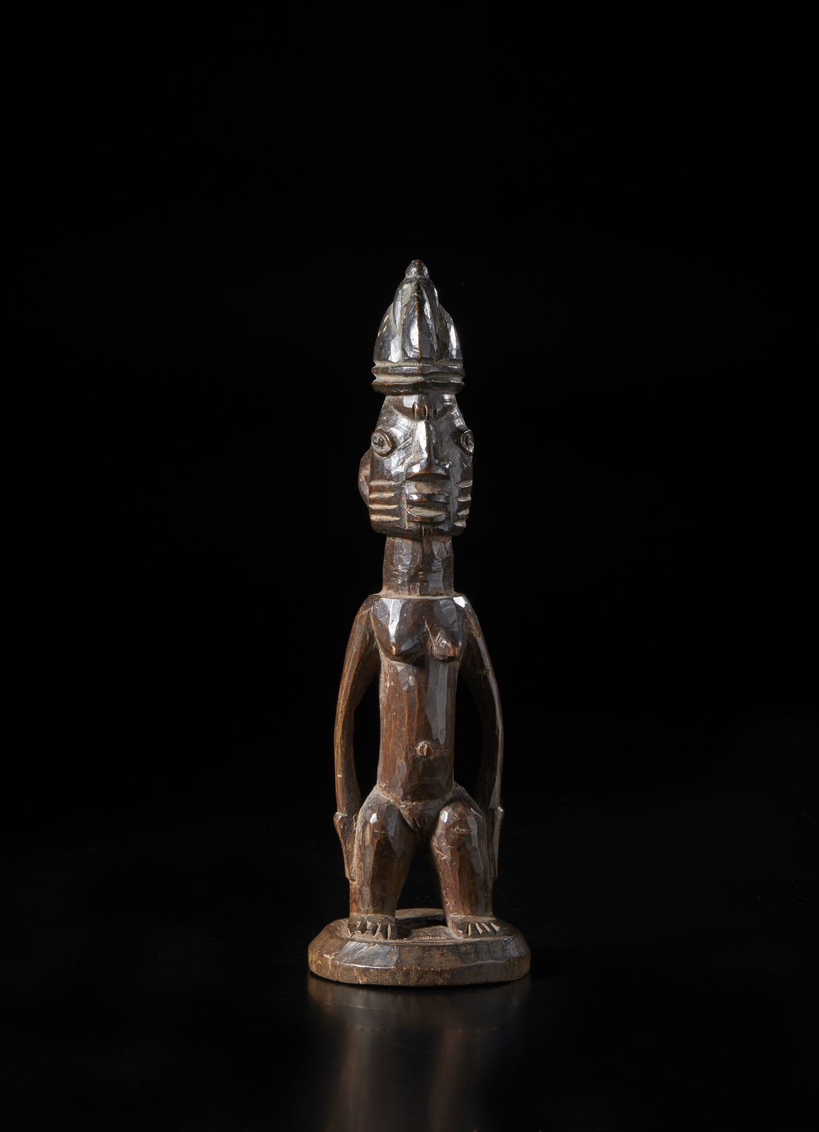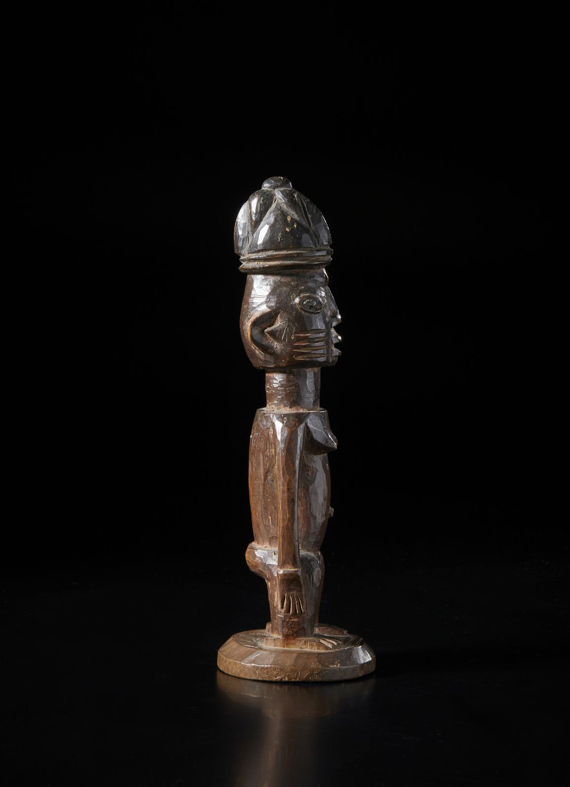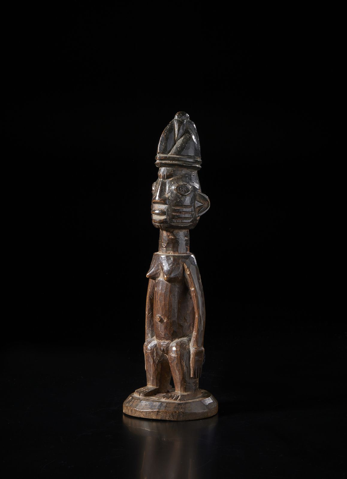 Scultura antropomorfa di gemello singolo ibeji. Legno duro a patina scura.