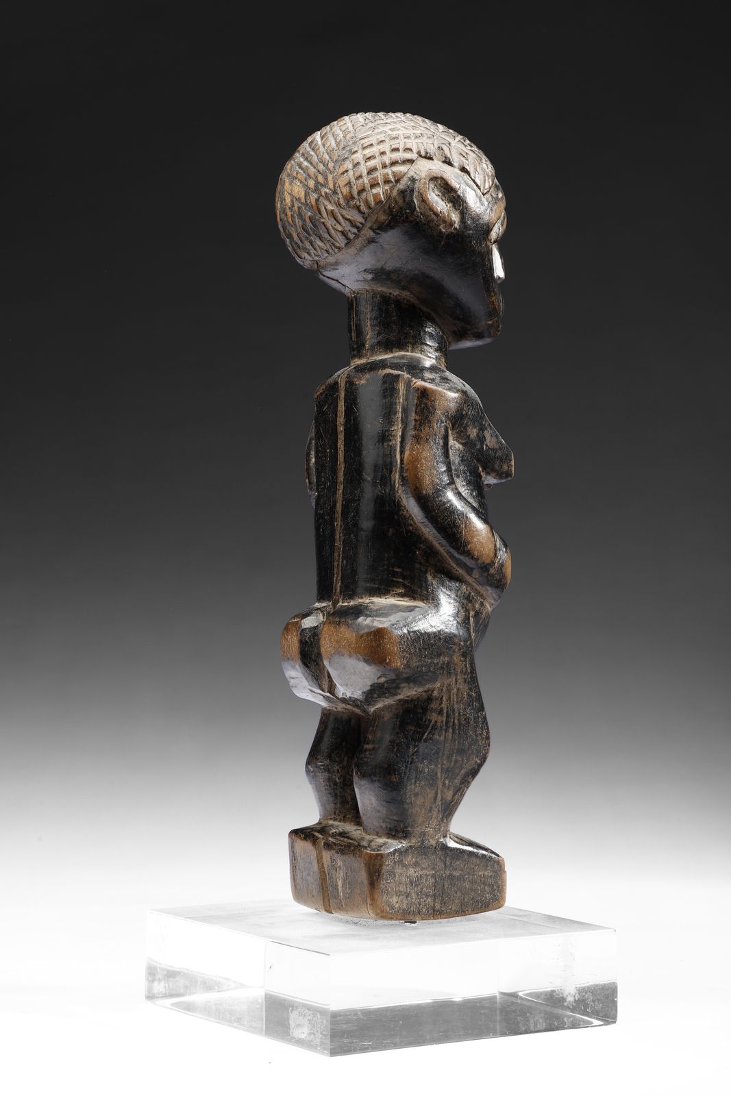 Scultura antropomorfa femminile Ashanti o Fanti. Legno duro a patina nera.