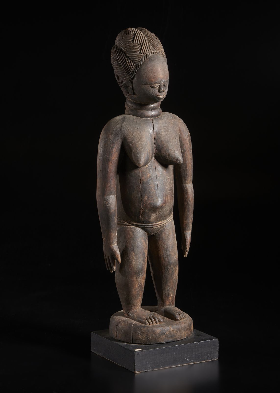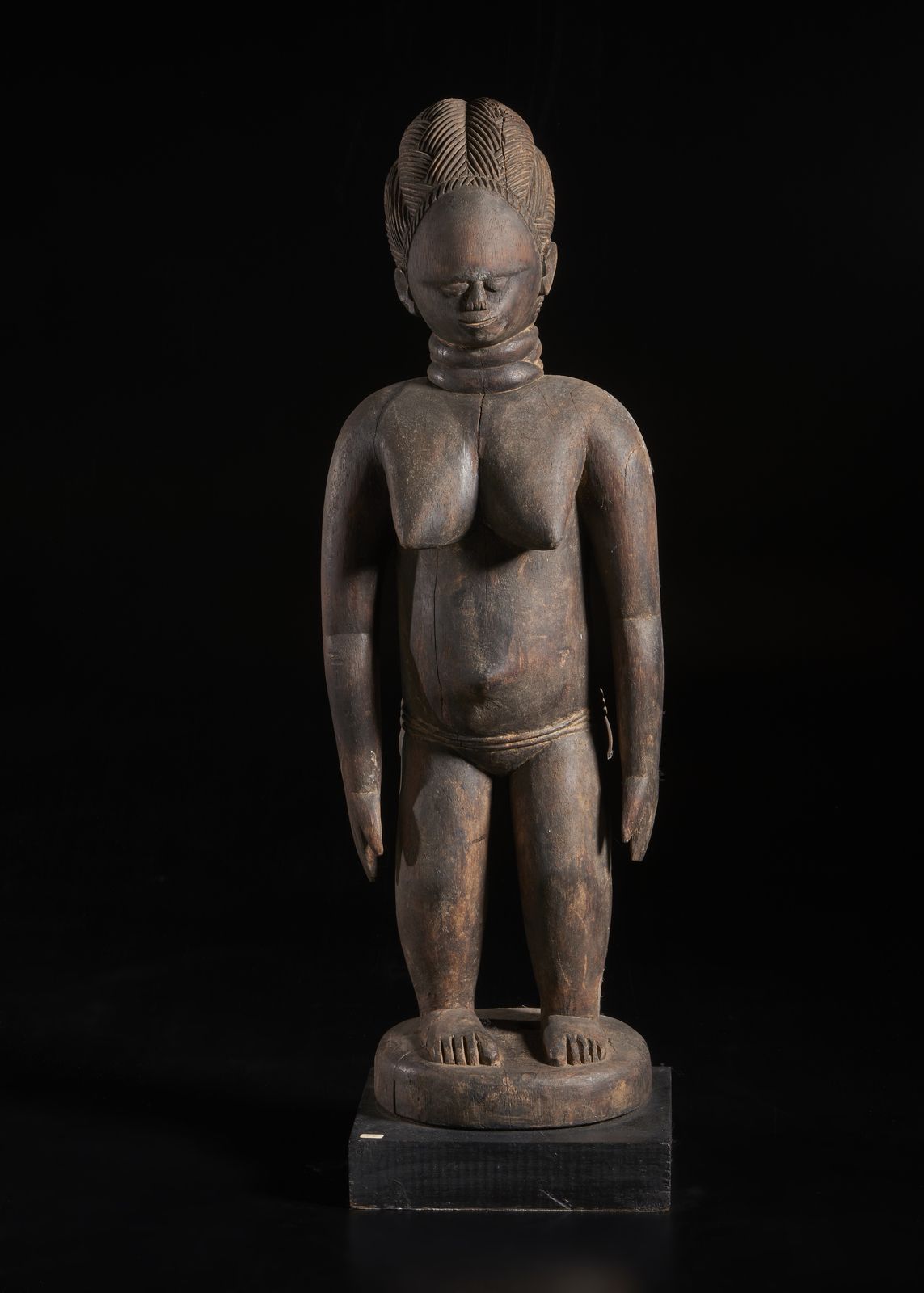 Scultura antropomorfa femminile.Legno a patina bruna.