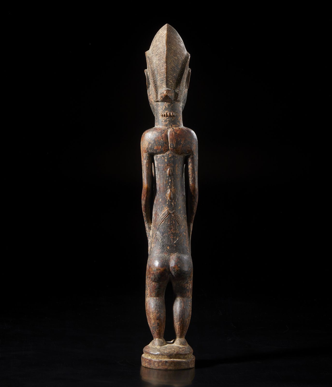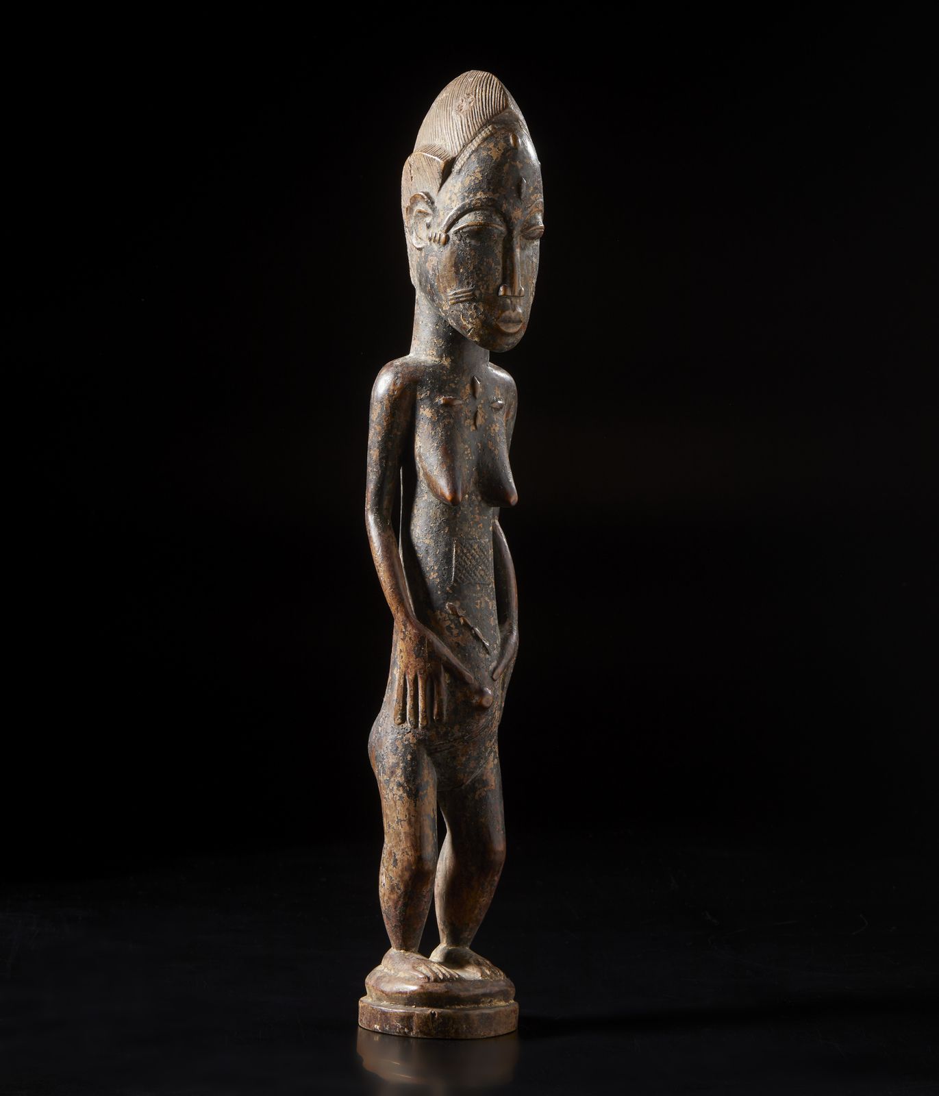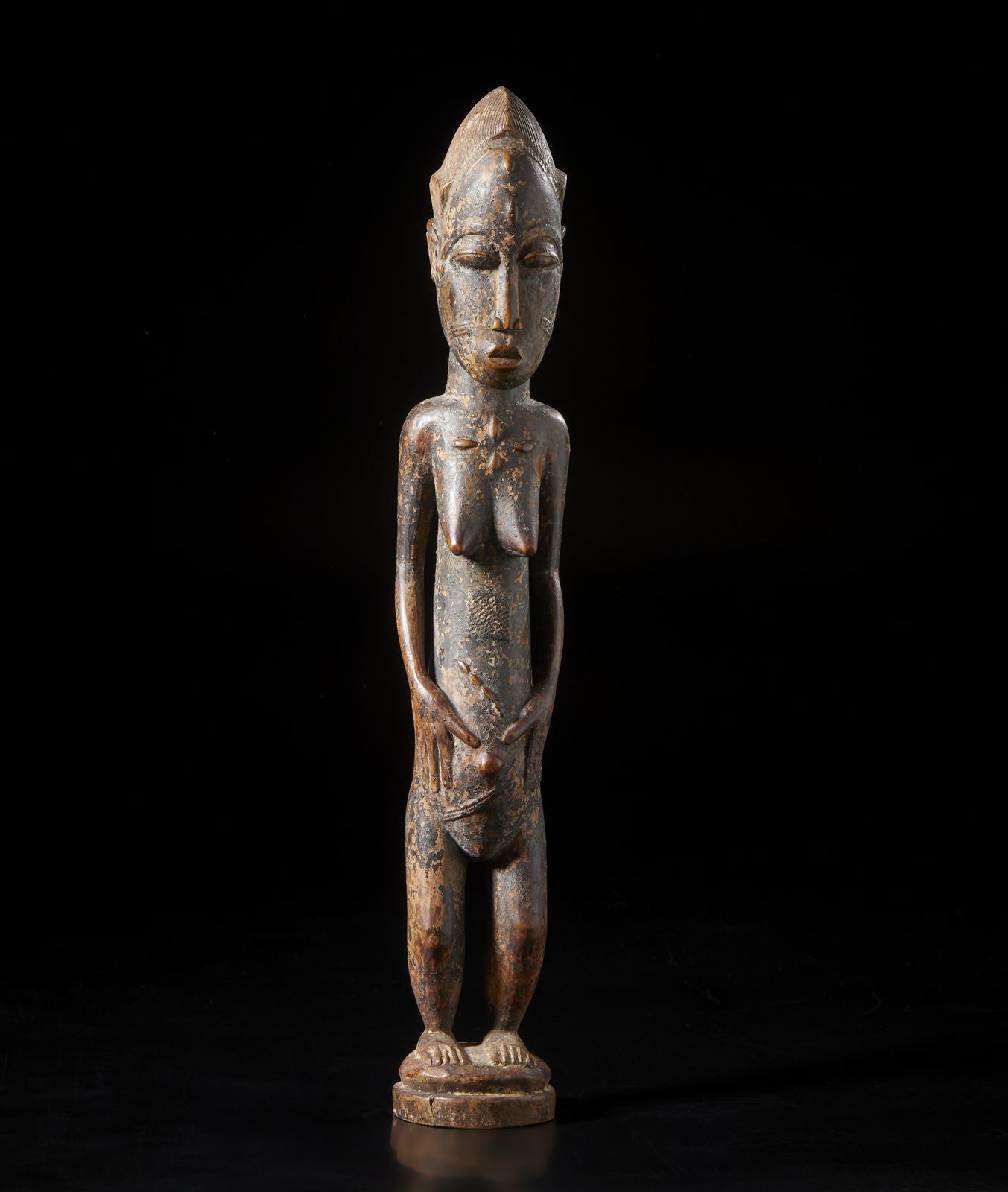 Scultura antropomorfa femminile. Legno duro a patina scura.