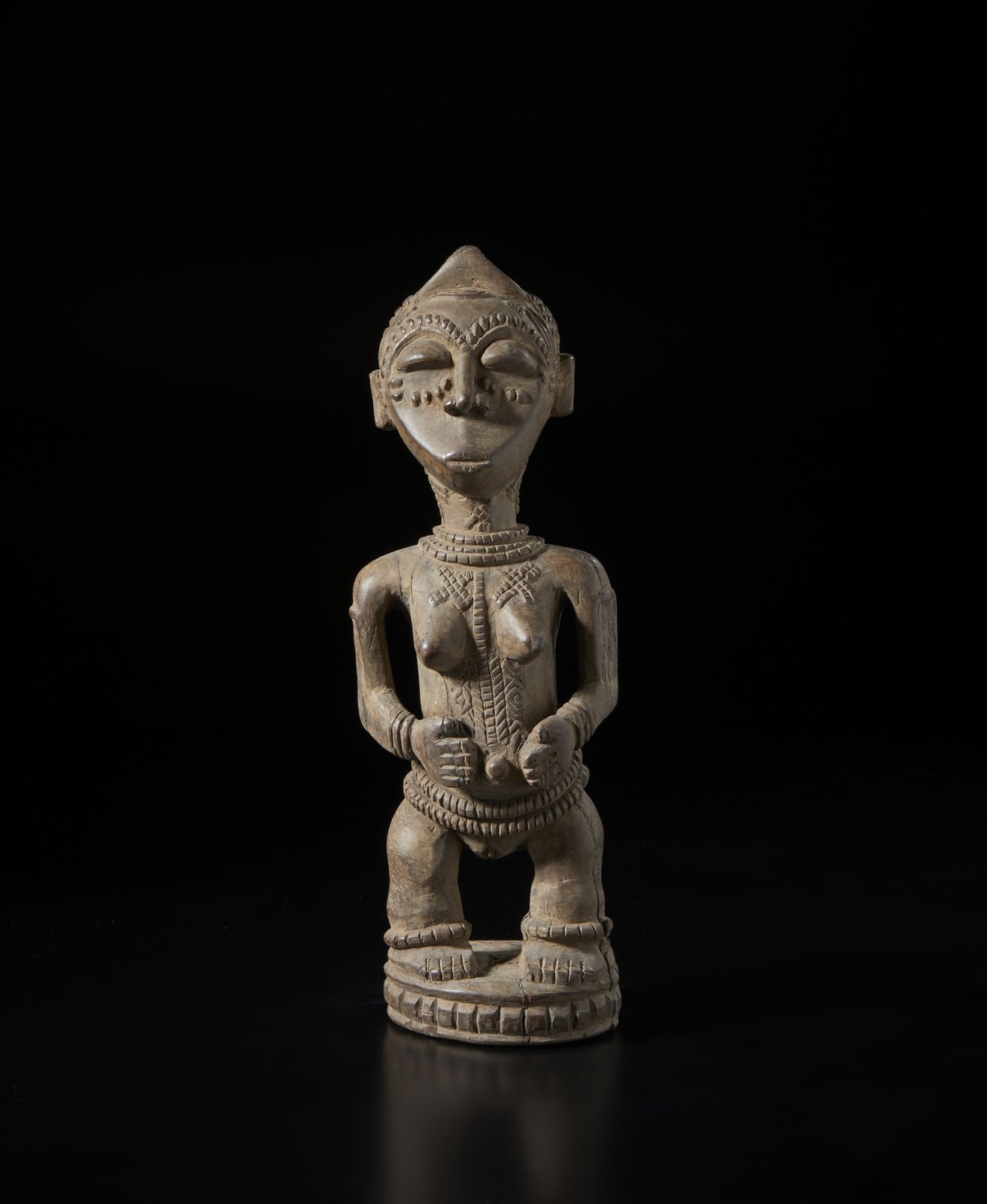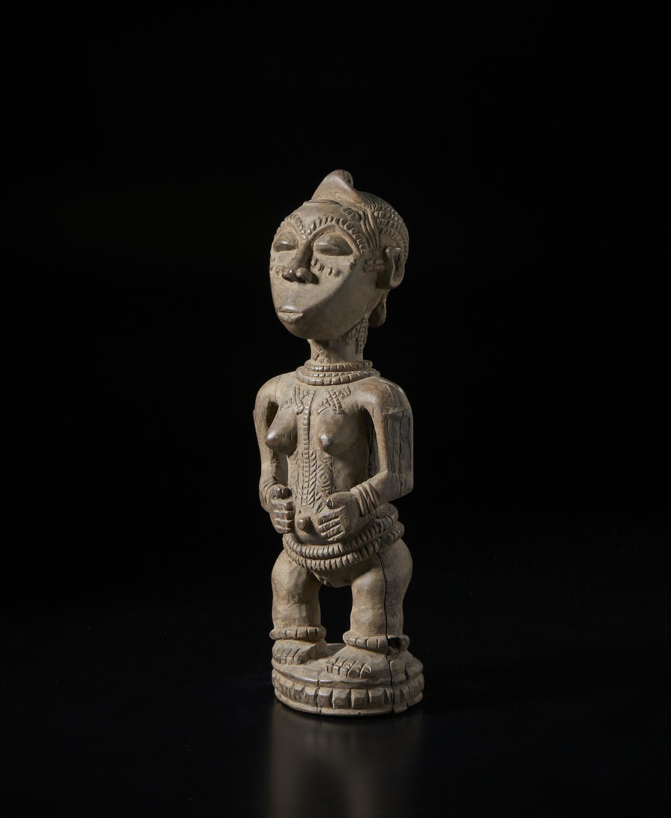 Scultura antropomorfa femminile. Legno duro con patina bruna.
