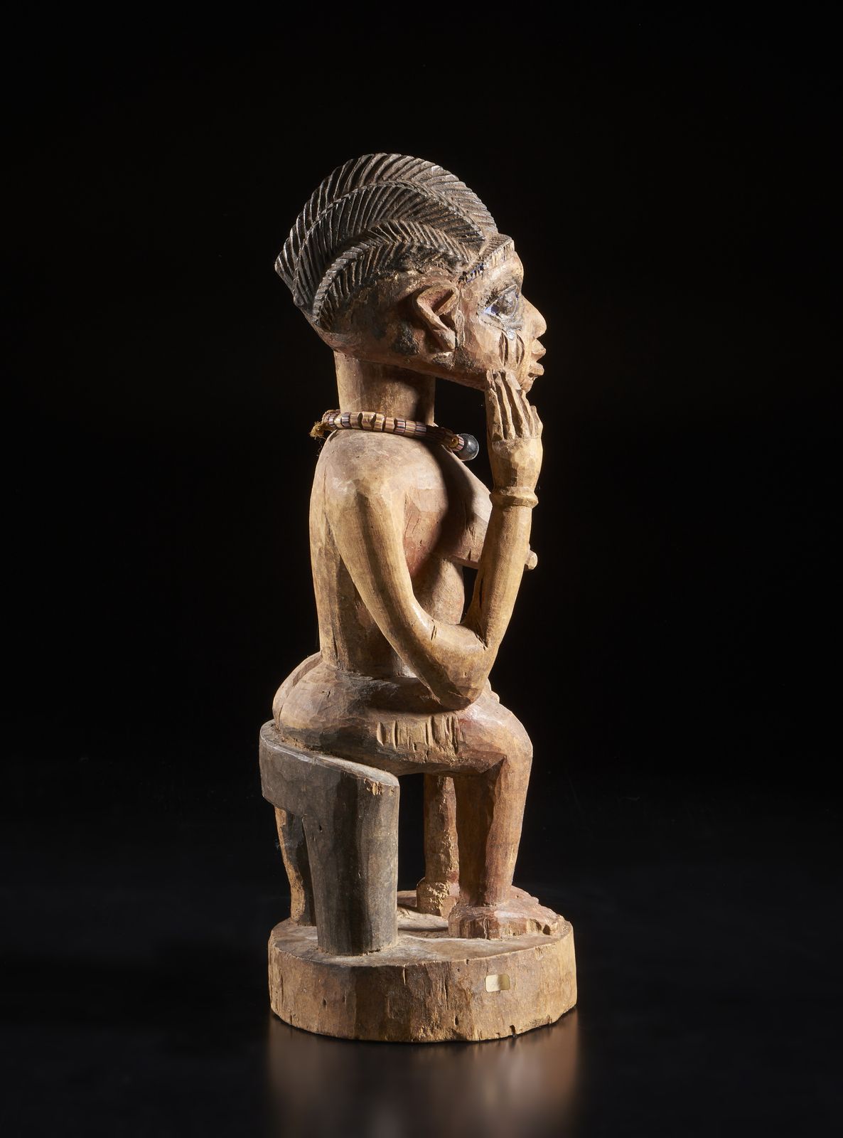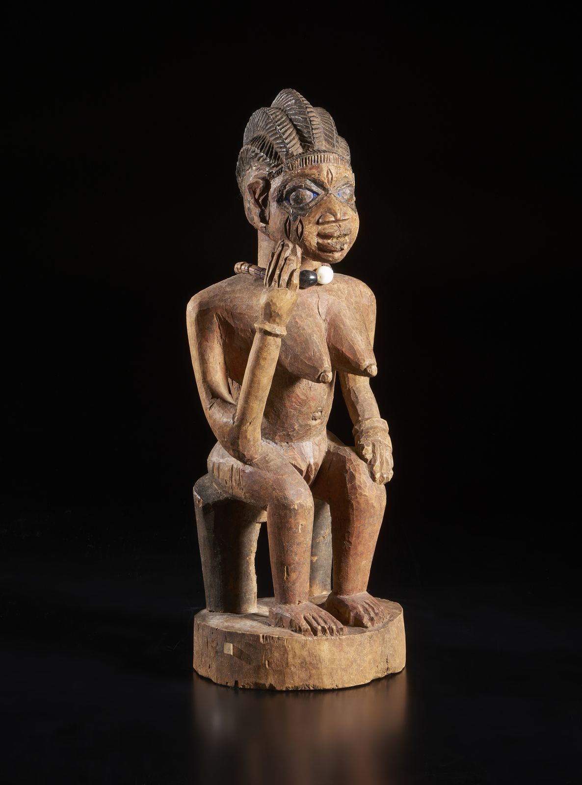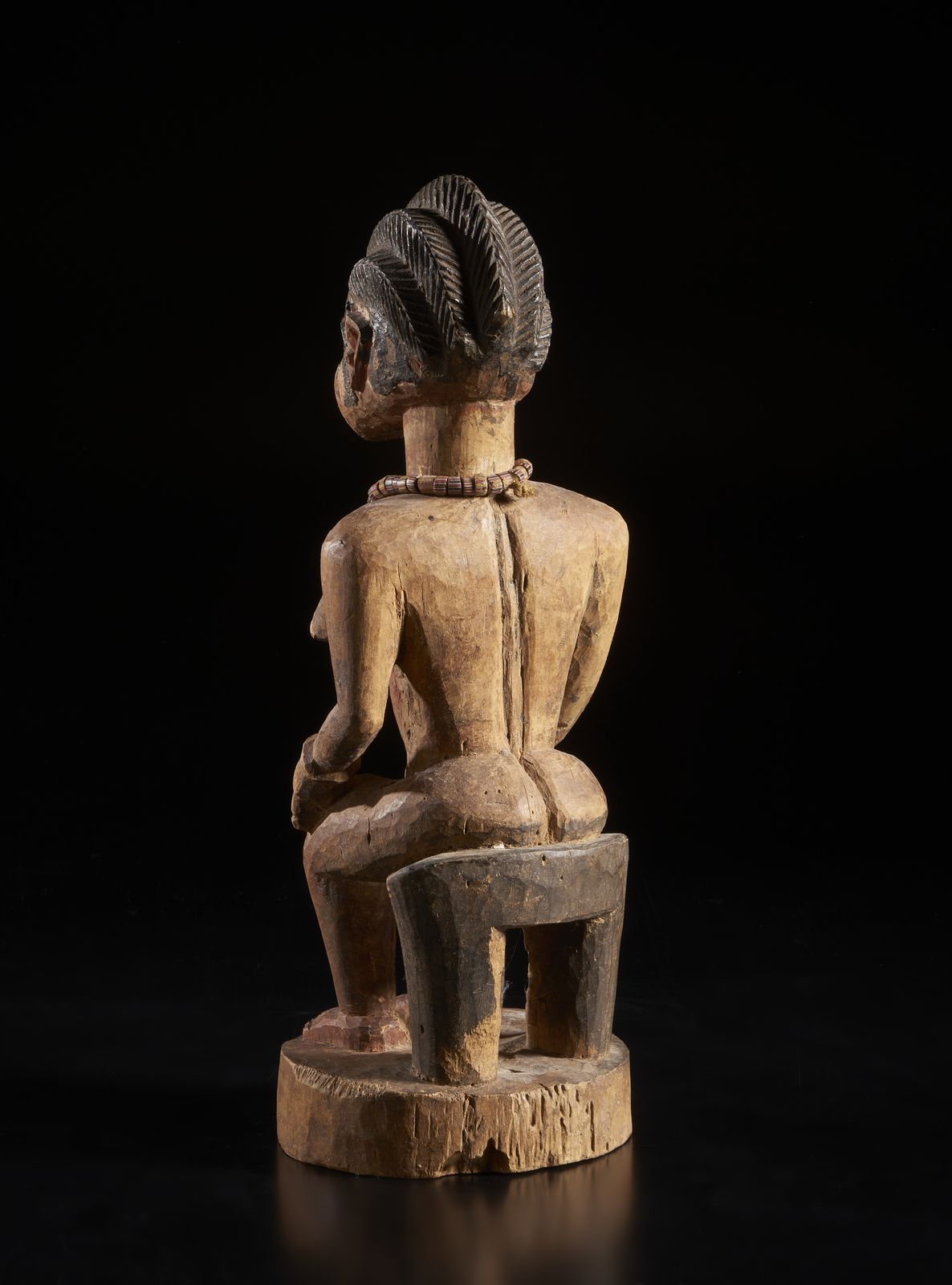 Scultura antropomorfa femminile seduta su seggio. Legno a patina naturale, pigmenti [..]