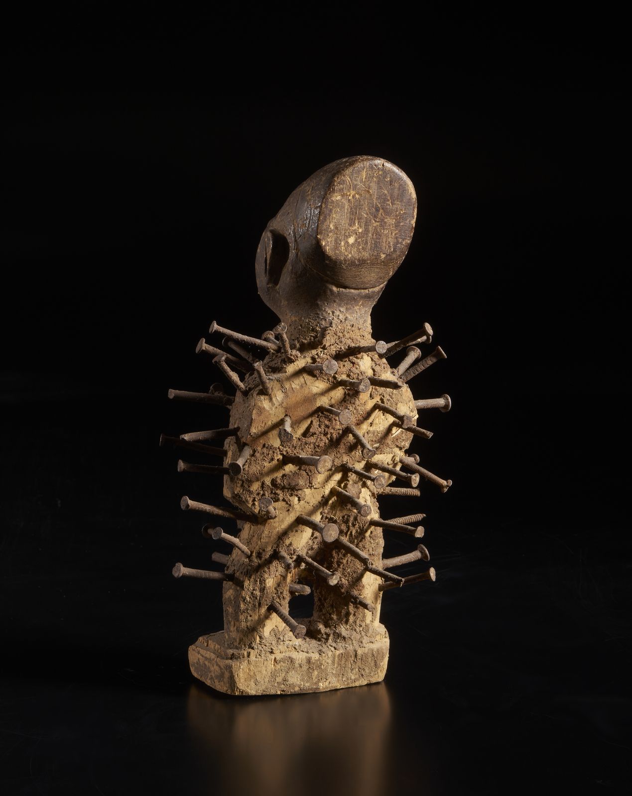 Scultura antropomorfa in forma di feticcio Nkisi Nkonde. Legno a patina bruna terrosa [..]