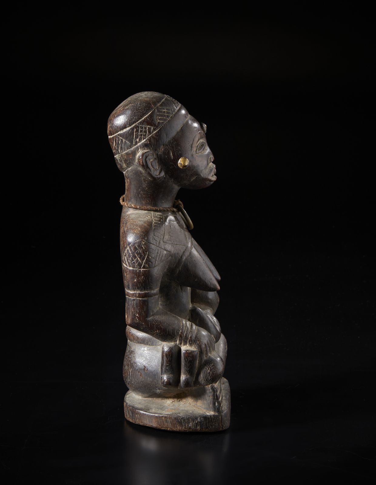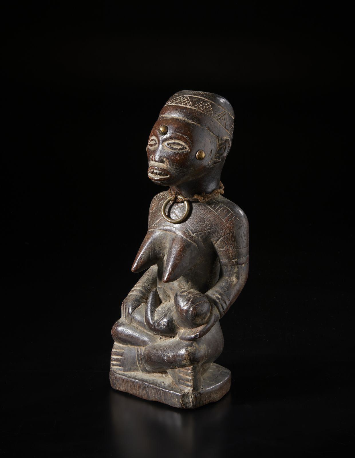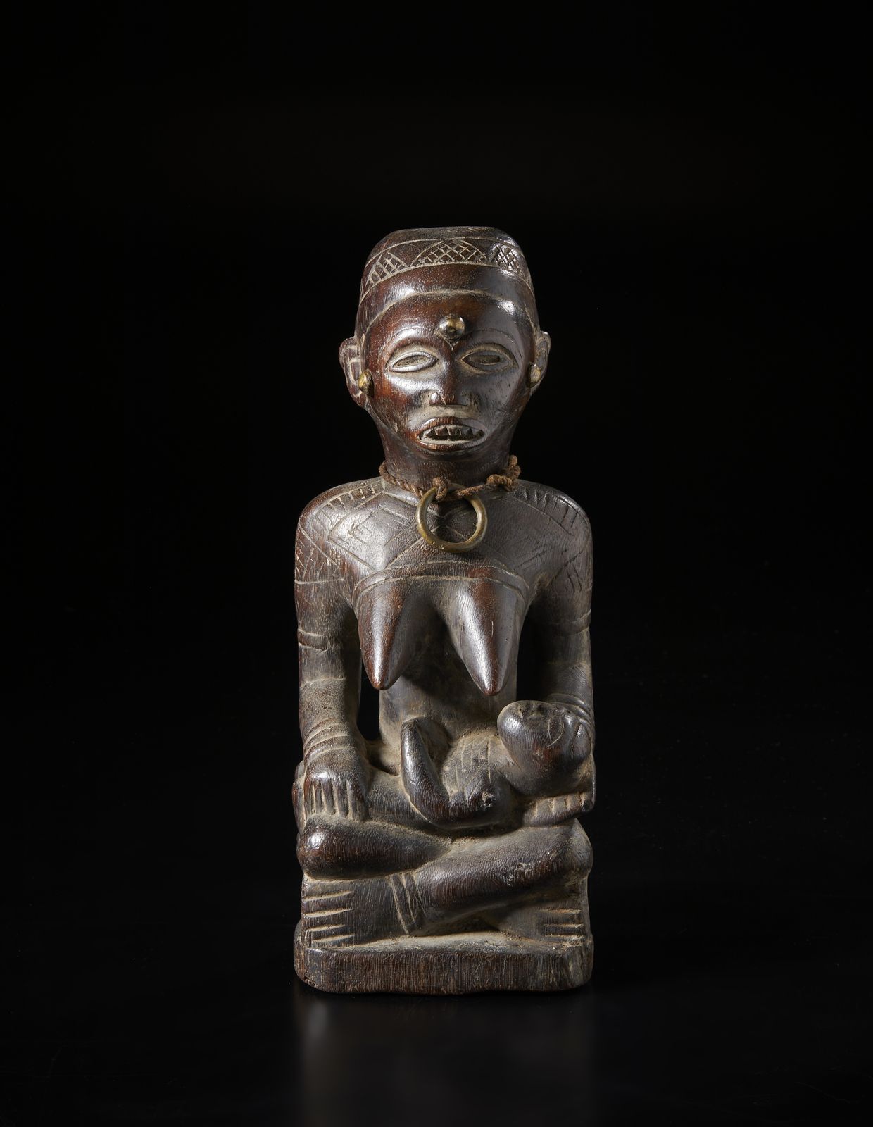 Scultura antropomorfa in forma di maternità Legno duro a patina scura, fibre e m [..]