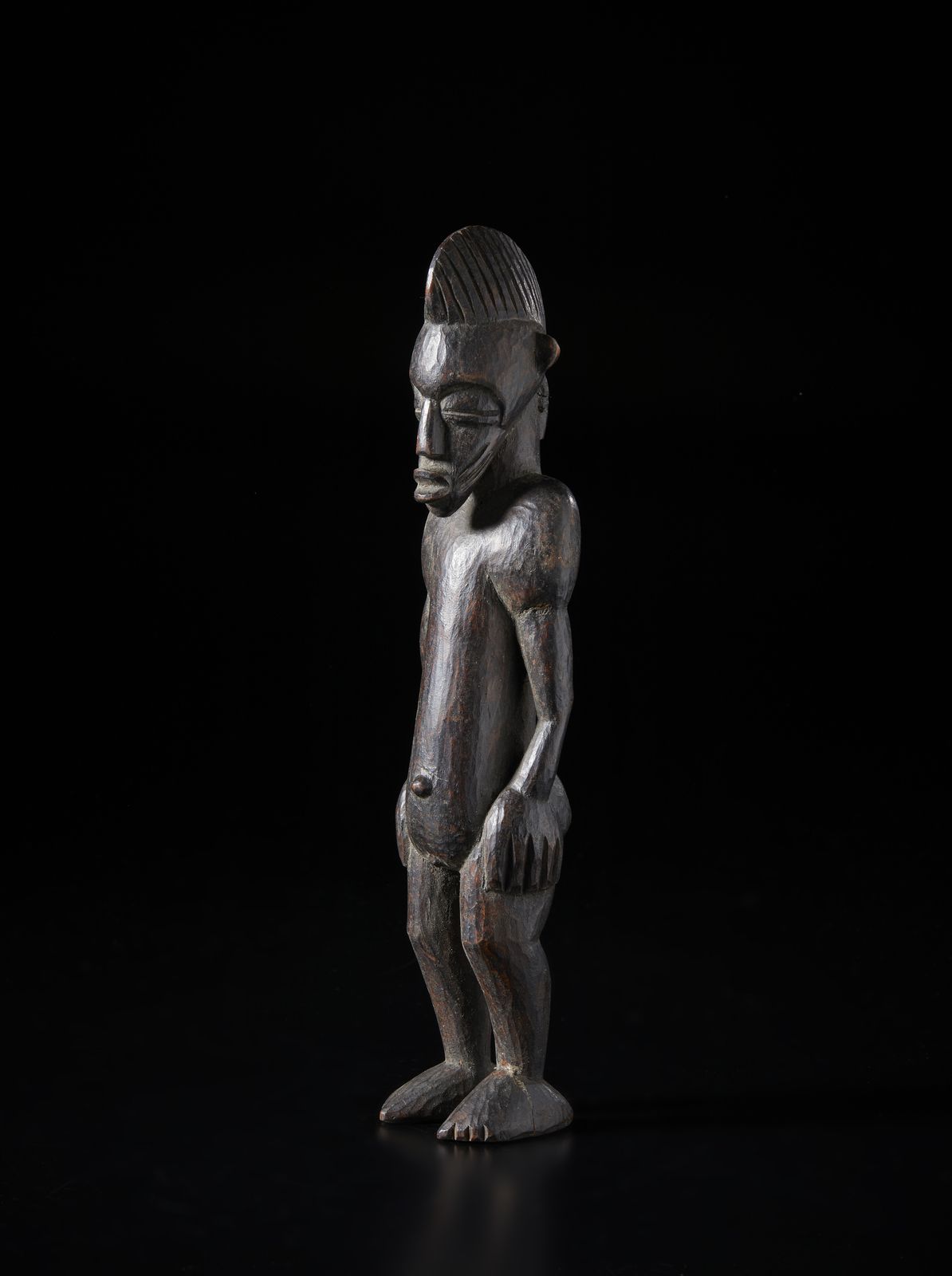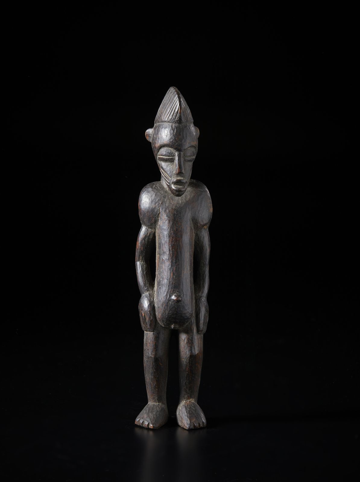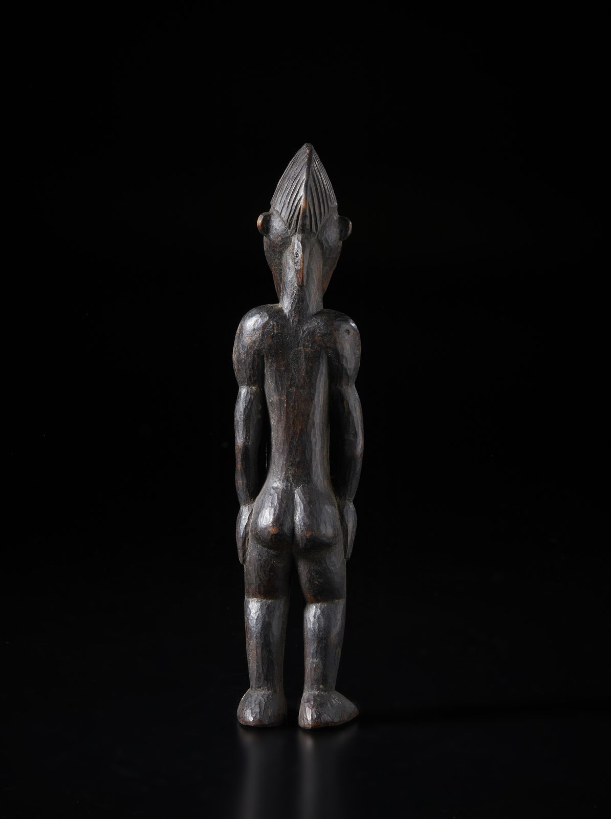 Scultura antropomorfa in posizione eretta.Legno a patina scura.