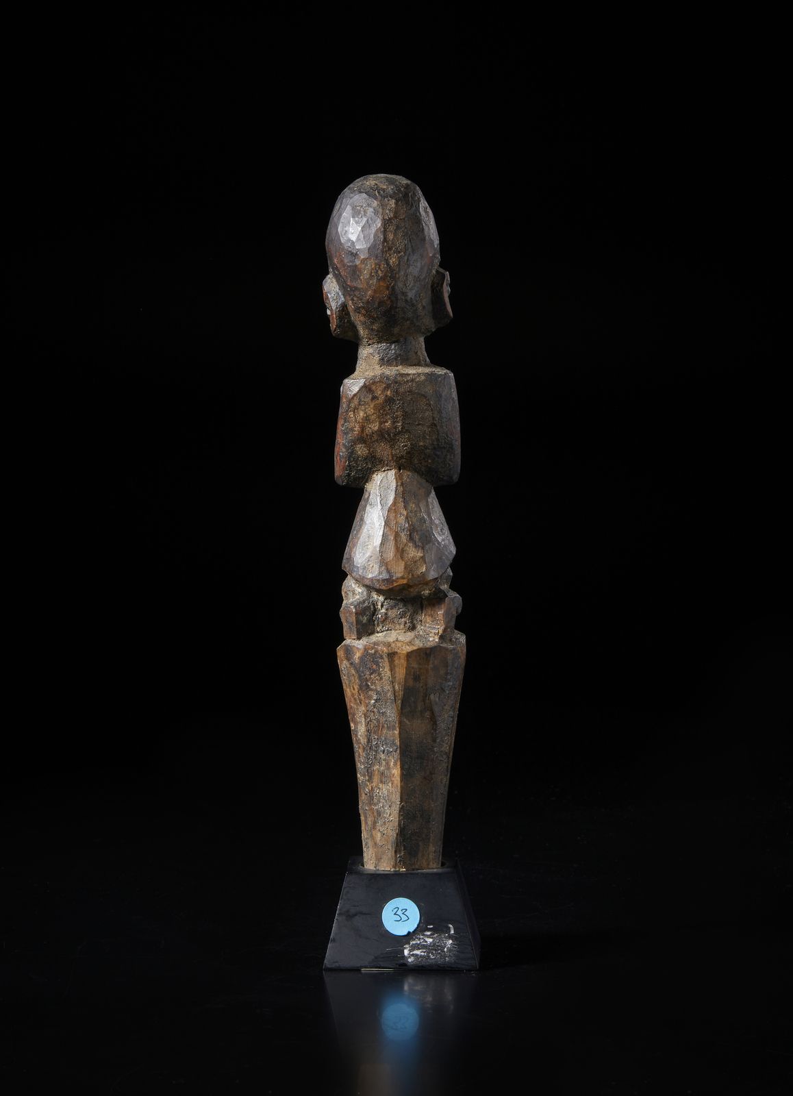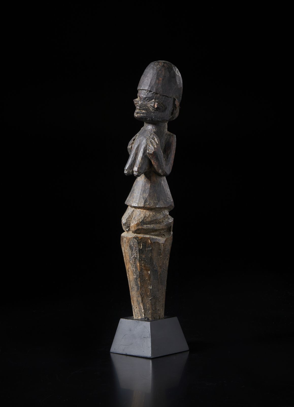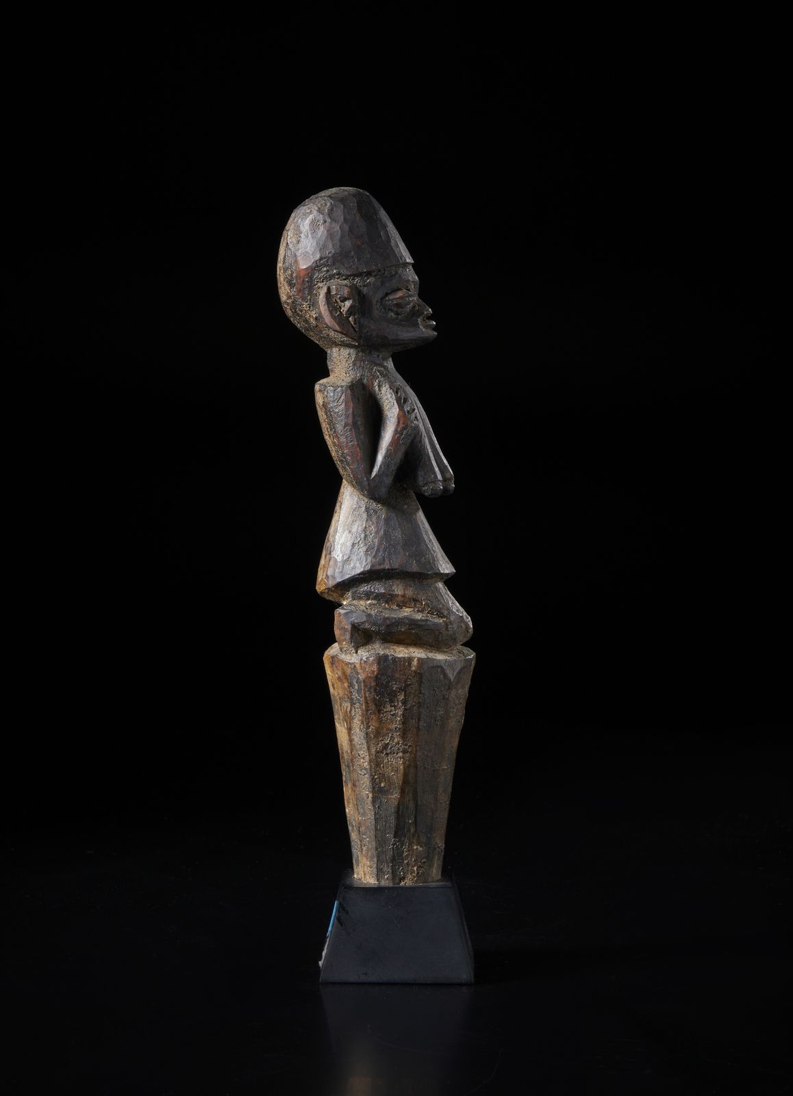 Scultura antropomorfa inginocchiata su sommità di bastone. Legno duro a patina s [..]
